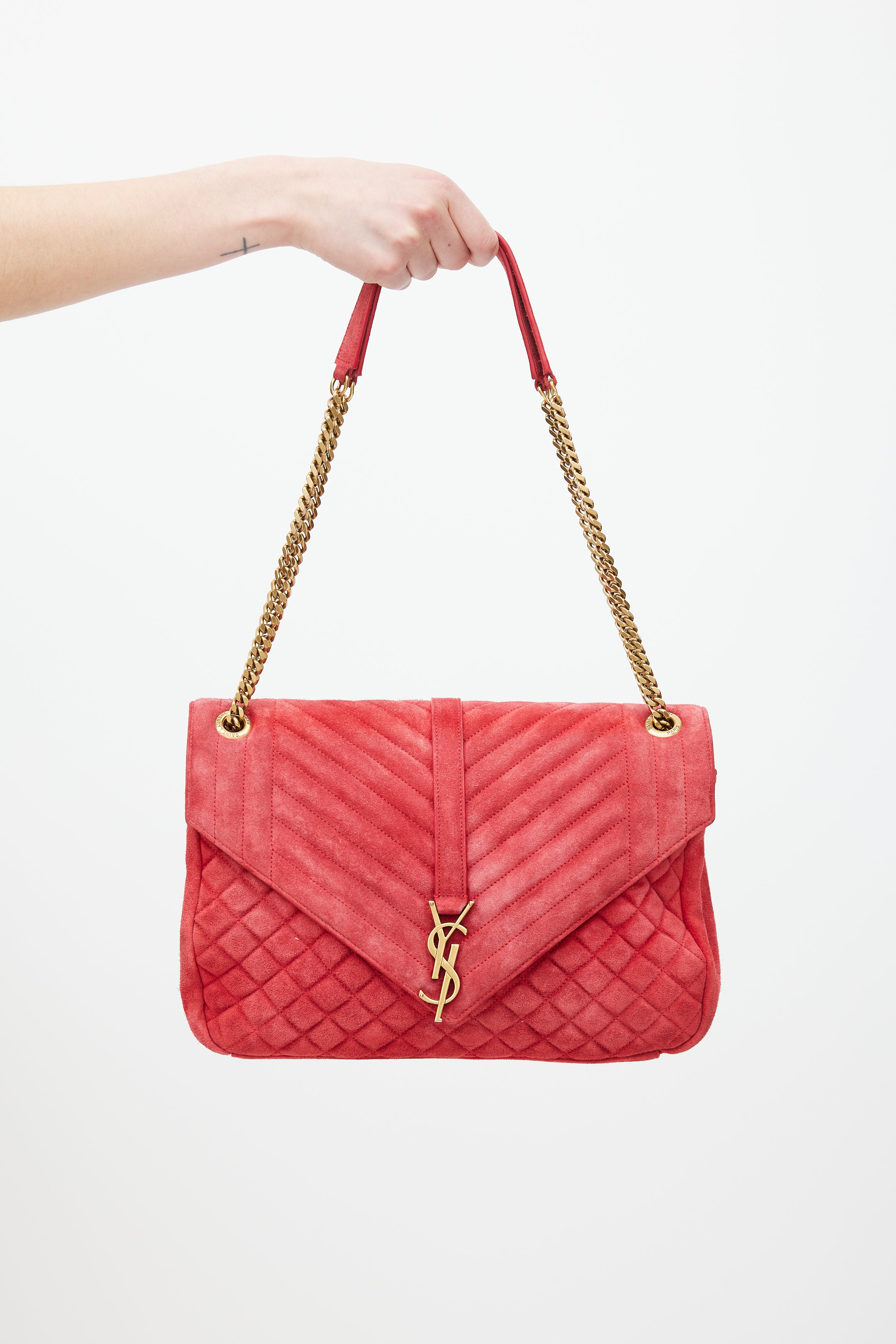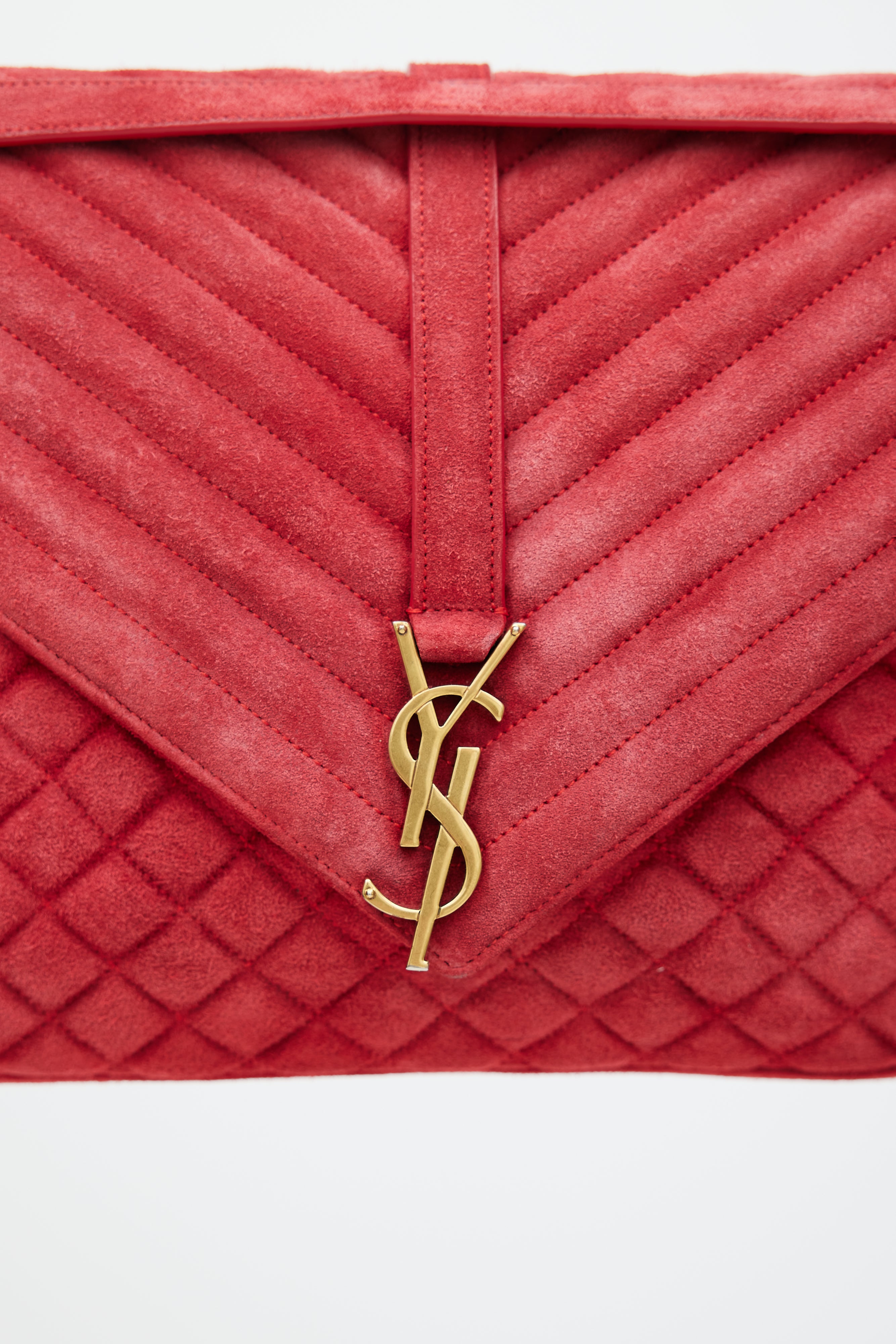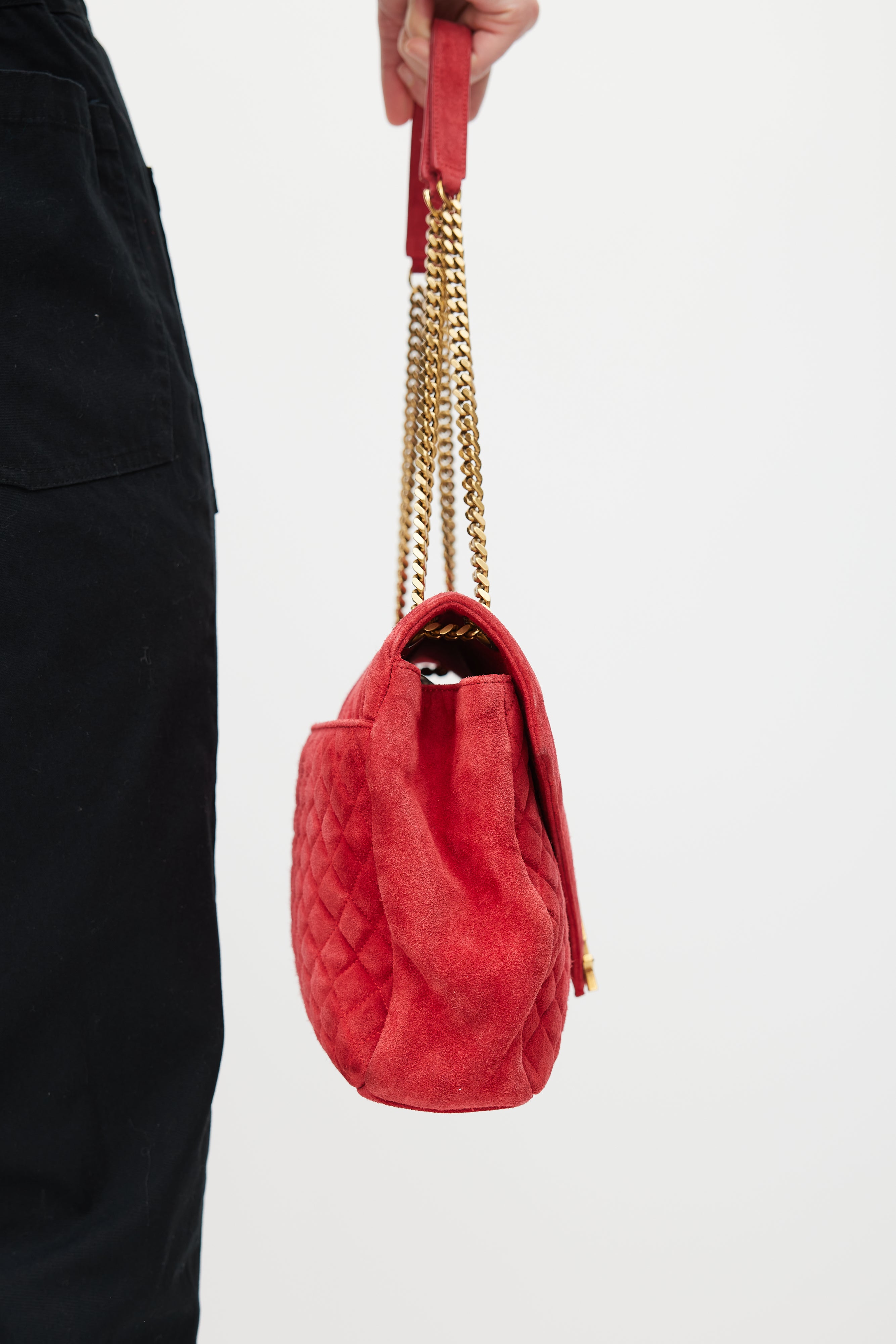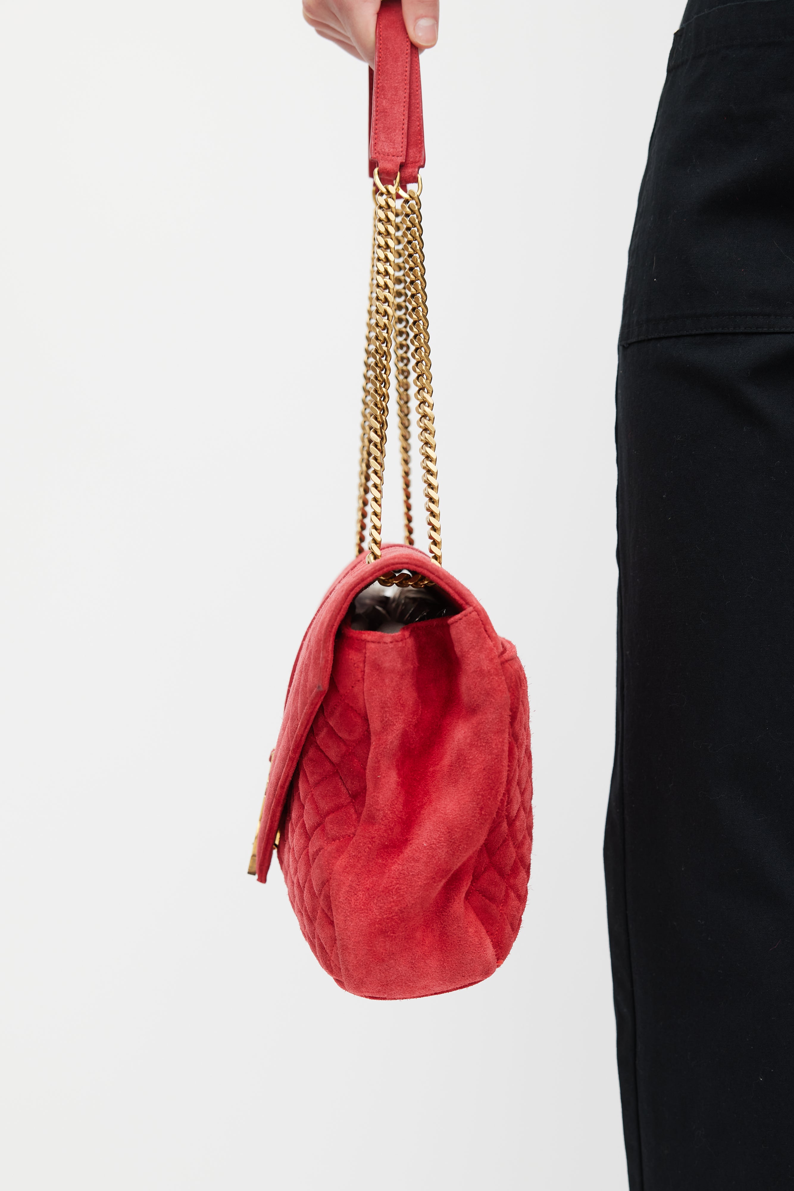 Pre-owned Saint Laurent red Triquilt suede bag featuring a top flap, quilted detailing, two main compartments with one slip pocket, interior zip pouch, one slip pocket at back, chain link shoulder strap, and gold tone Cassandre magnetic closure.