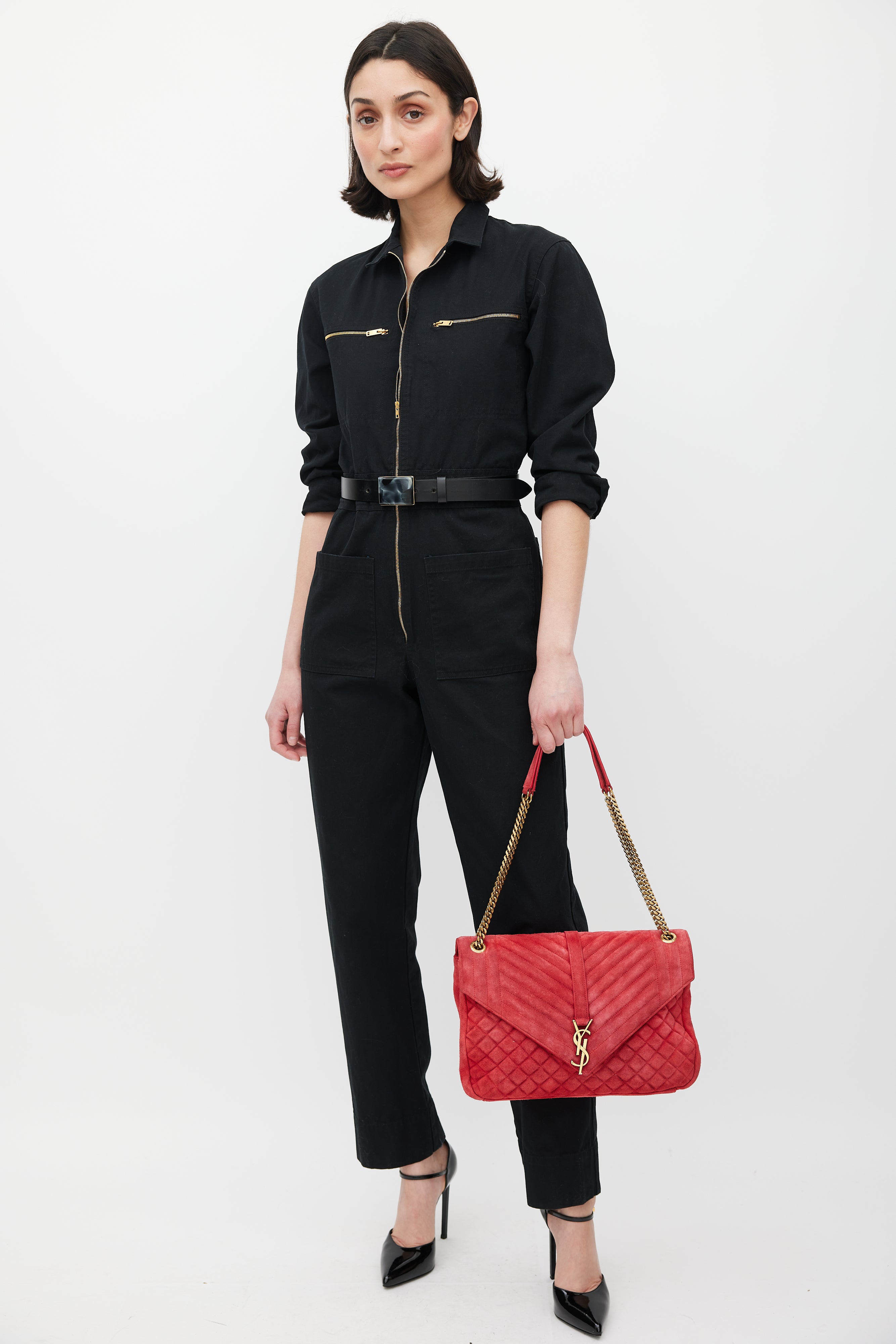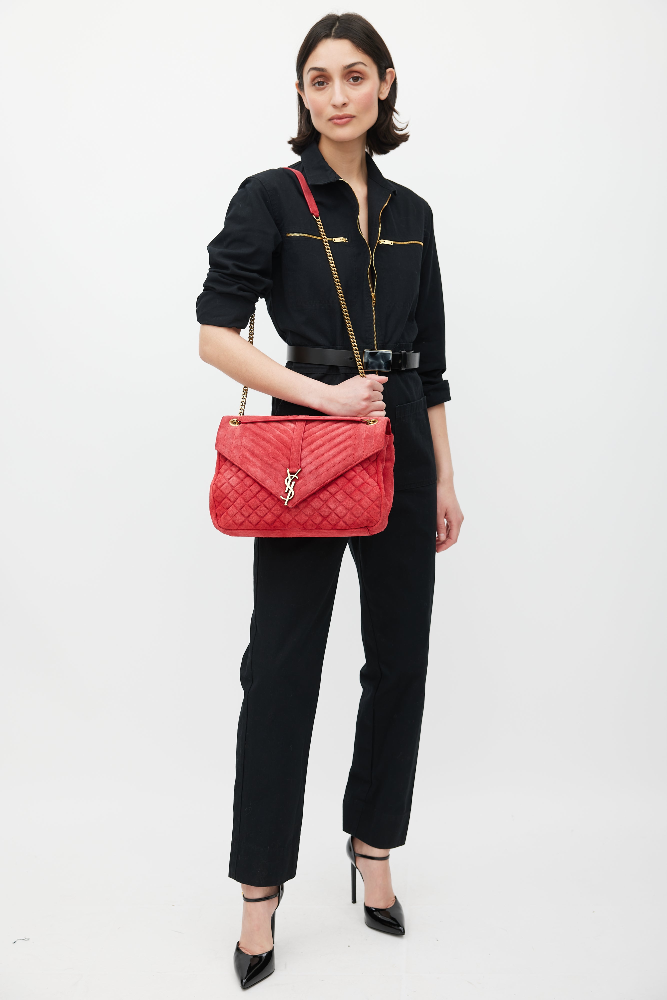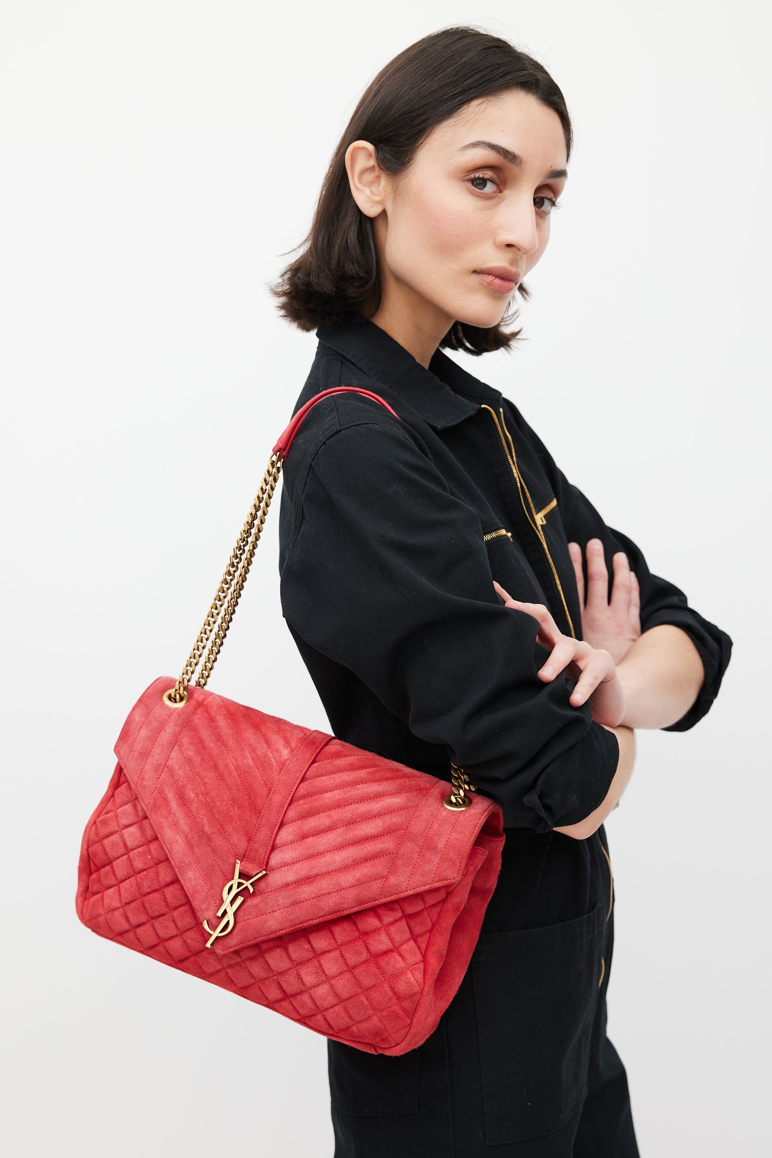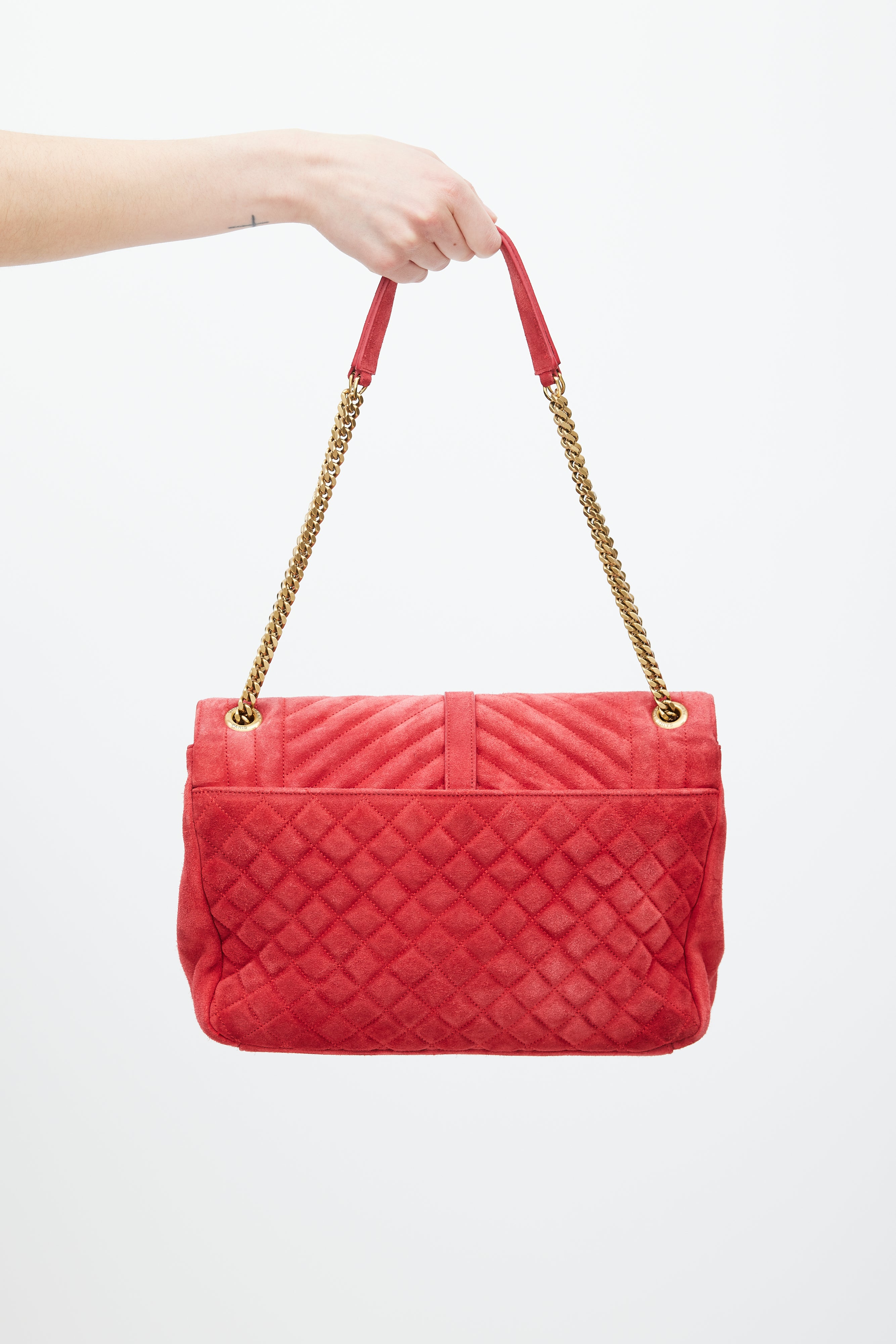 Pre-owned Saint Laurent red Triquilt suede bag featuring a top flap, quilted detailing, two main compartments with one slip pocket, interior zip pouch, one slip pocket at back, chain link shoulder strap, and gold tone Cassandre magnetic closure.