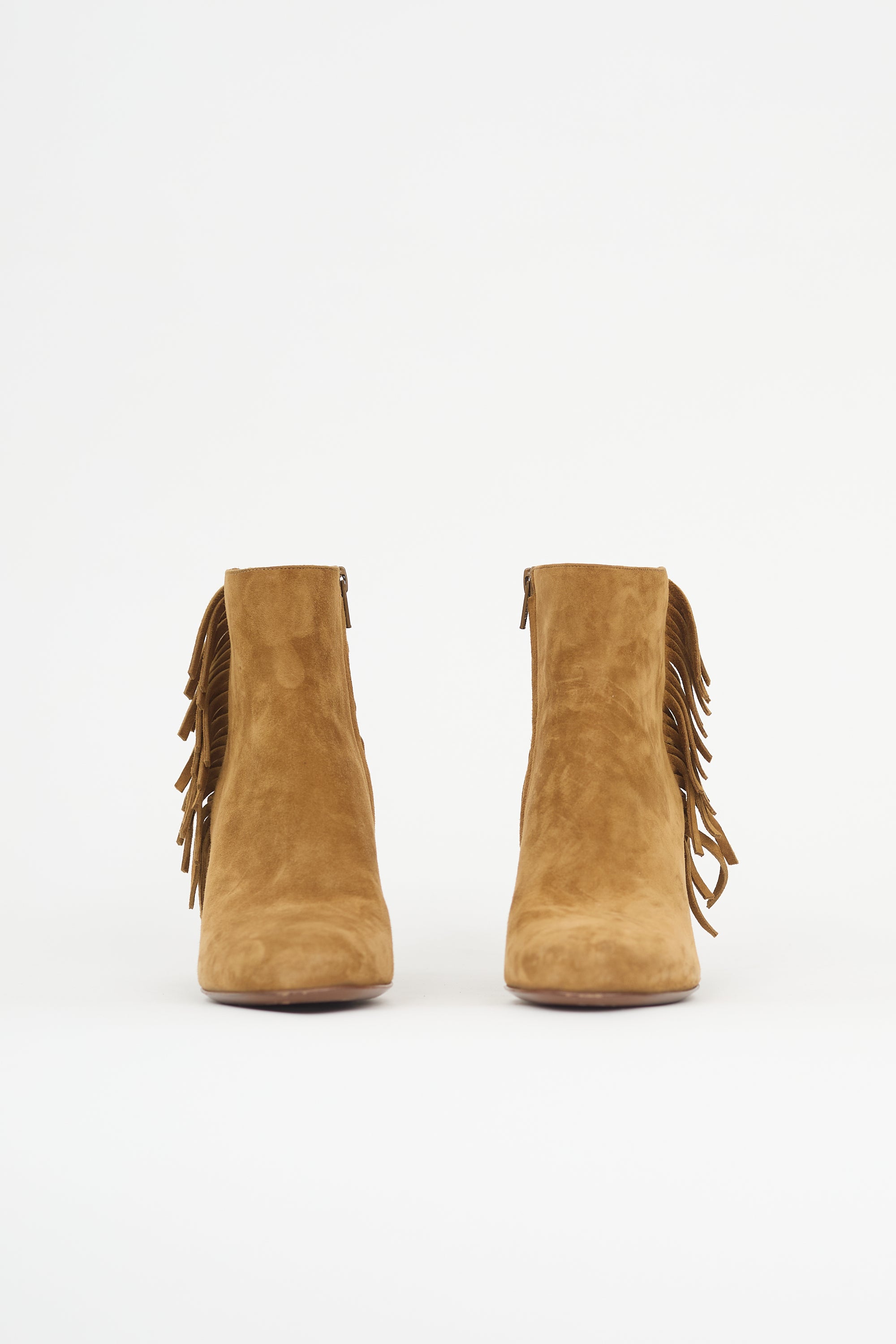 Pre-owned Saint Laurent brown suede Babies boots featuring rounded toe, tassel and zip closure at side, and covered block heel.