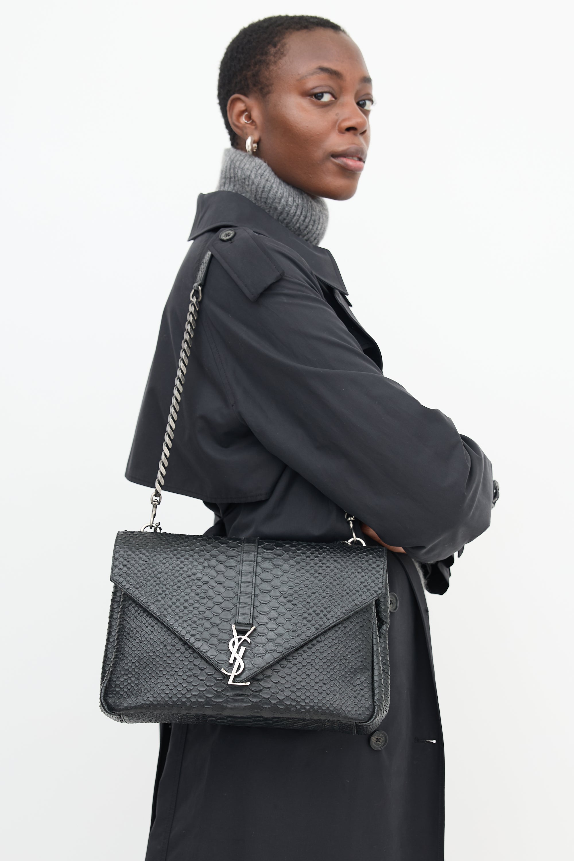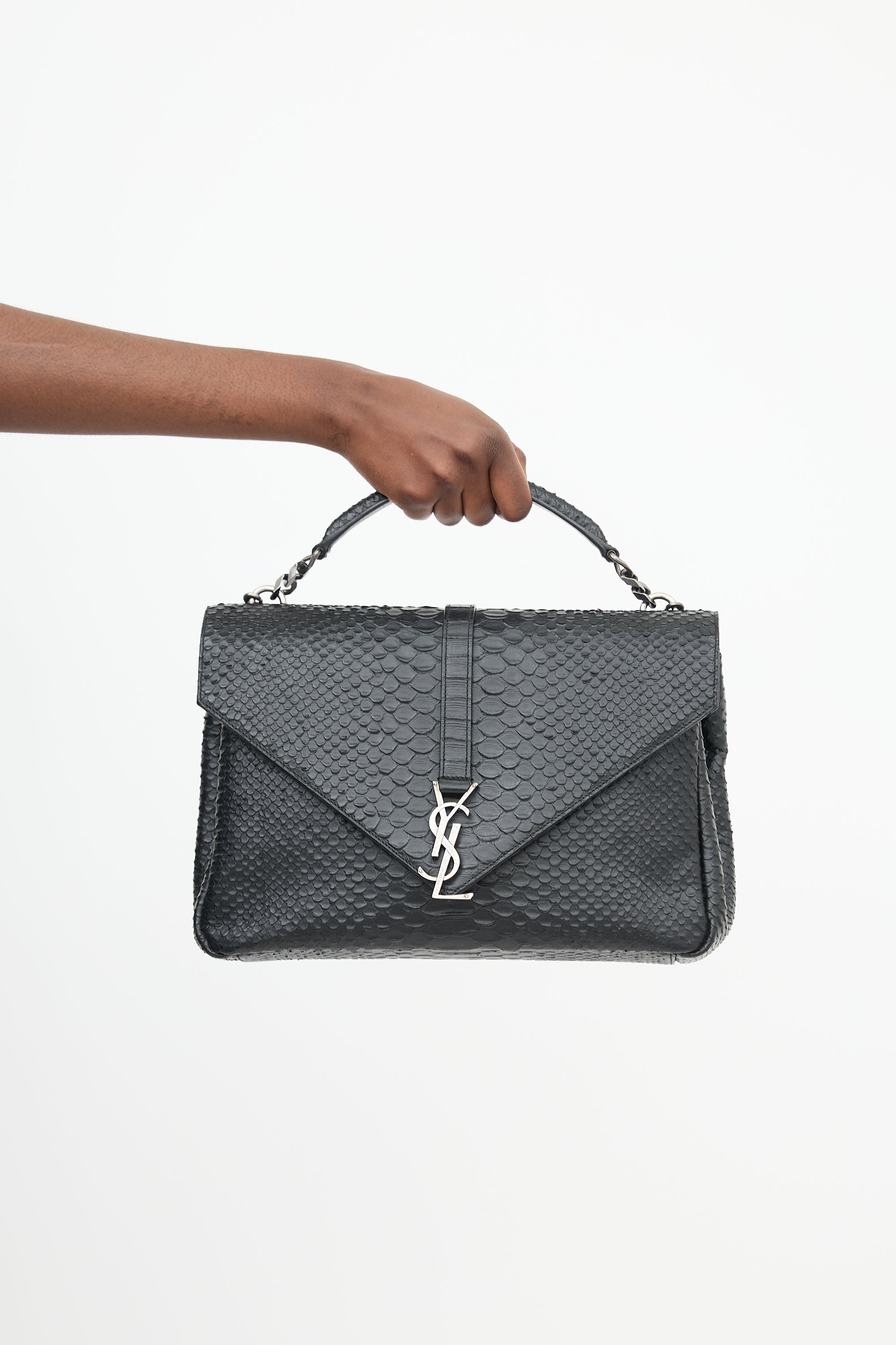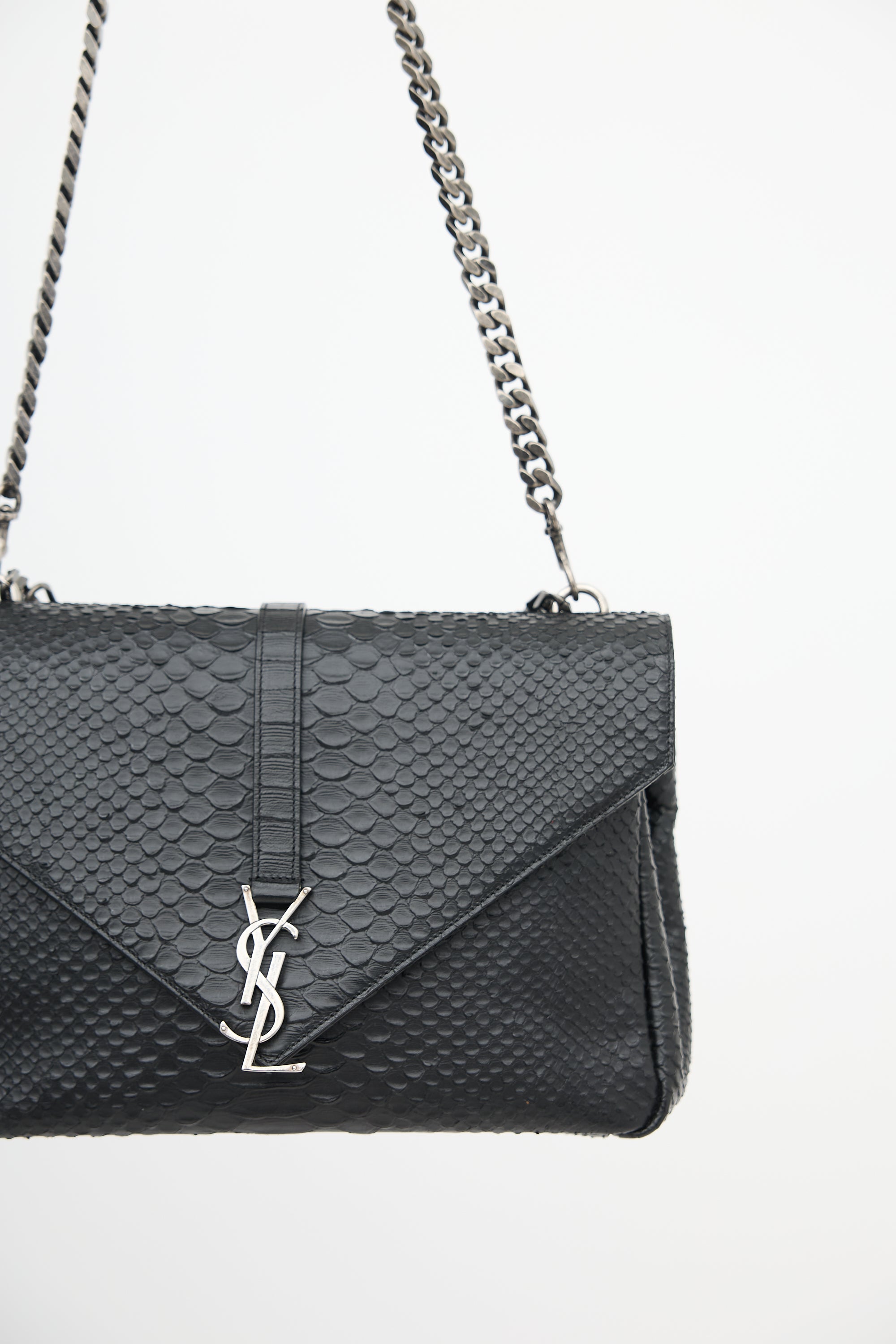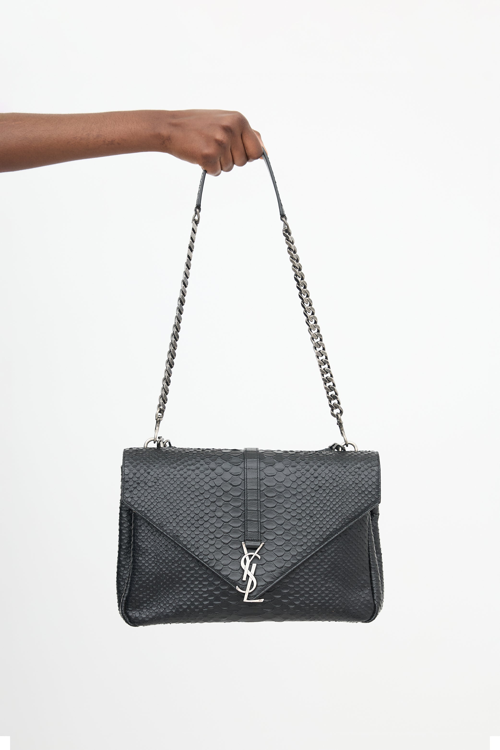 Pre-owned Saint Laurent black College bag featuring python snakeskin leather, gunmetal Cassandre logo at front, detachable fixed chain shoulder strap, leather top handle, slip pocket at back, snap button closure, one main compartment, and one zip, one card slot, and one slip pockets inside. Comes with original box and dust bag.