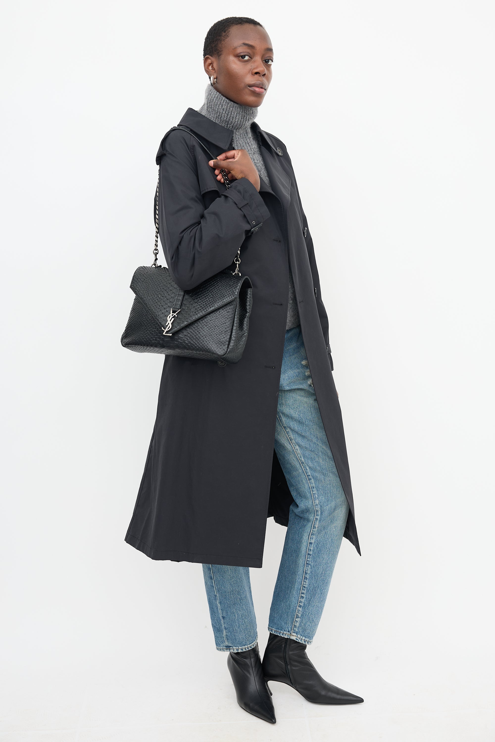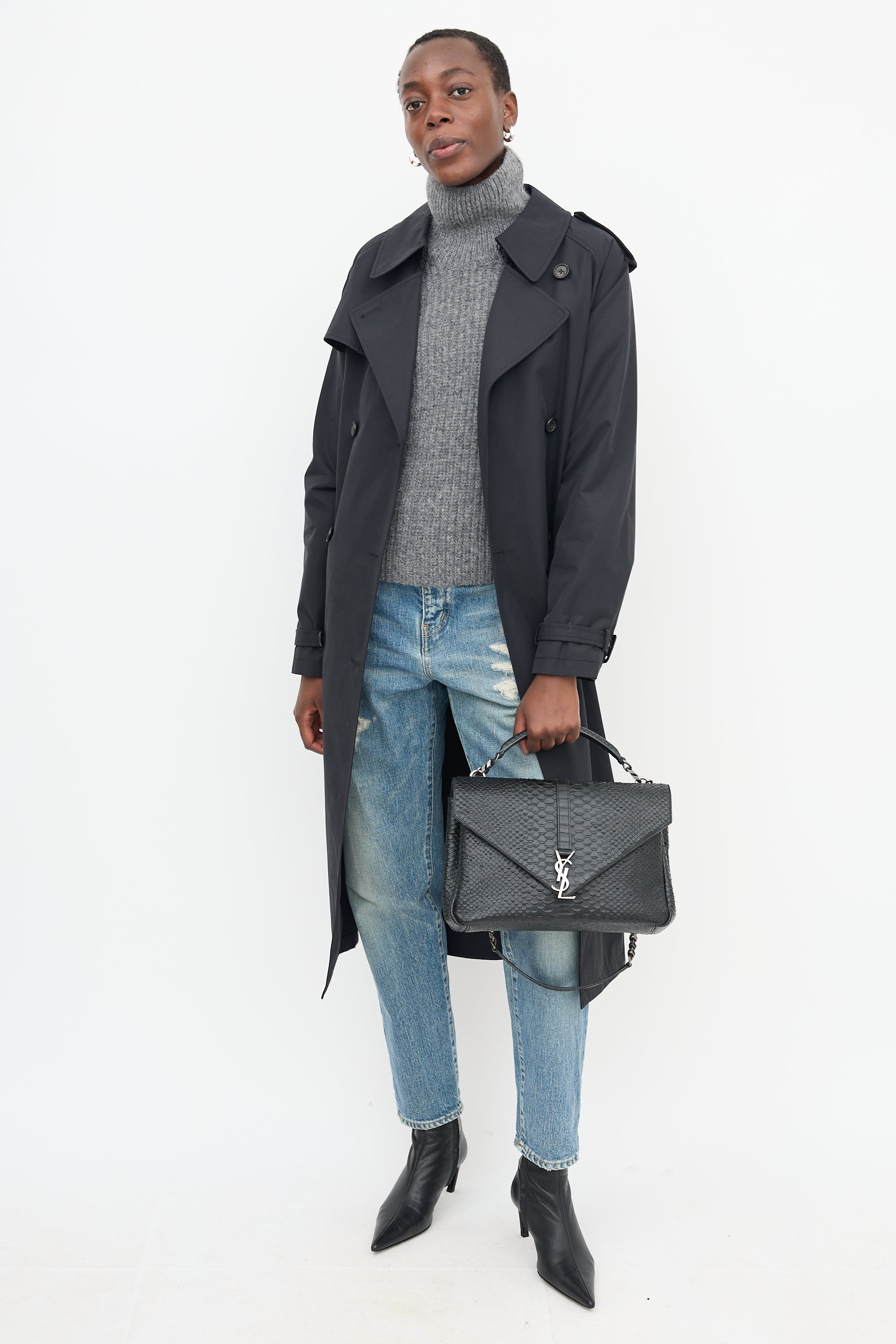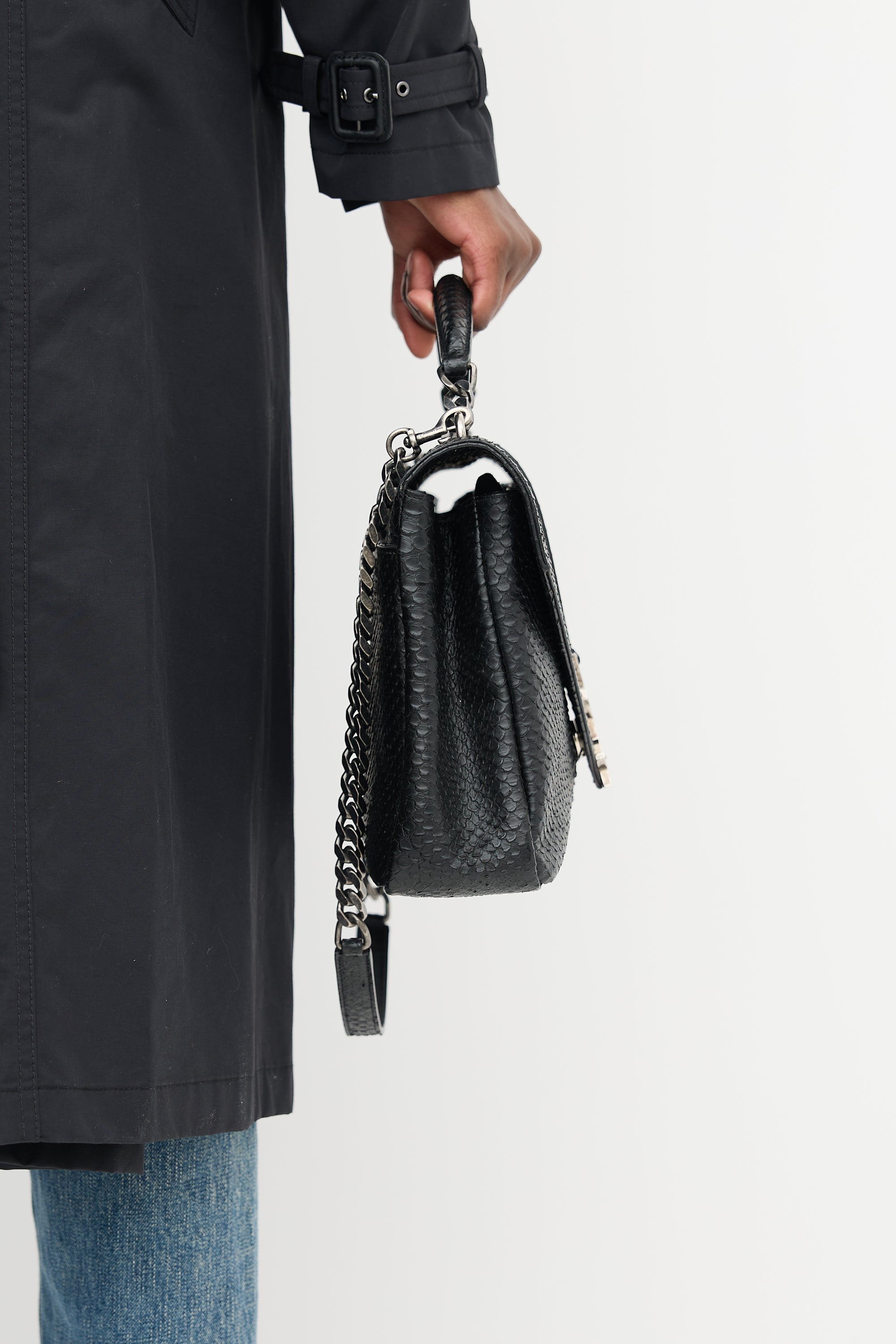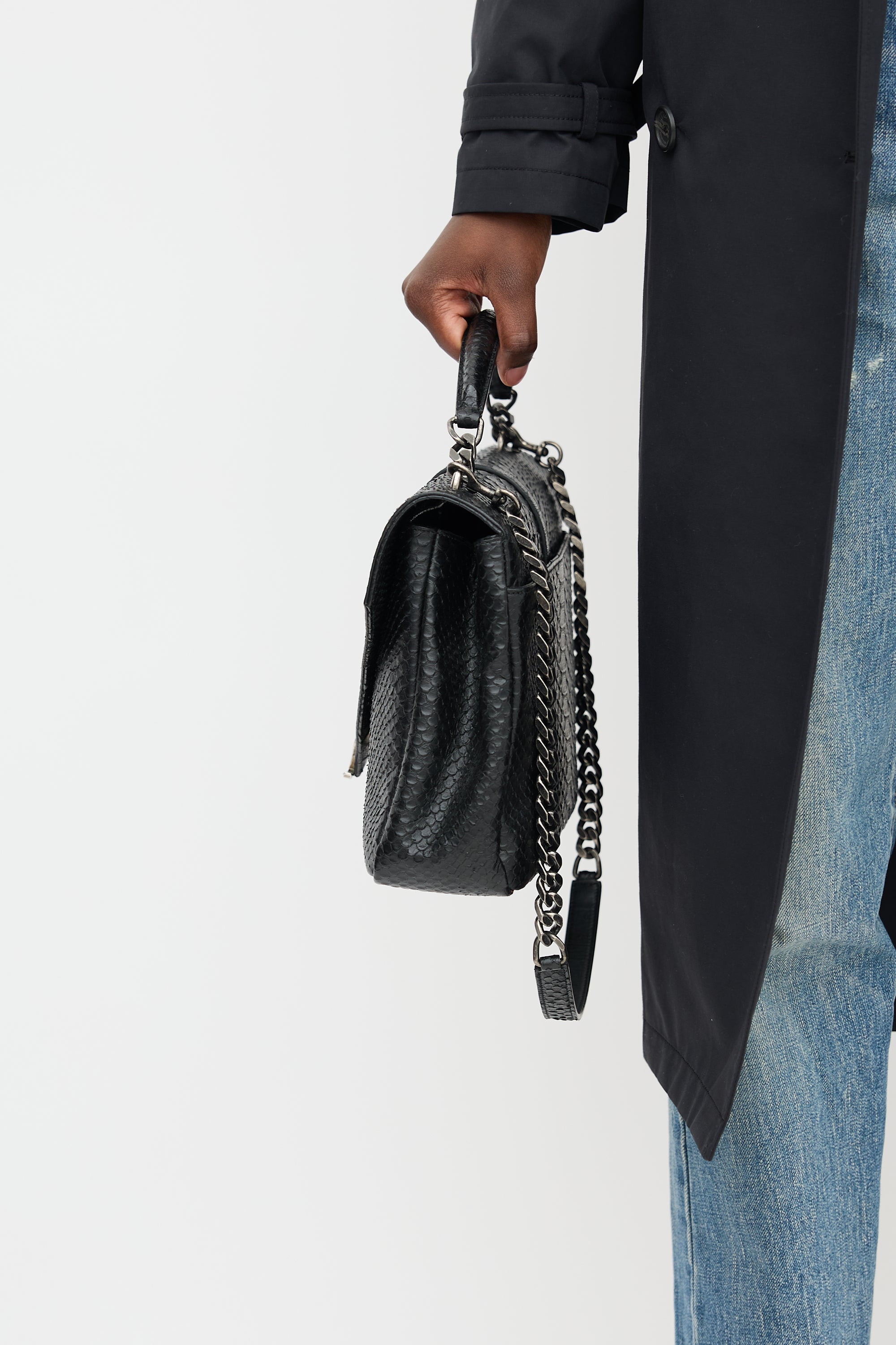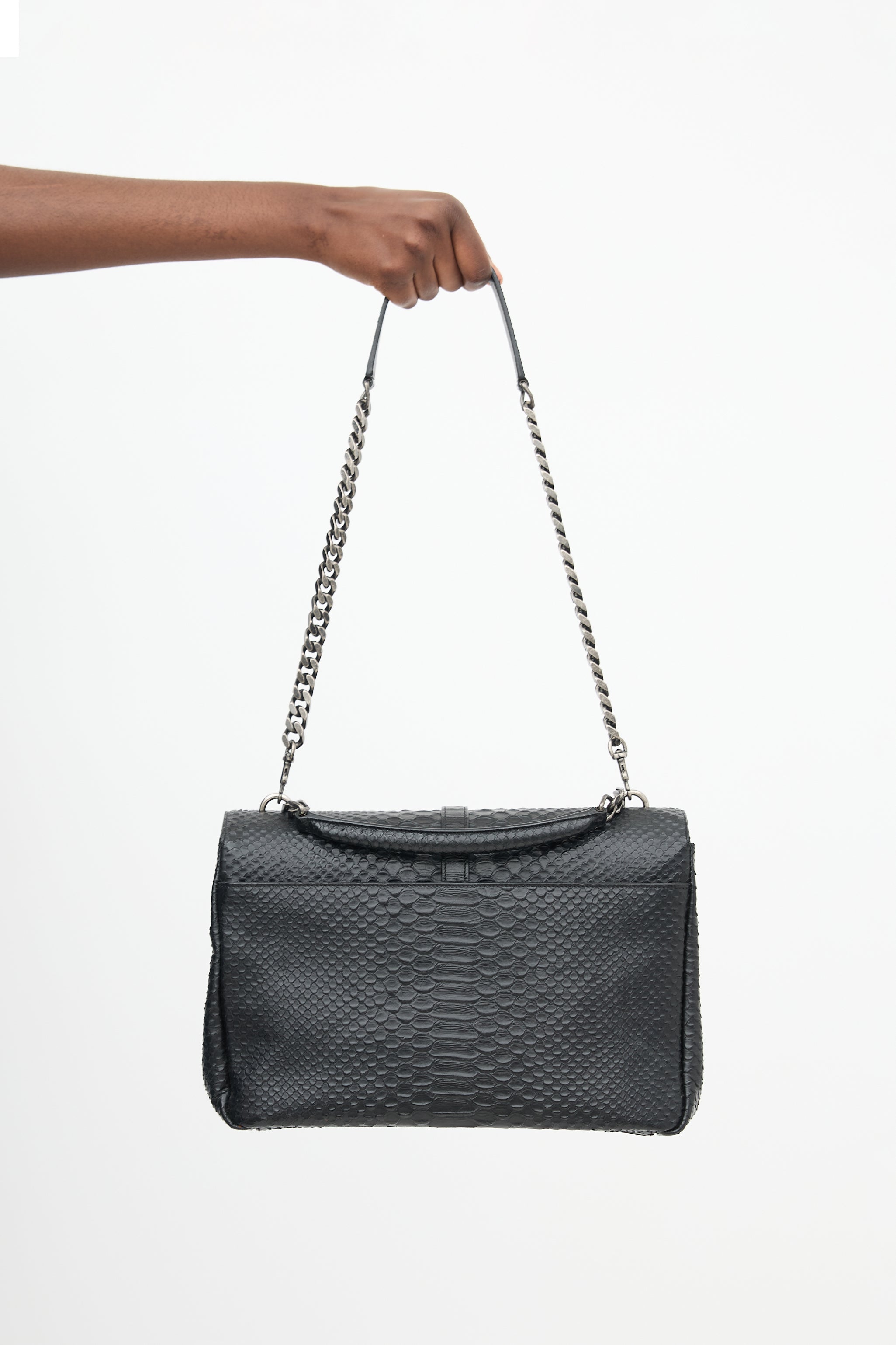 Pre-owned Saint Laurent black College bag featuring python snakeskin leather, gunmetal Cassandre logo at front, detachable fixed chain shoulder strap, leather top handle, slip pocket at back, snap button closure, one main compartment, and one zip, one card slot, and one slip pockets inside. Comes with original box and dust bag.