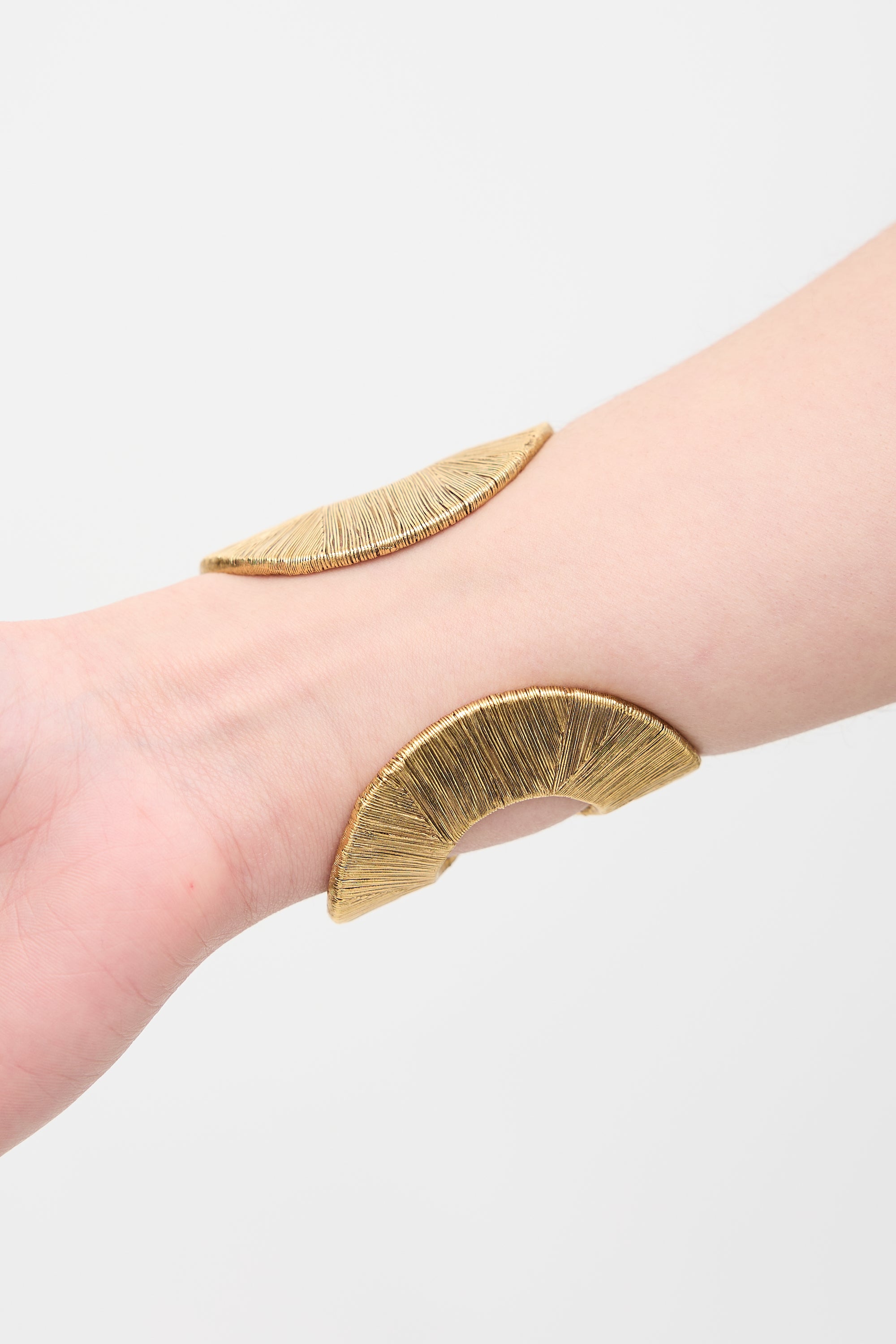 Pre-owned Saint Laurent gold tone cuff bracelet featuring textured swirl design, cut out logo at one end, and engraved logo at inner side.