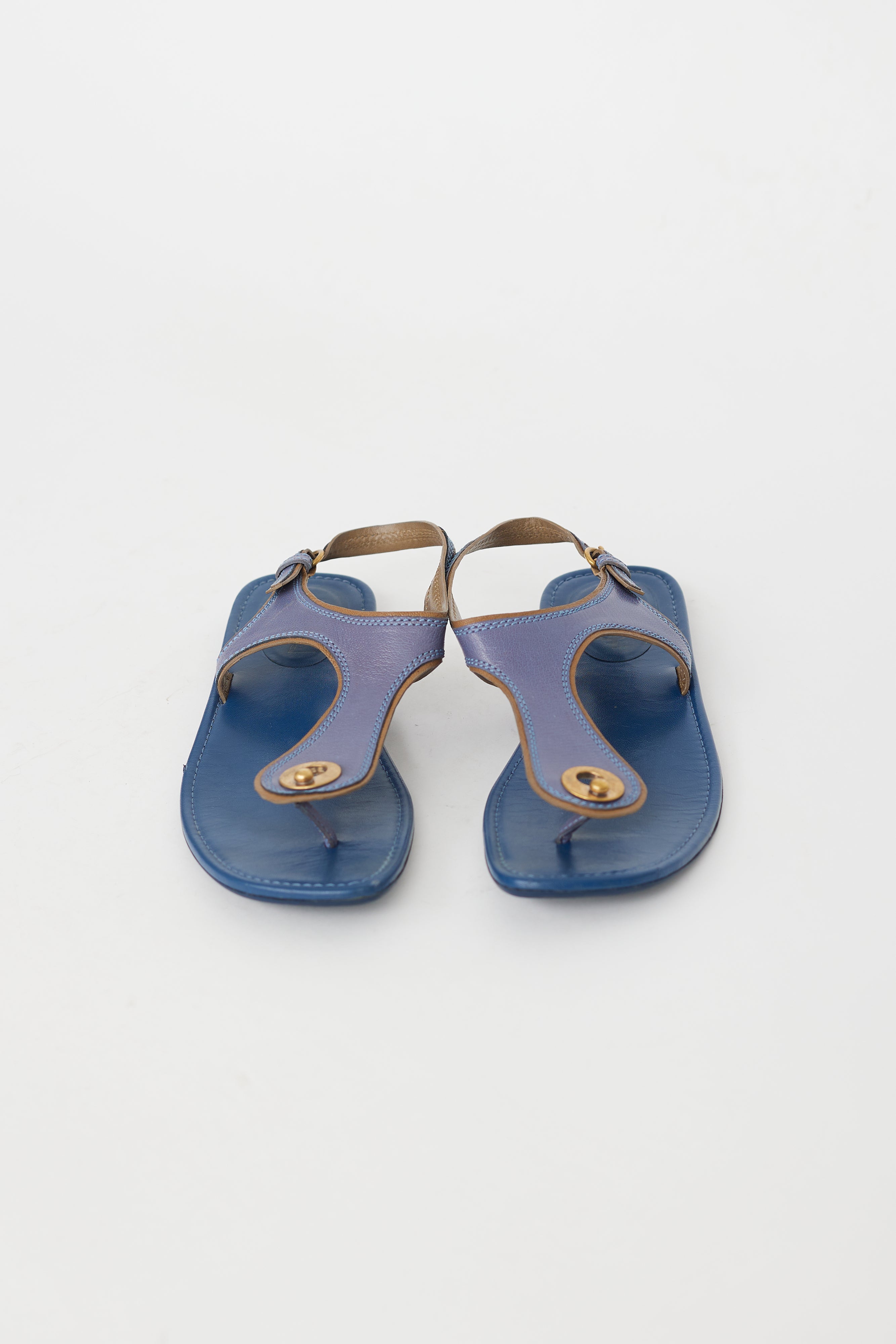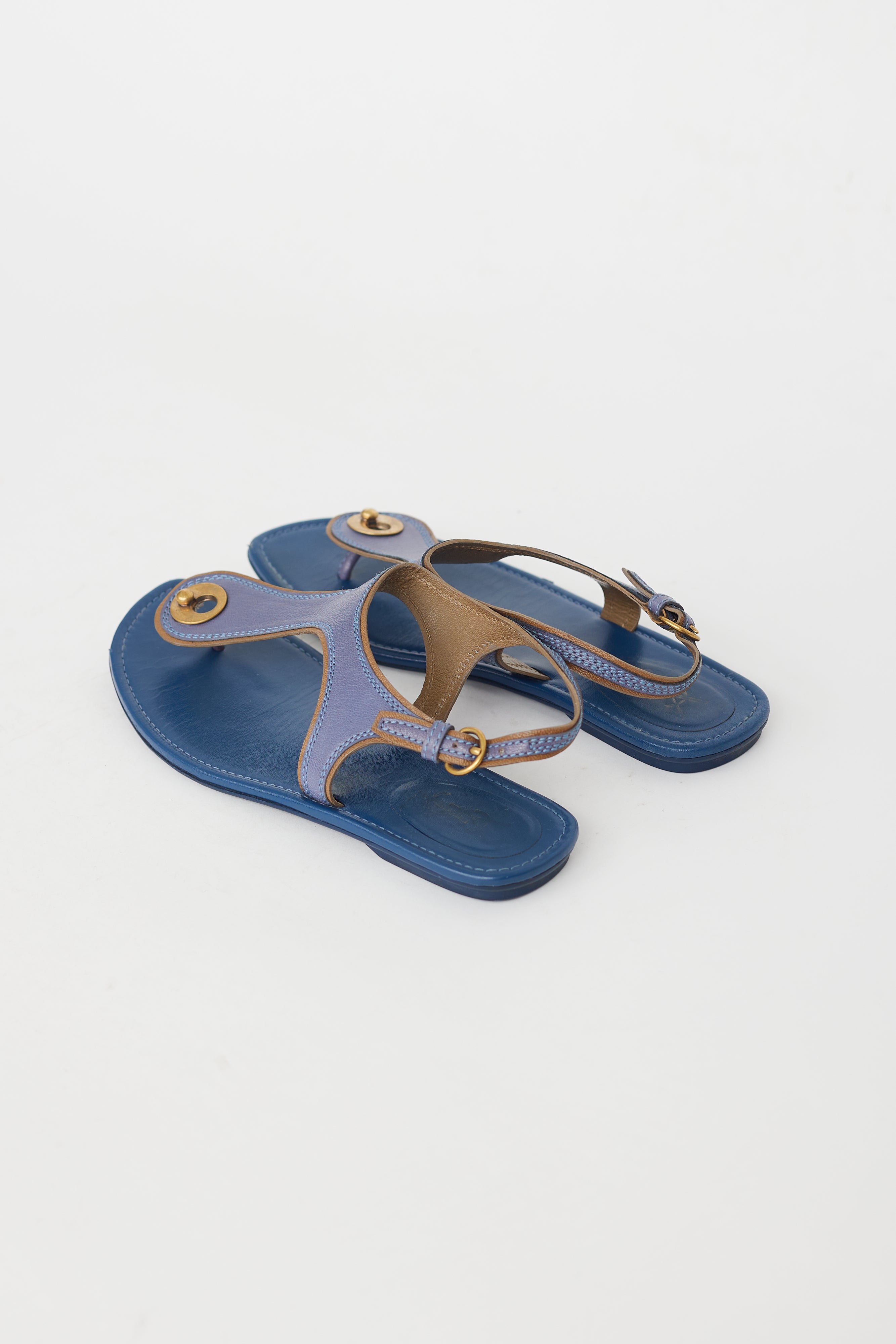 Pre-owned Saint Laurent vintage blue sandals featuring open rounded toe, T-strap, gold tone hardware, ankle strap with buckle fastening, and leather insole. Comes with original dust bag.