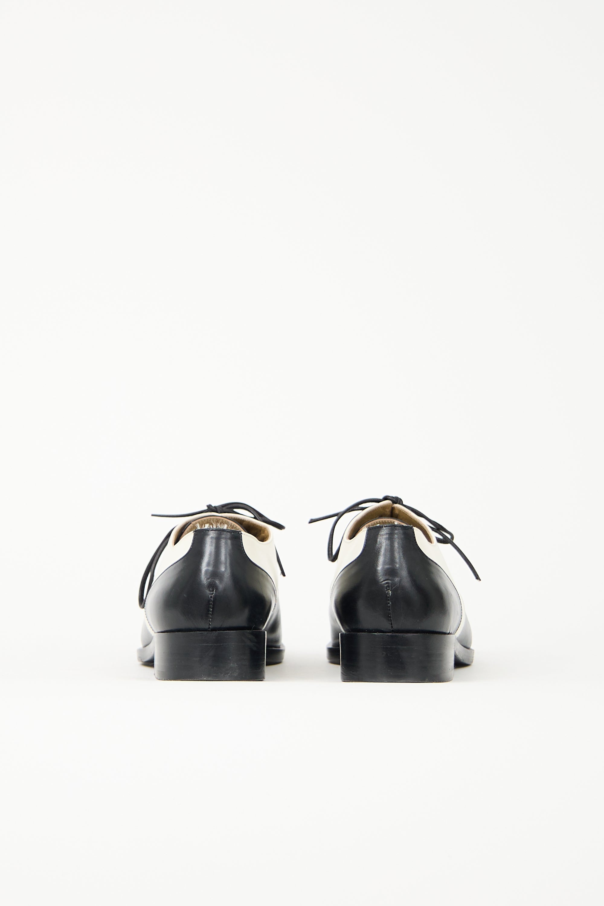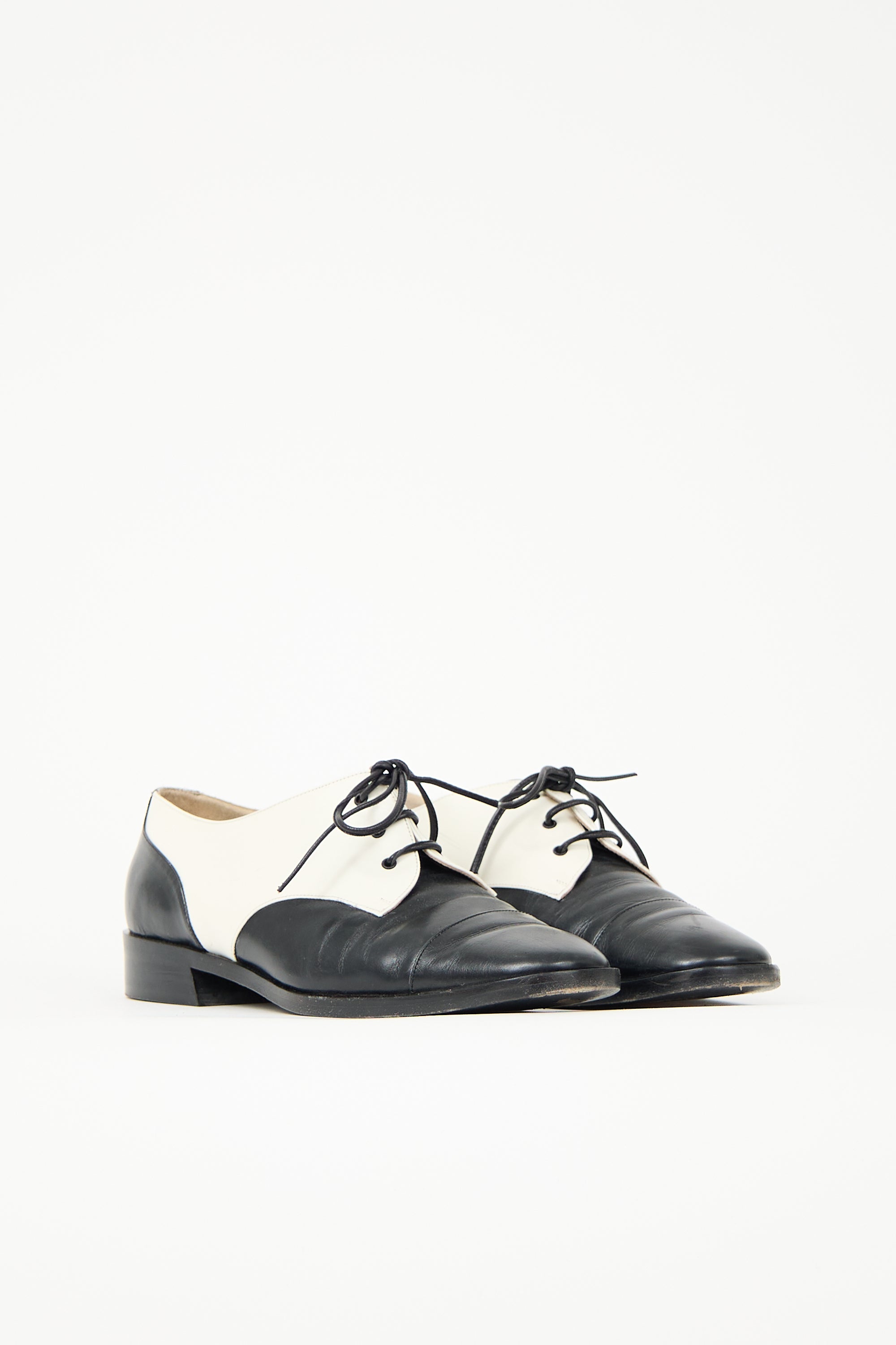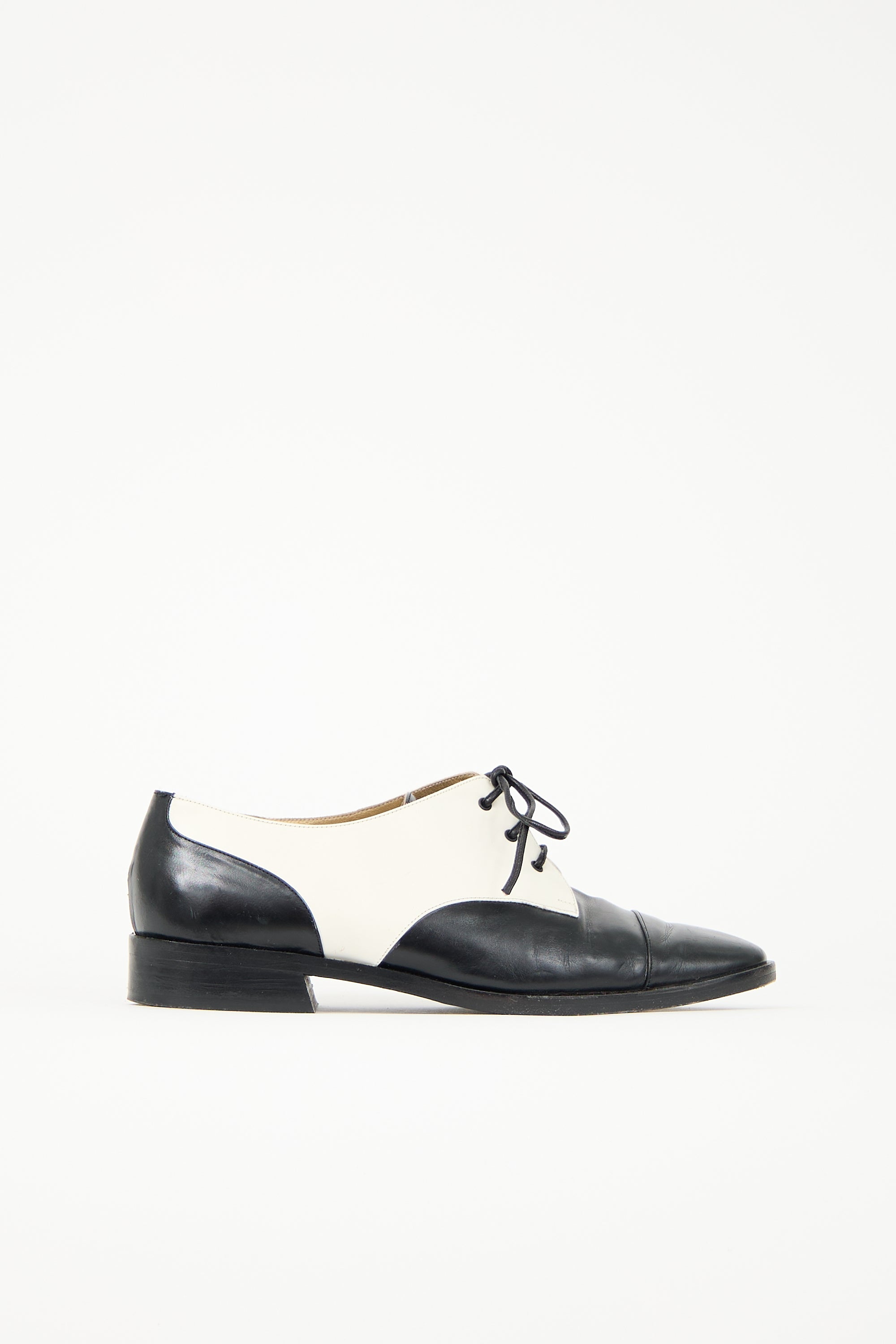 Pre-owned vintage Yves Saint Laurent leather black and white derby featuring a tapered round toe, lace up vamp, and a short stacked heel.