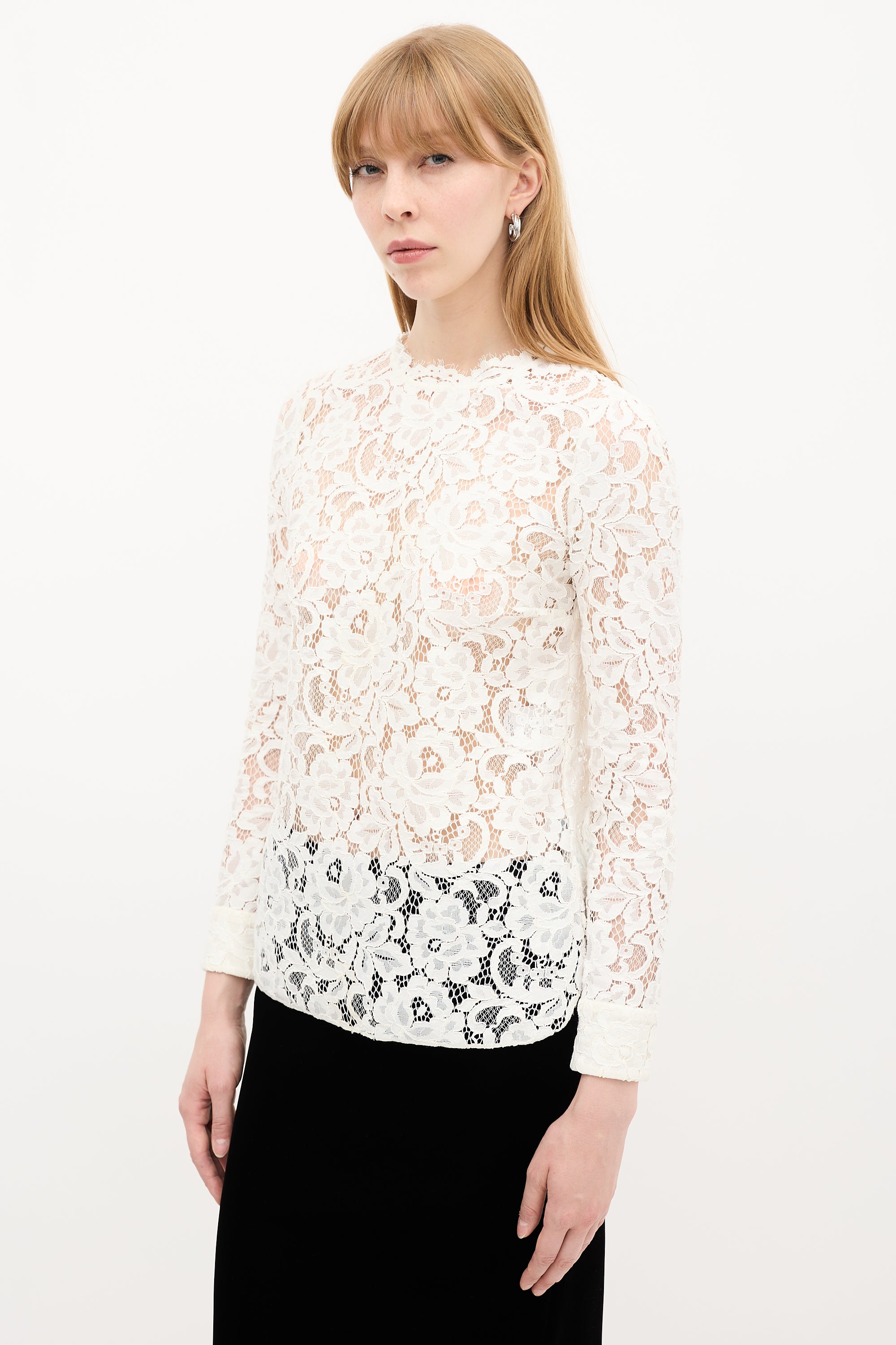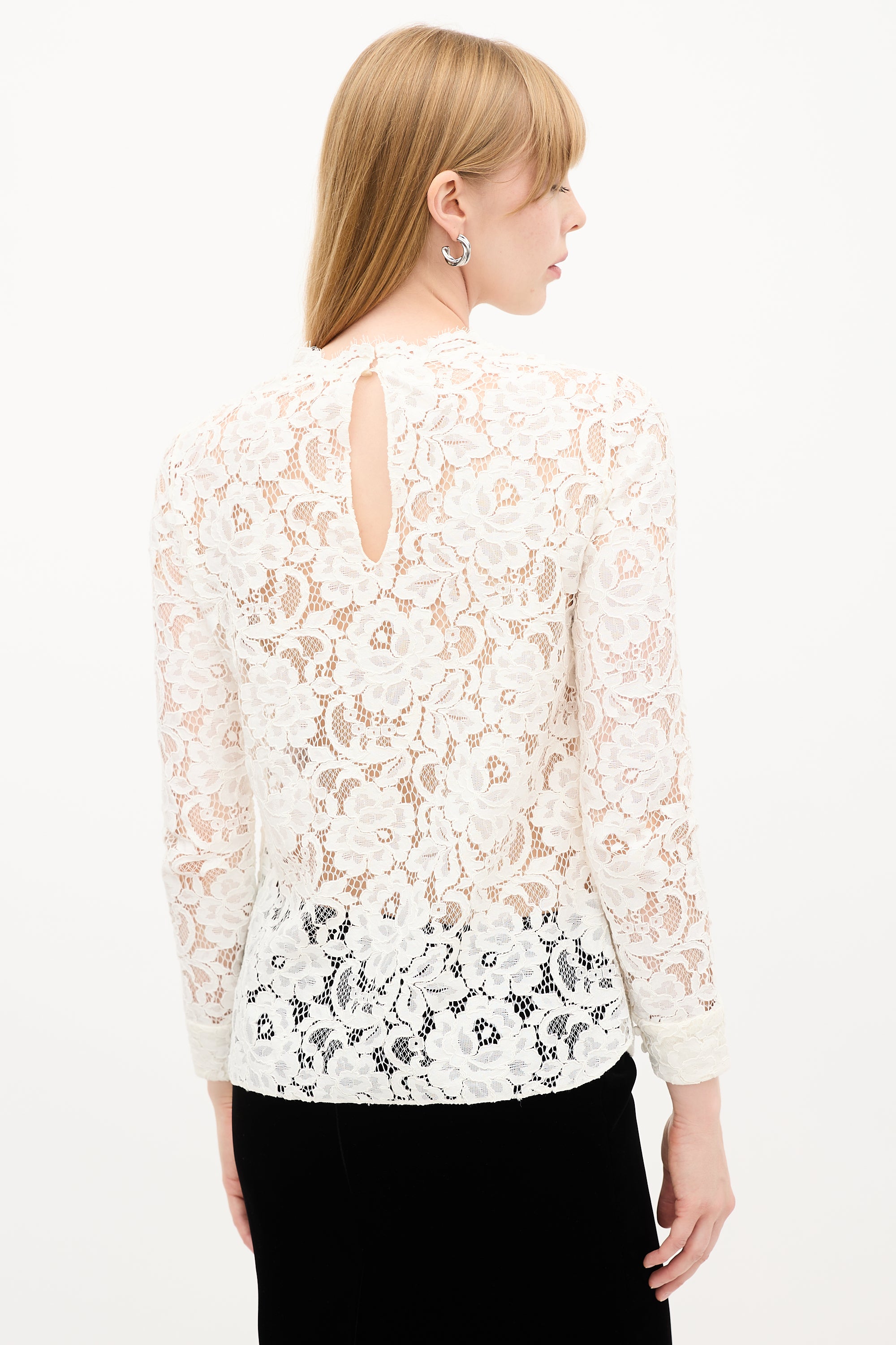 Pre-owned Saint Laurent white lace blouse featuring round neckline, buttoned keyhole at back, long sleeves with buttoned cuffs, and side slits at hem.