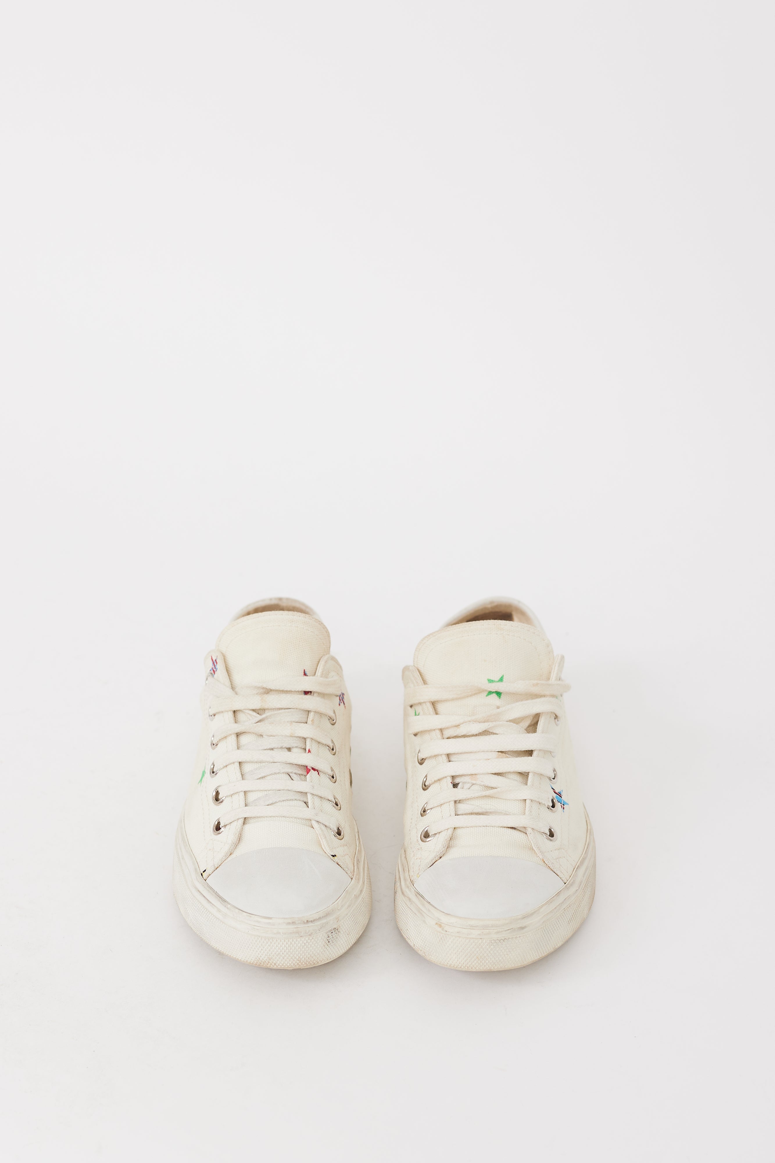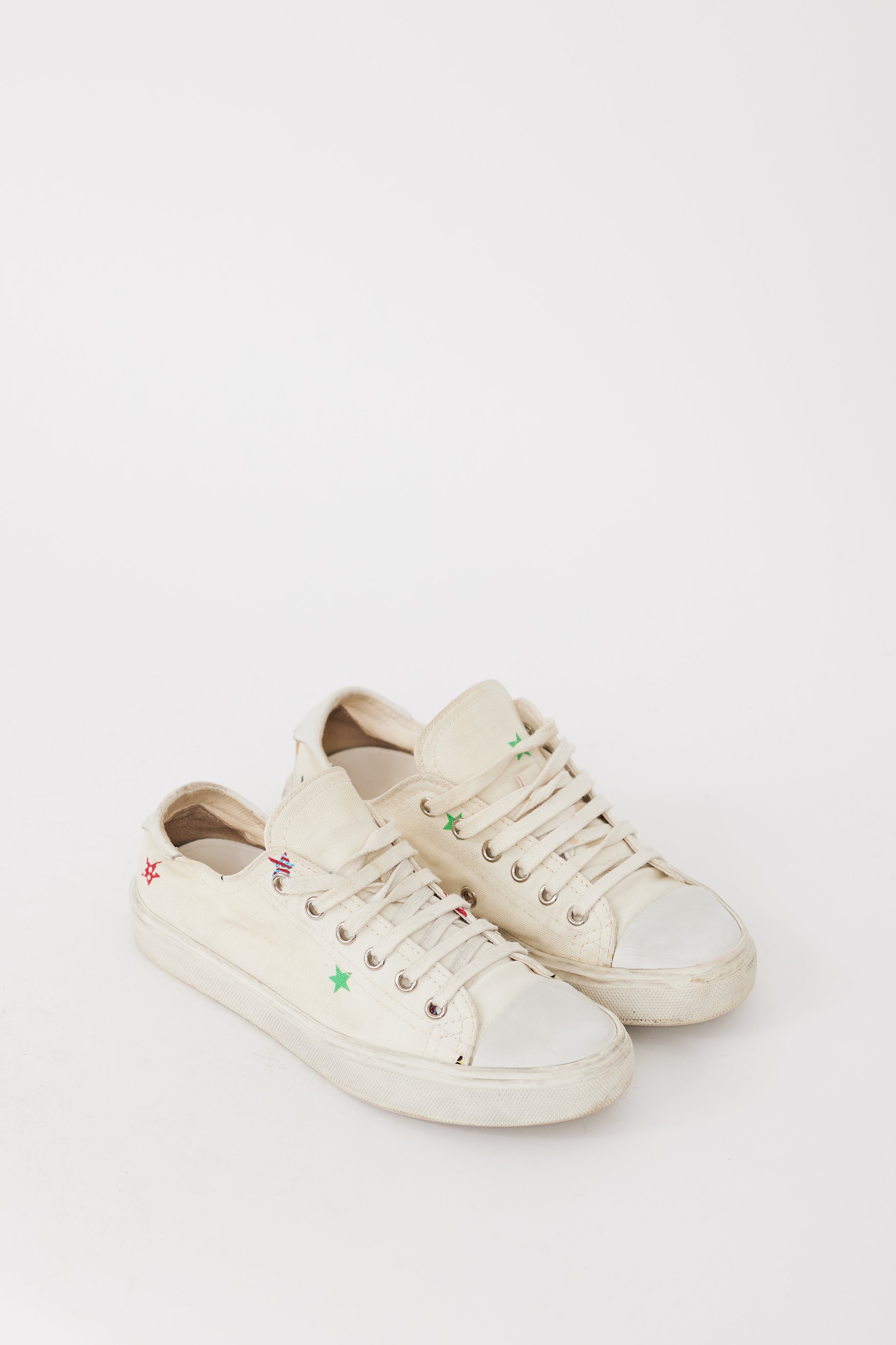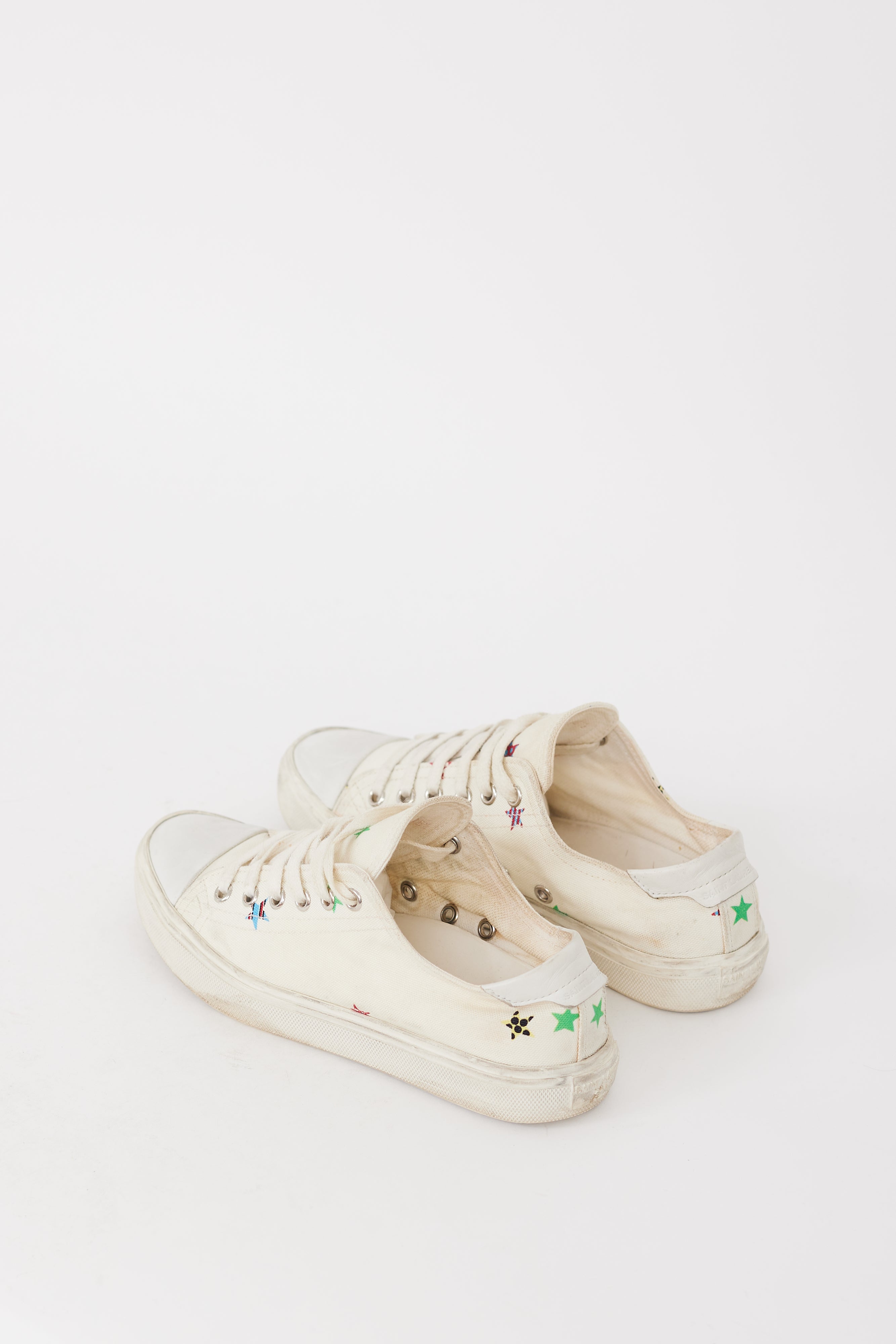 Pre-owned Saint Laurent white canvas sneakers featuring a rounded toe, multicolour stars printed throughout, lace up front, leather stamped logo tab at counter, and white rubber sole with embossed logo at heel. Comes with original dust bag.