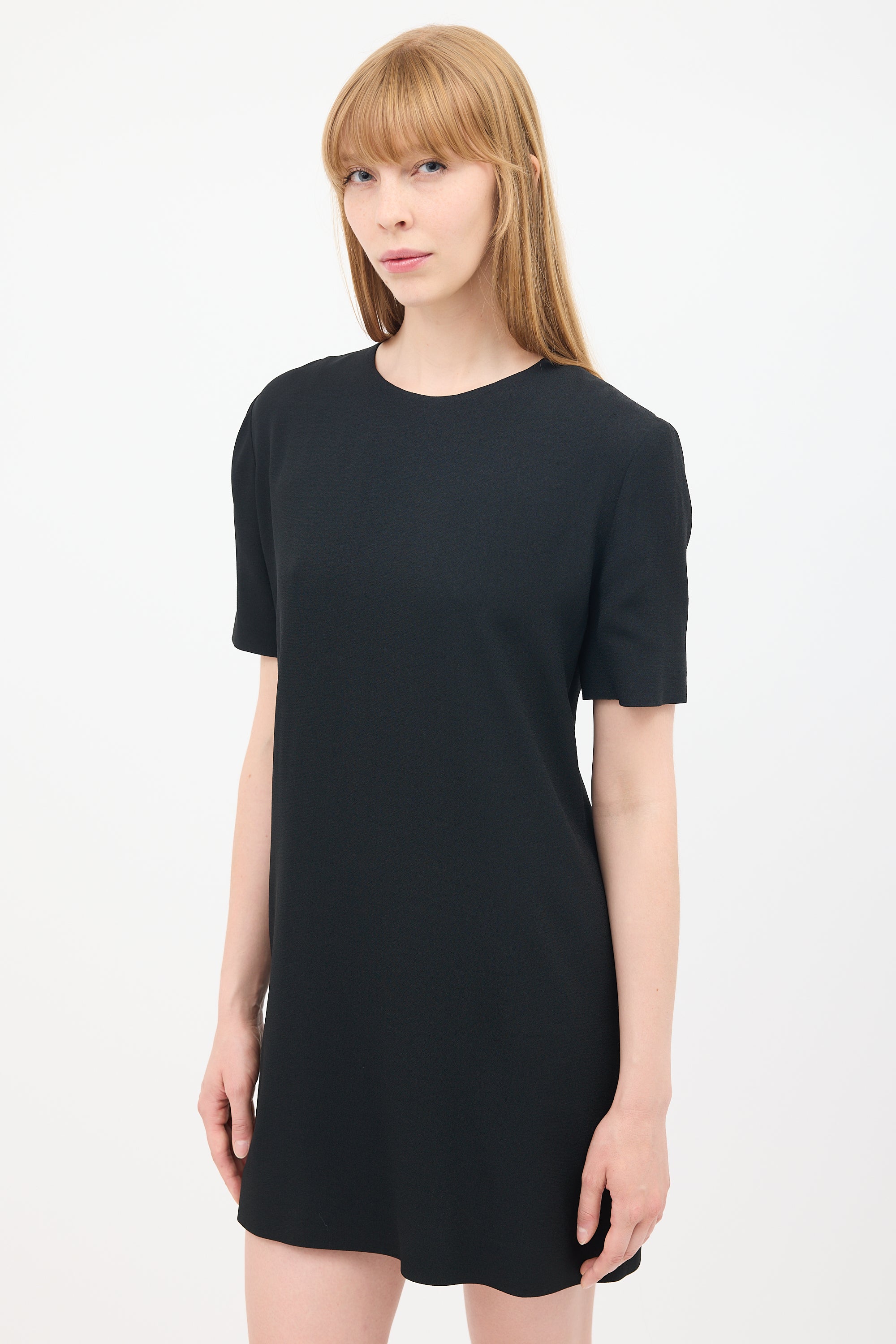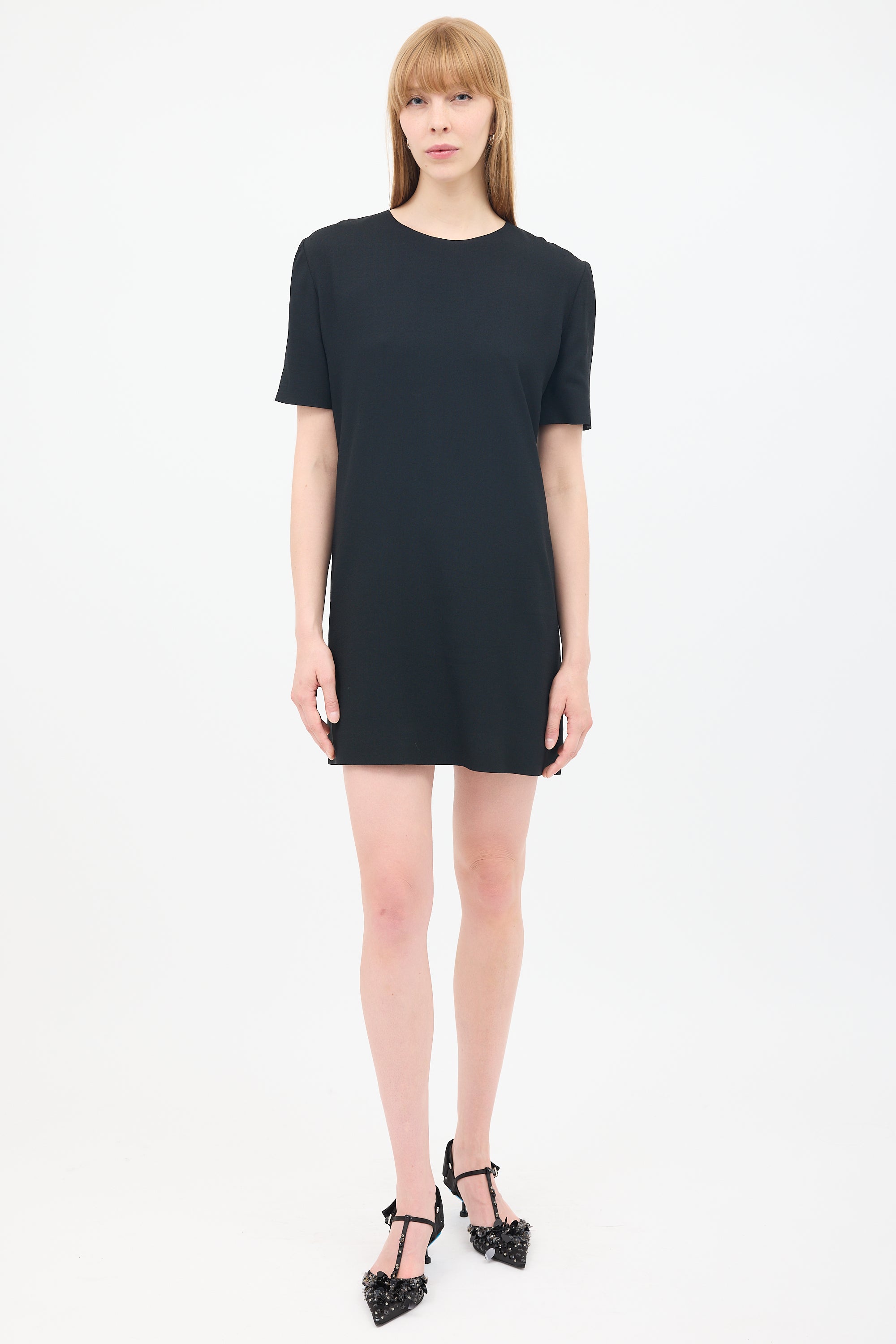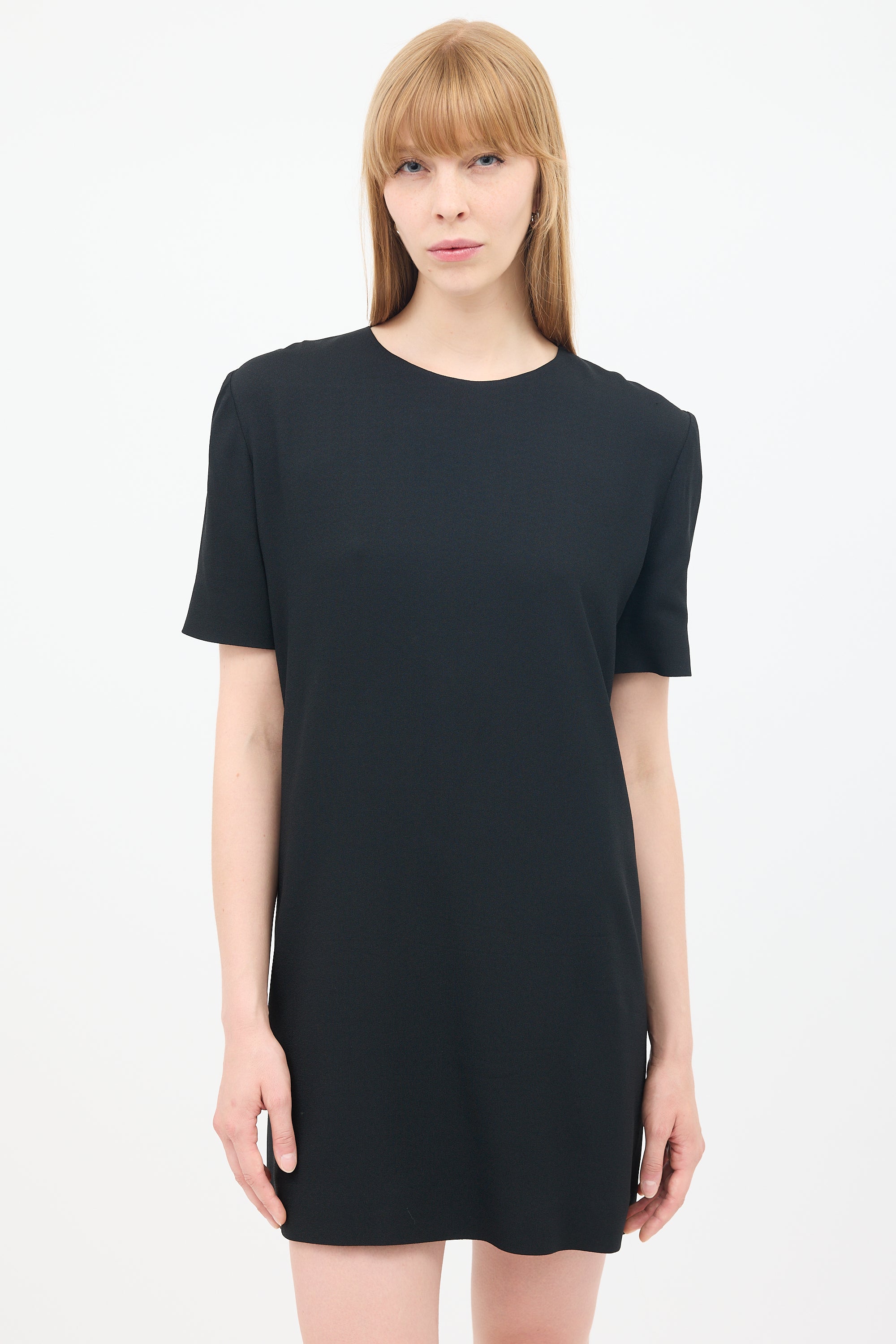 Pre-owned Saint Laurent black mini shift dress featuring a round neckline, even hem, short sleeves, and concealed back zip. Lined. Clipped to fit model.