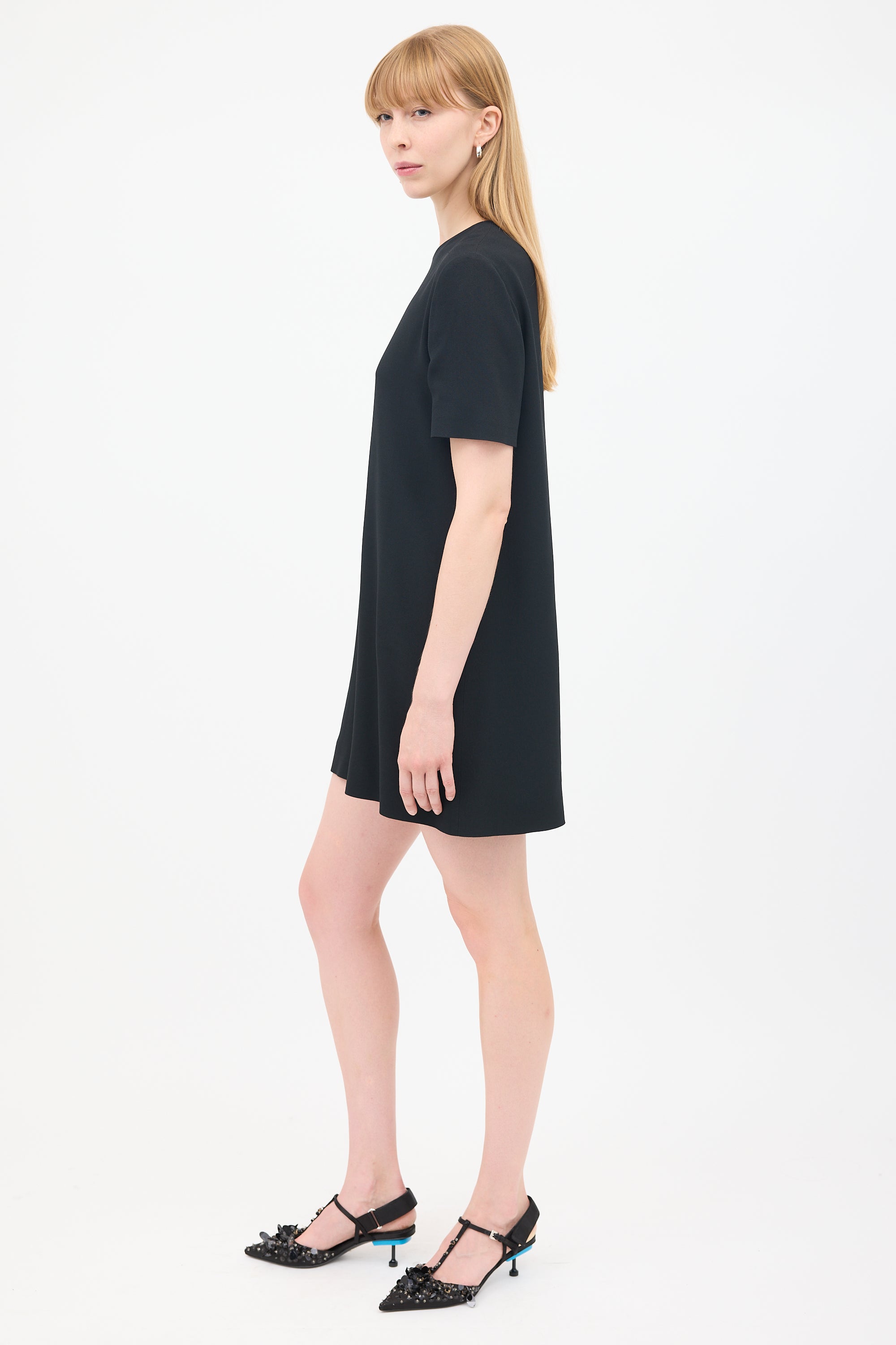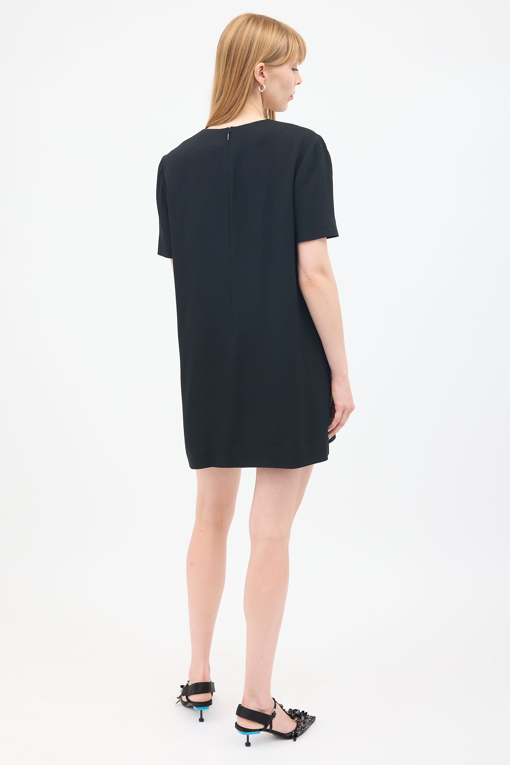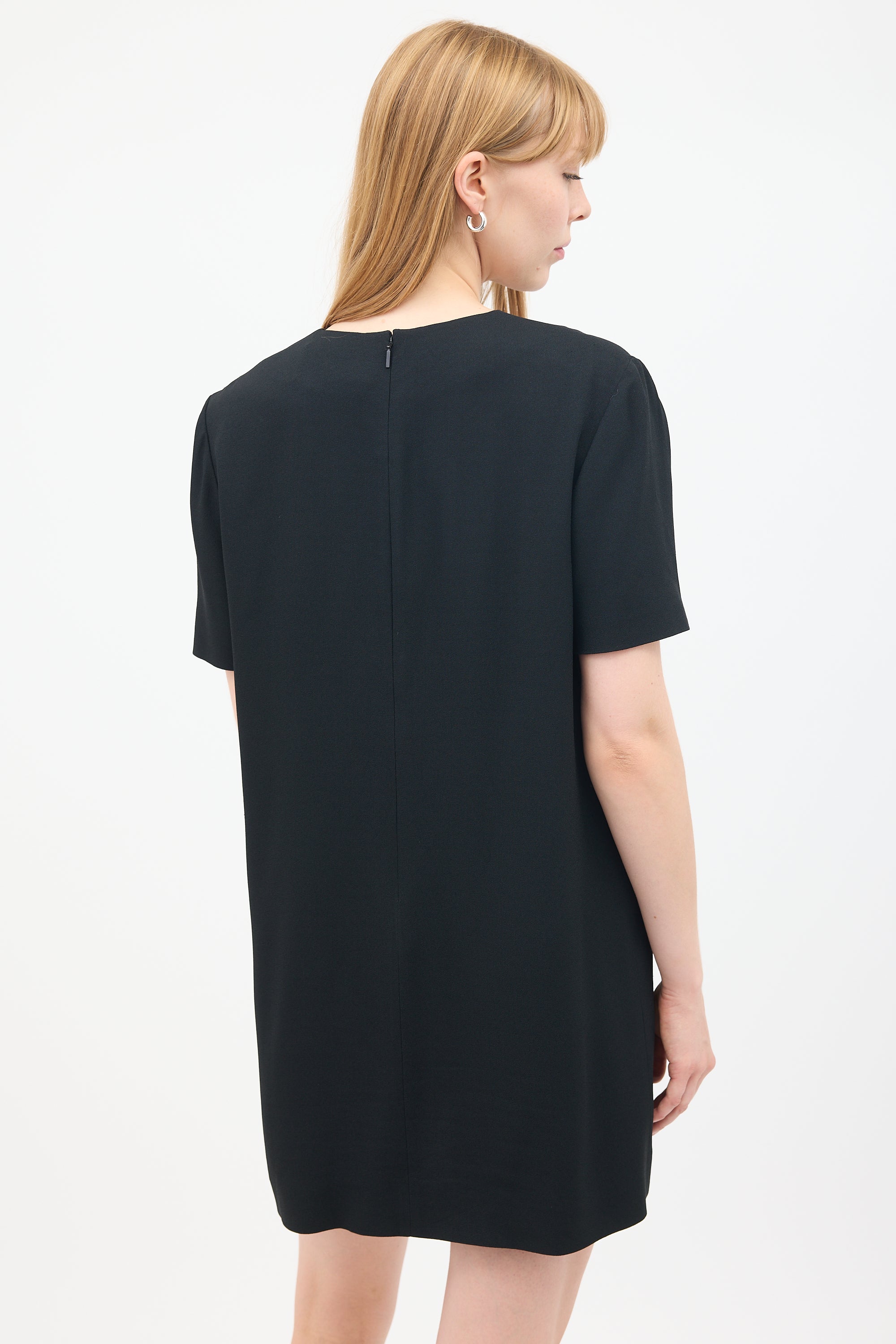 Pre-owned Saint Laurent black mini shift dress featuring a round neckline, even hem, short sleeves, and concealed back zip. Lined. Clipped to fit model.