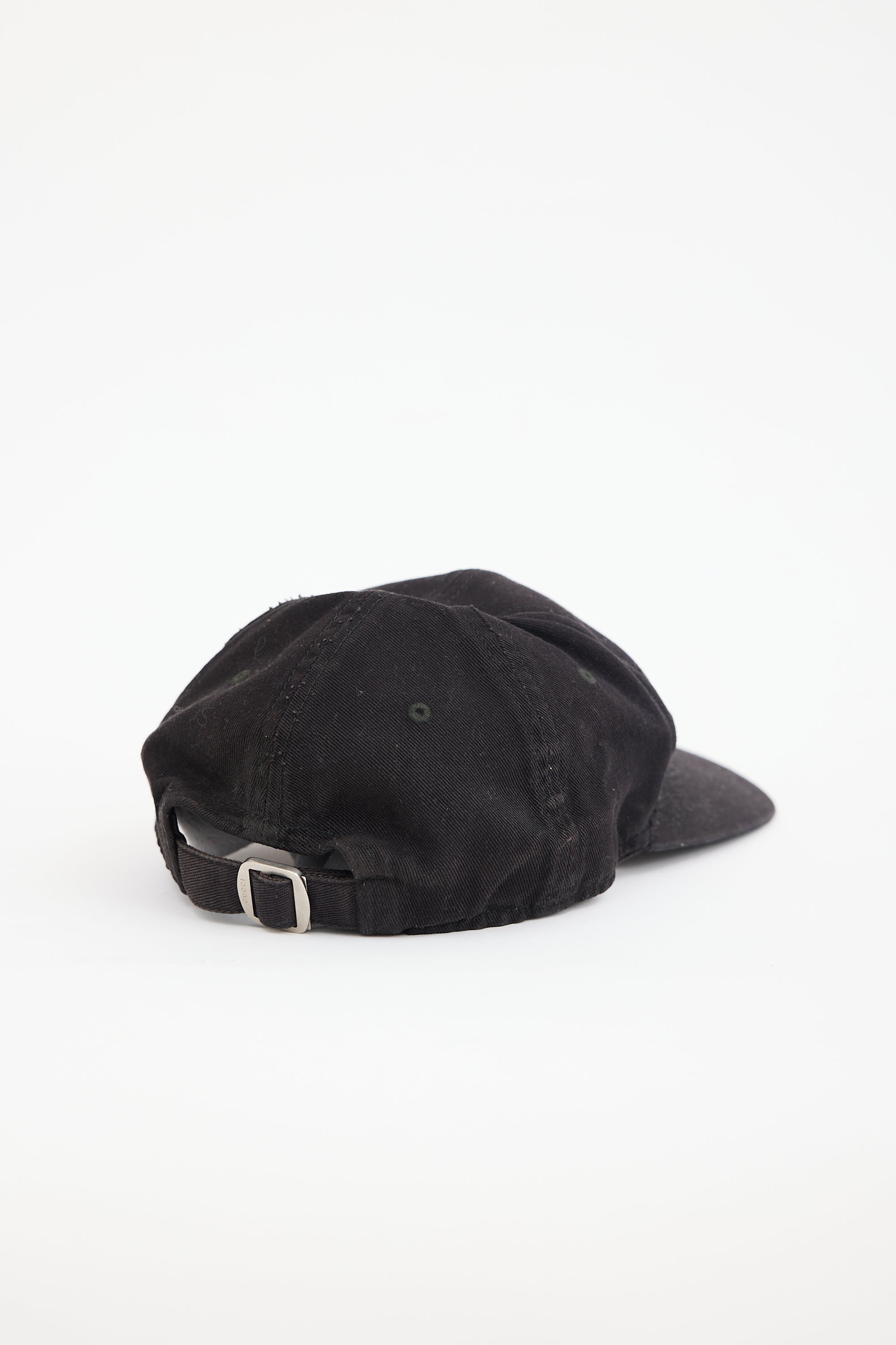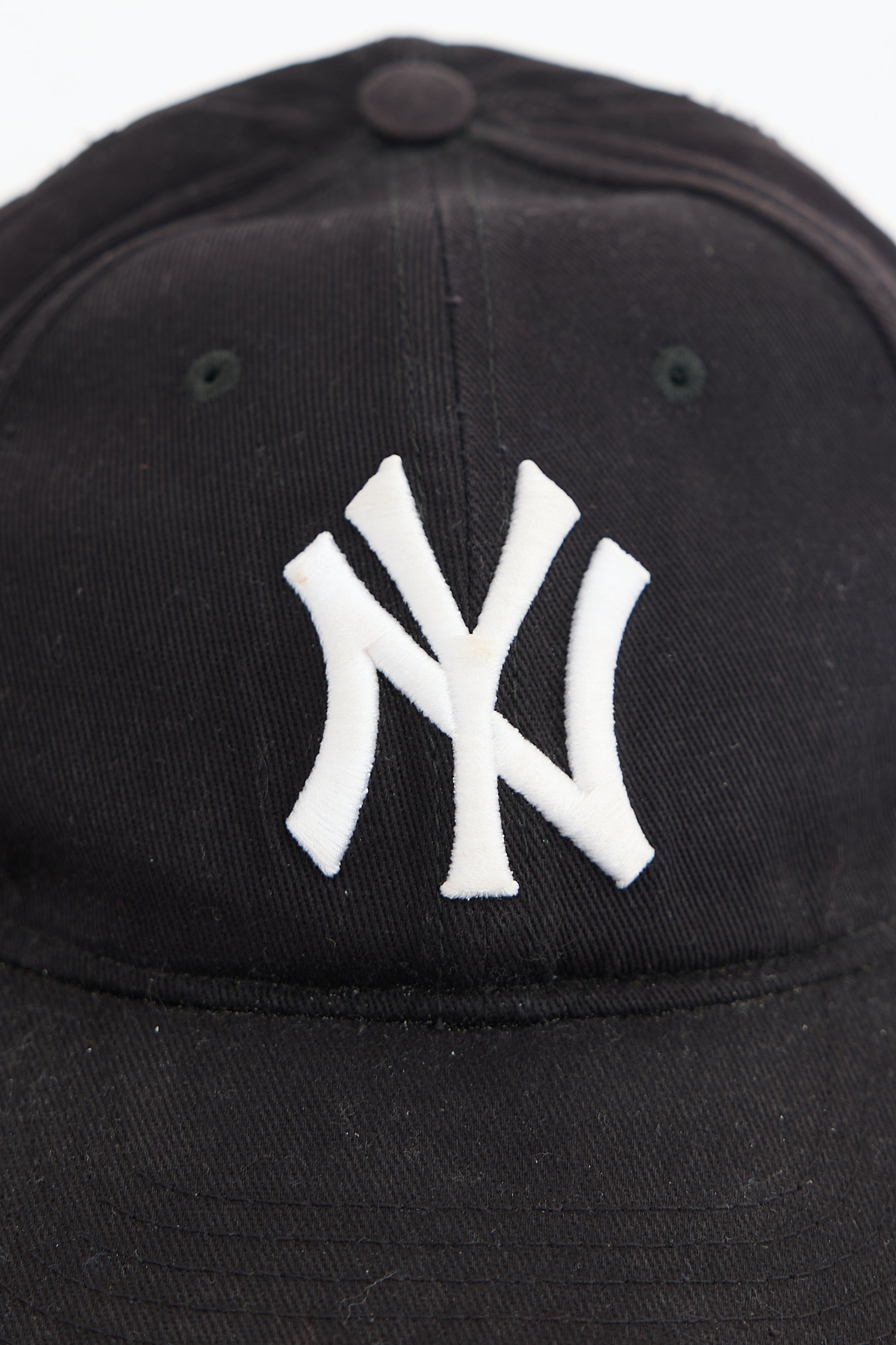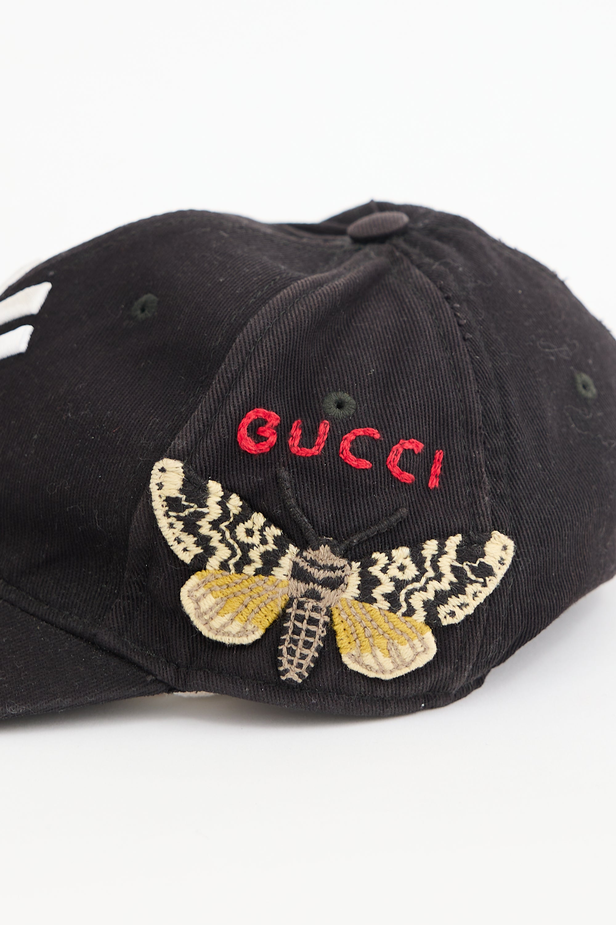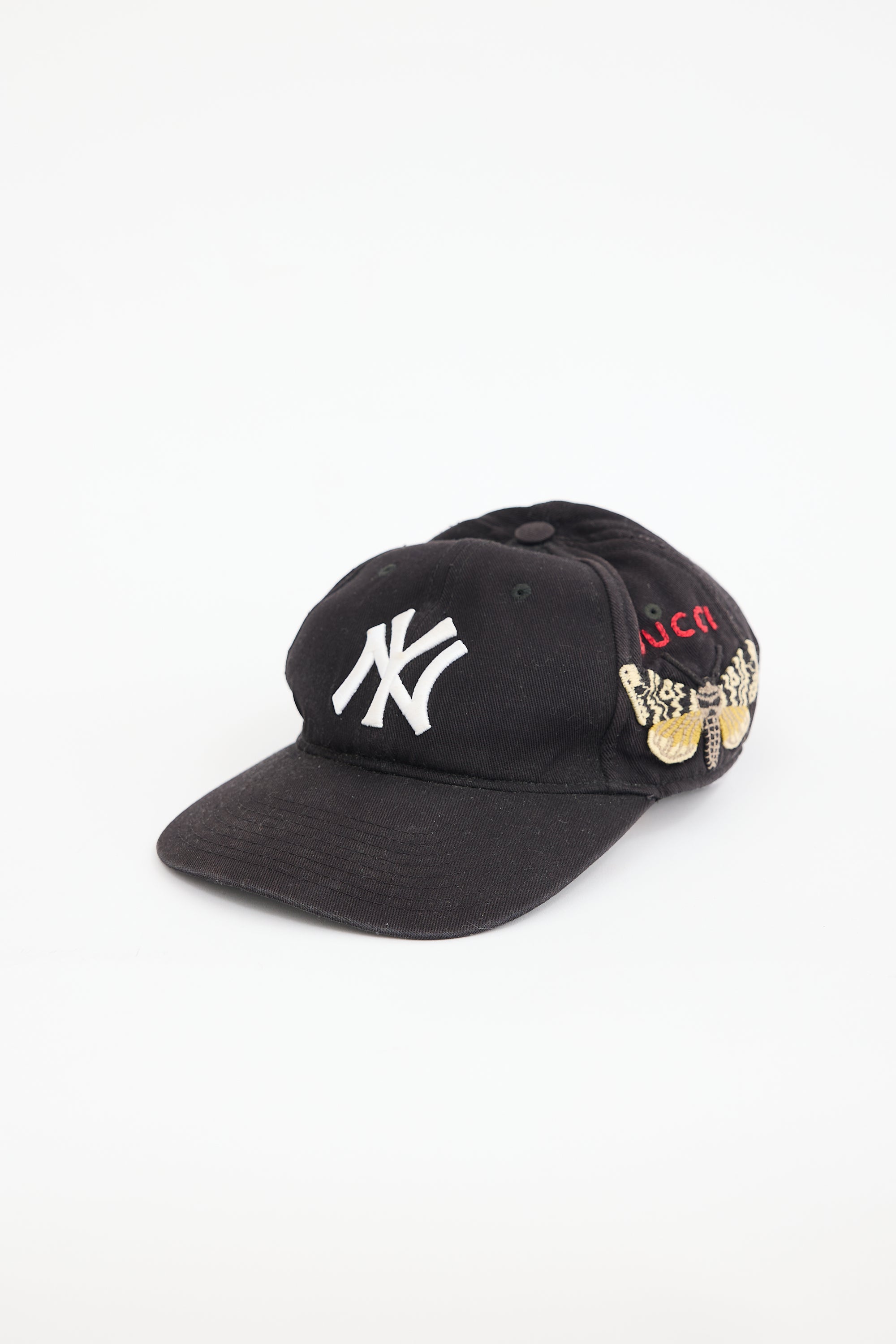 Pre-owned Gucci X NY Yankees black baseball hat featuring front embroidered NY logo, embroidered Gucci and moth motif at left side, adjustable strap back, and grosgrain interior brim lining.