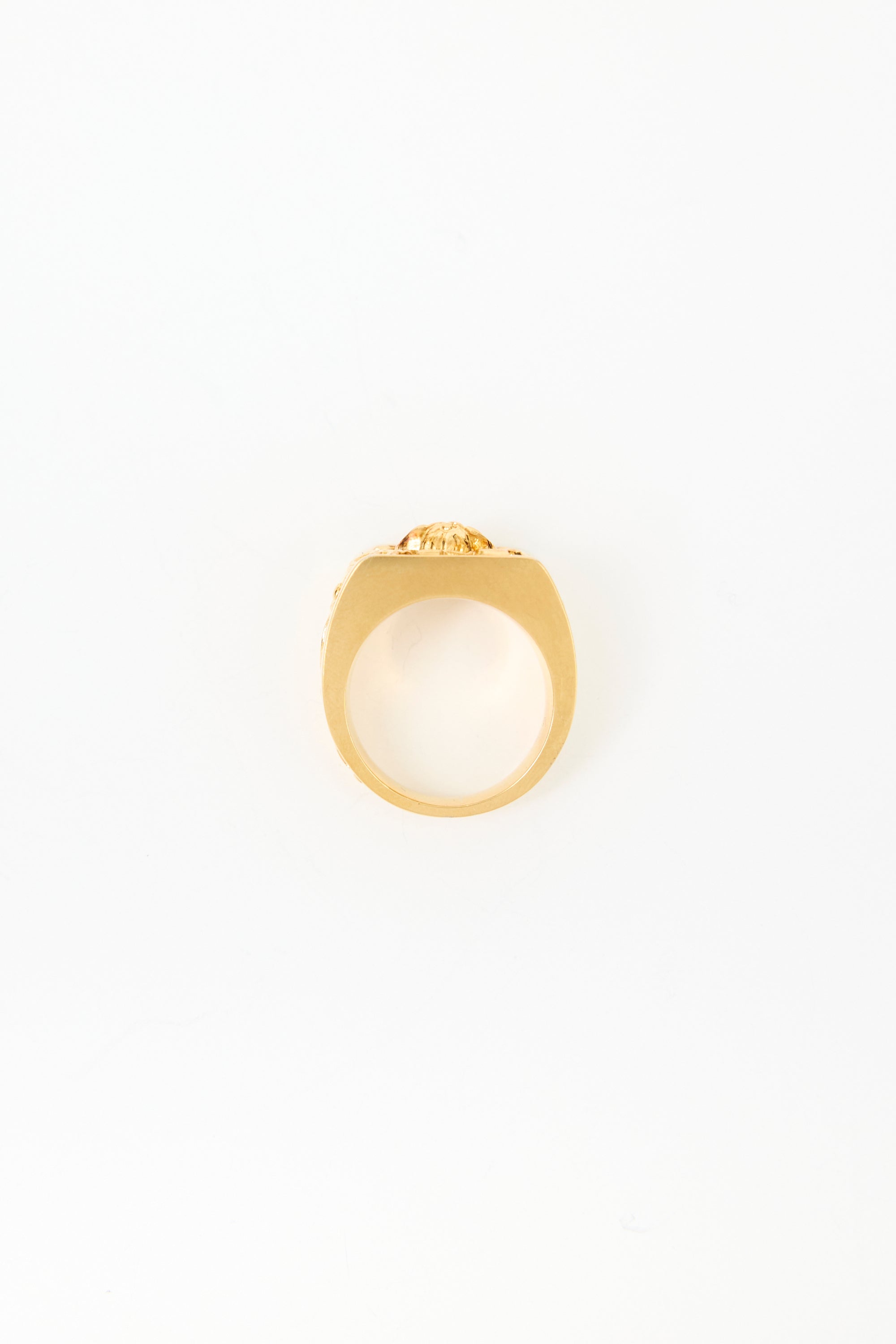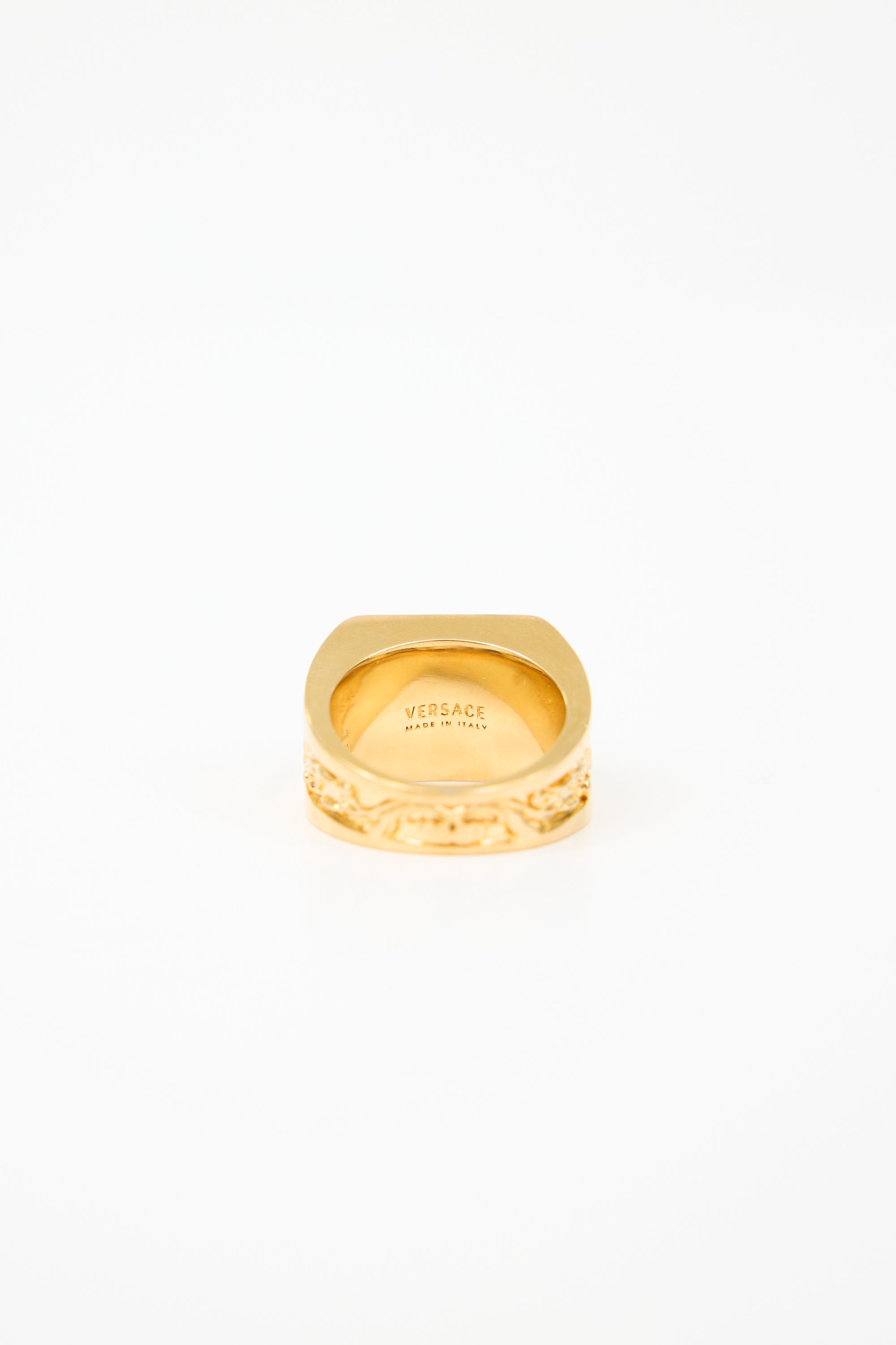 Pre-owned Versace gold tone ring featuring medusa baroque motif and engraved logo at inner band.