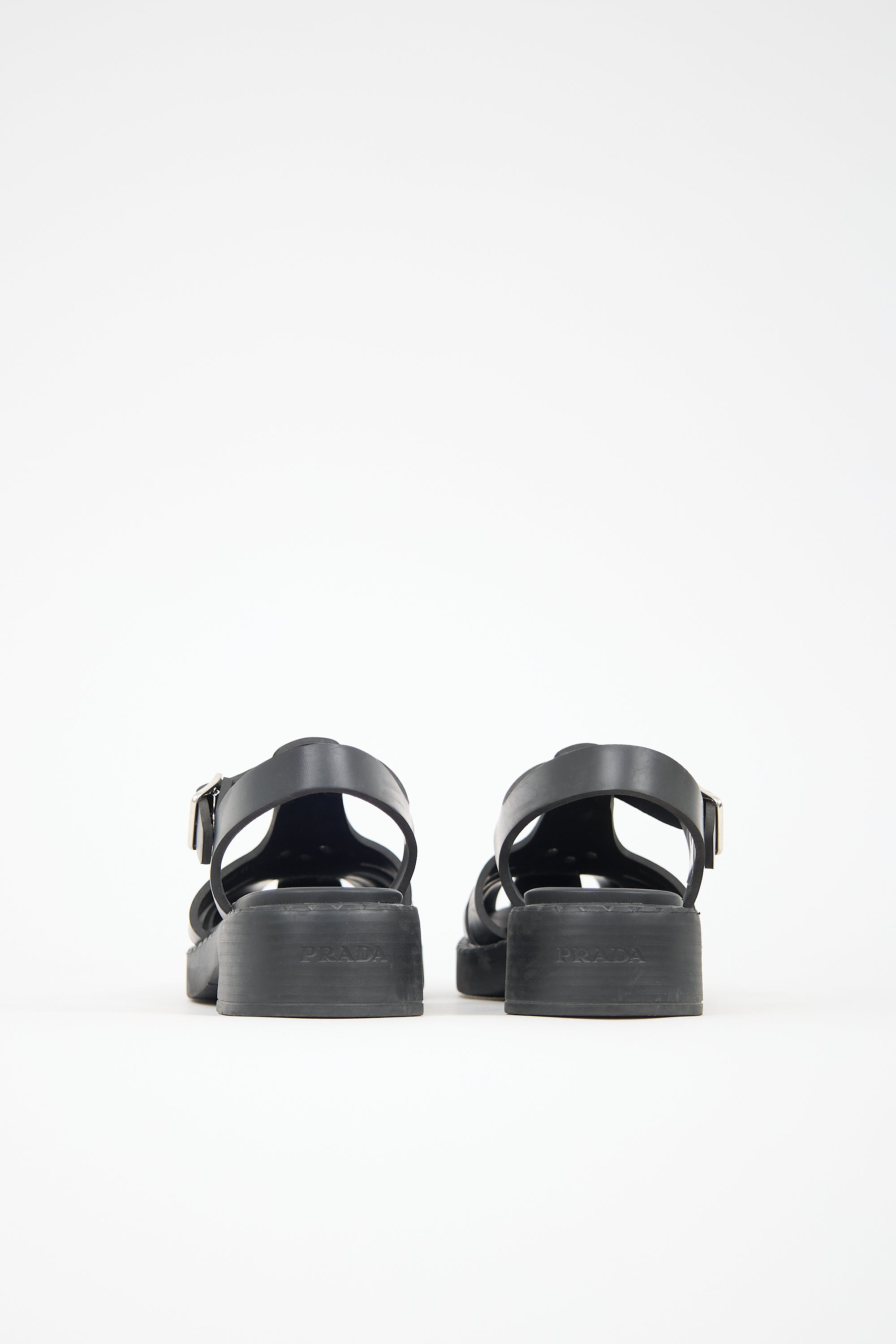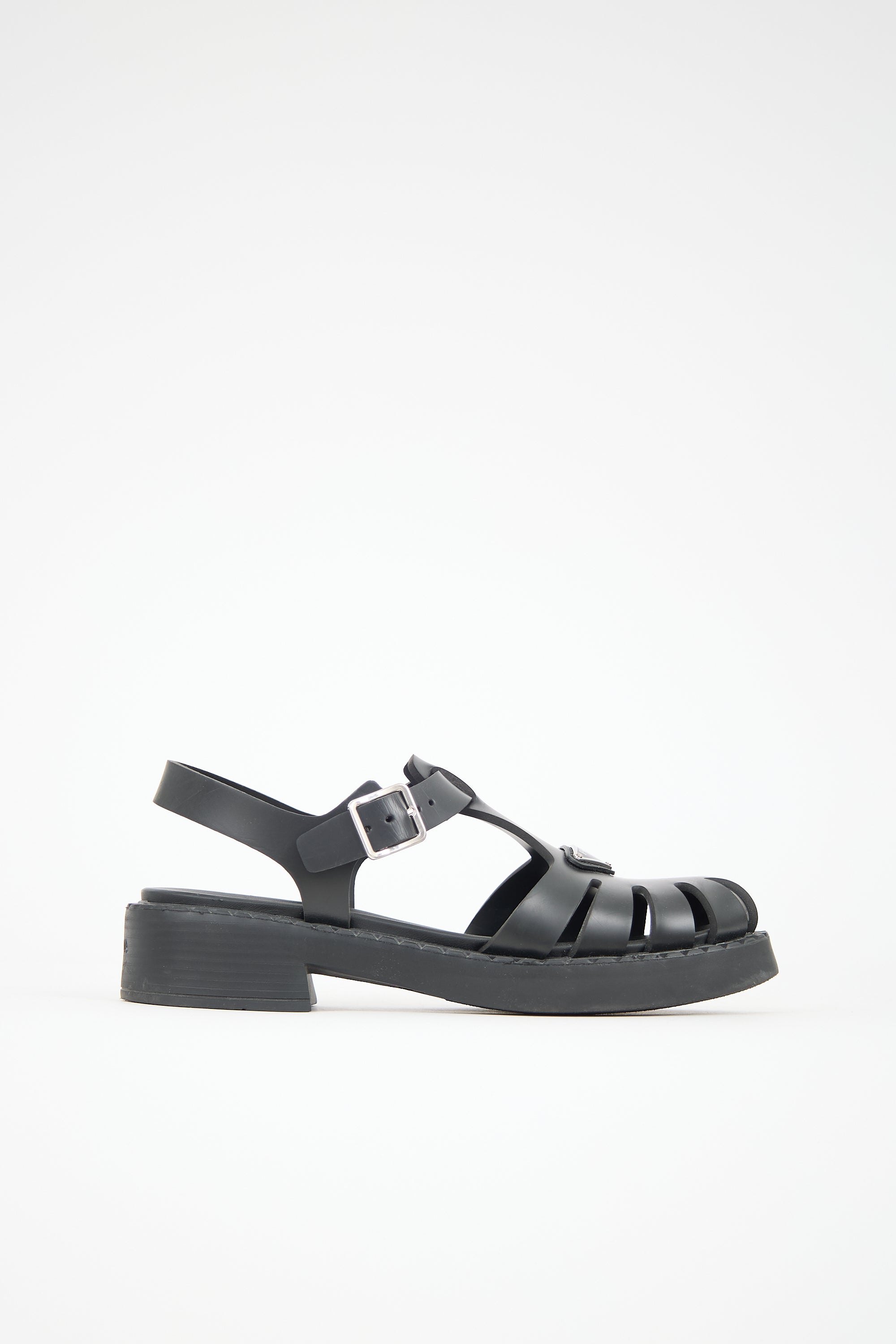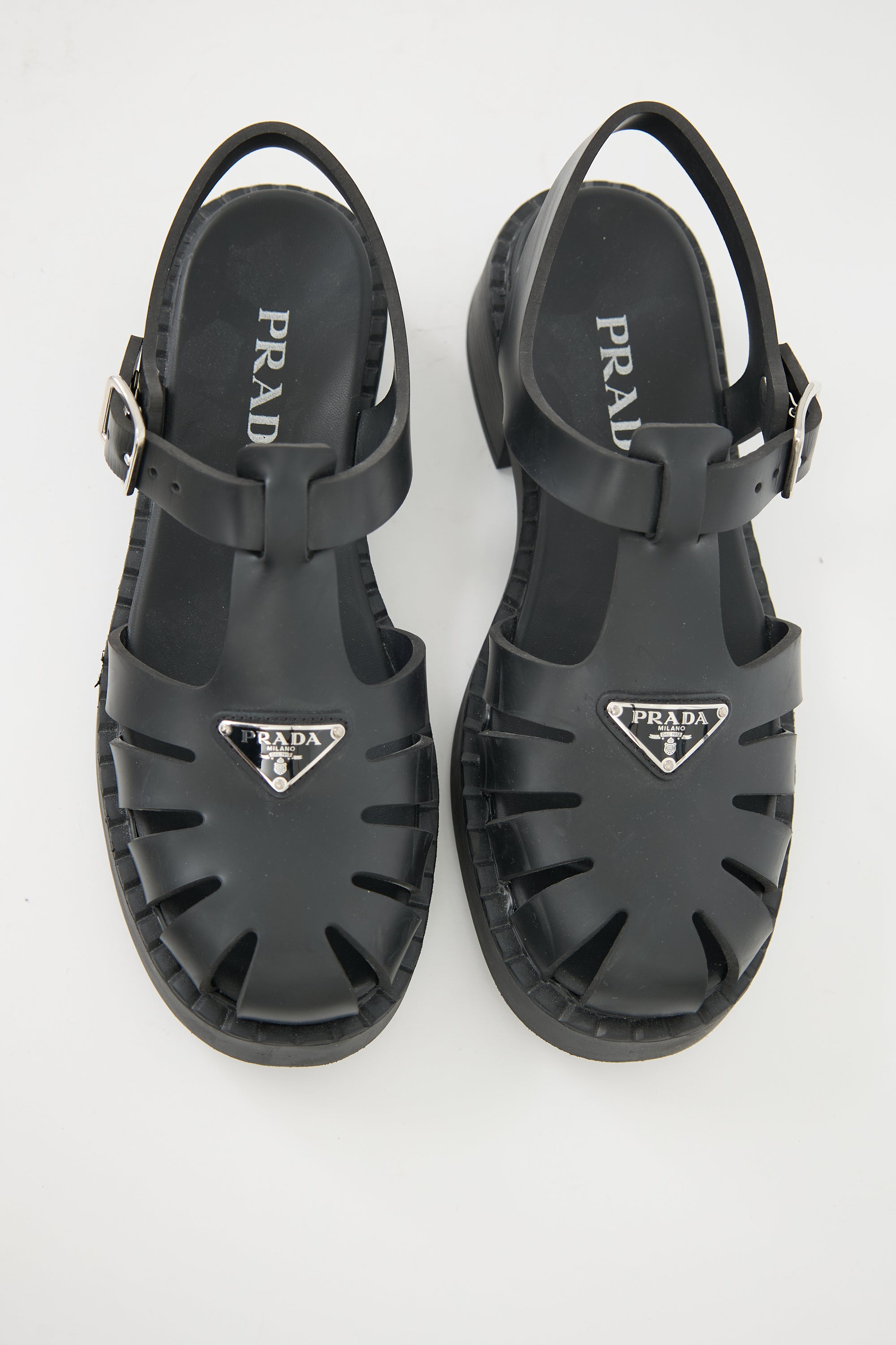 Pre-owned Prada black foam rubber sandals featuring a rounded toe, cage straps with signature triangle logo plaque at vamp, adjustable ankle strap, rubber sole, and short block heel with debossed logo.