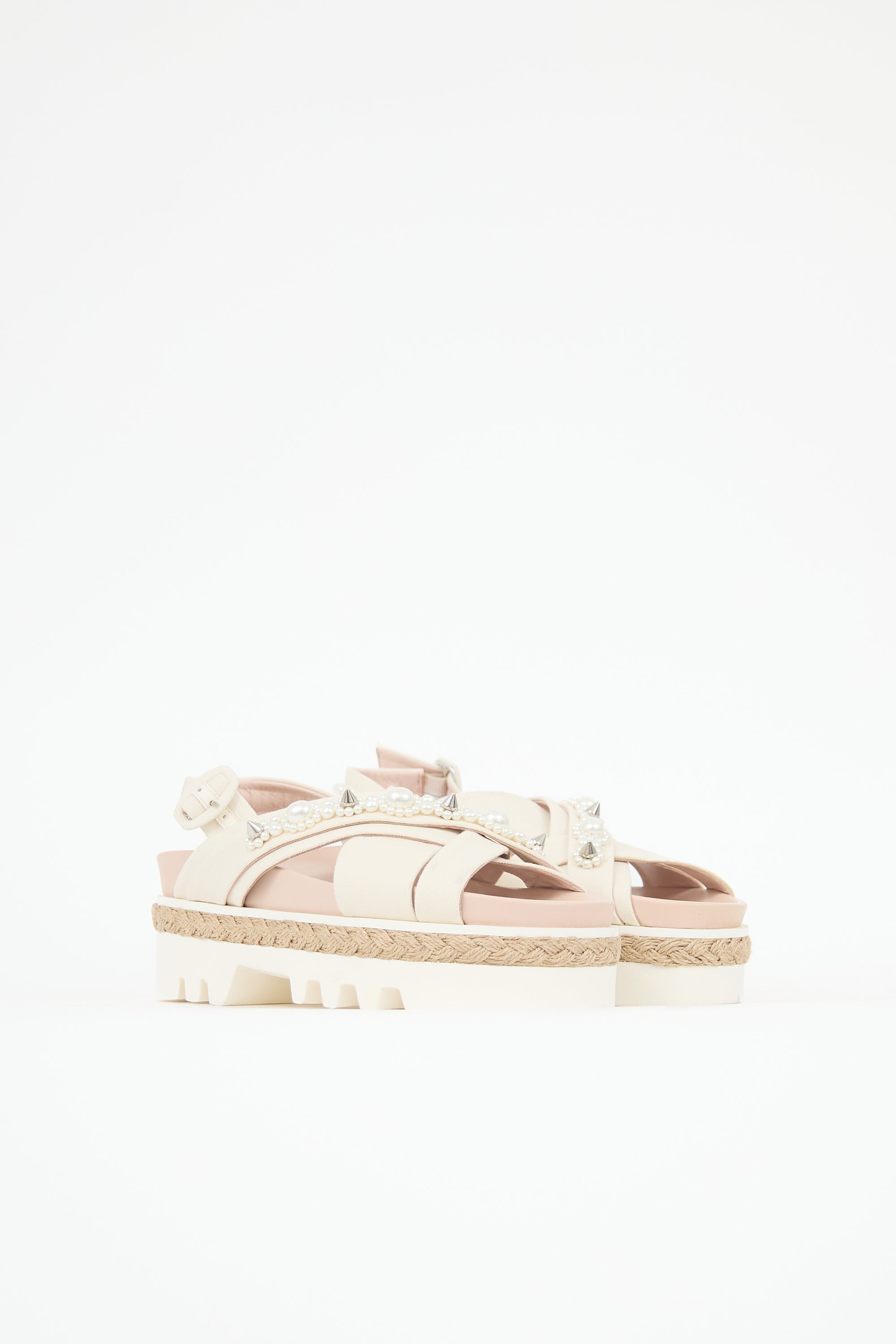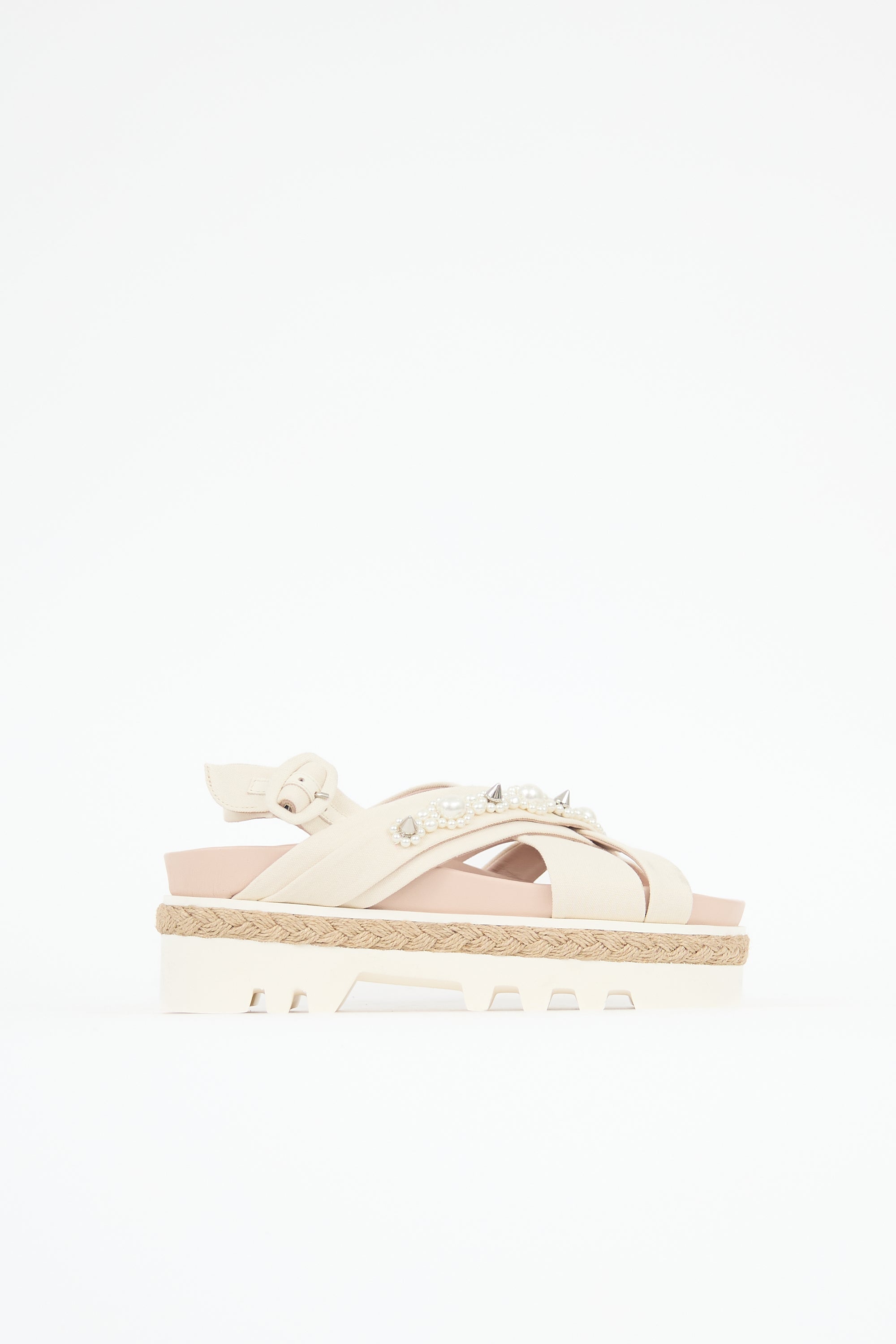Pre-owned Simone Rocha cream sandals featuring rounded toe, criss cross canvas upper with faux pearl and stud embellishments, adjustable slingback strap, beige leather footbed, and treaded rubber sole with brown braided trim.
