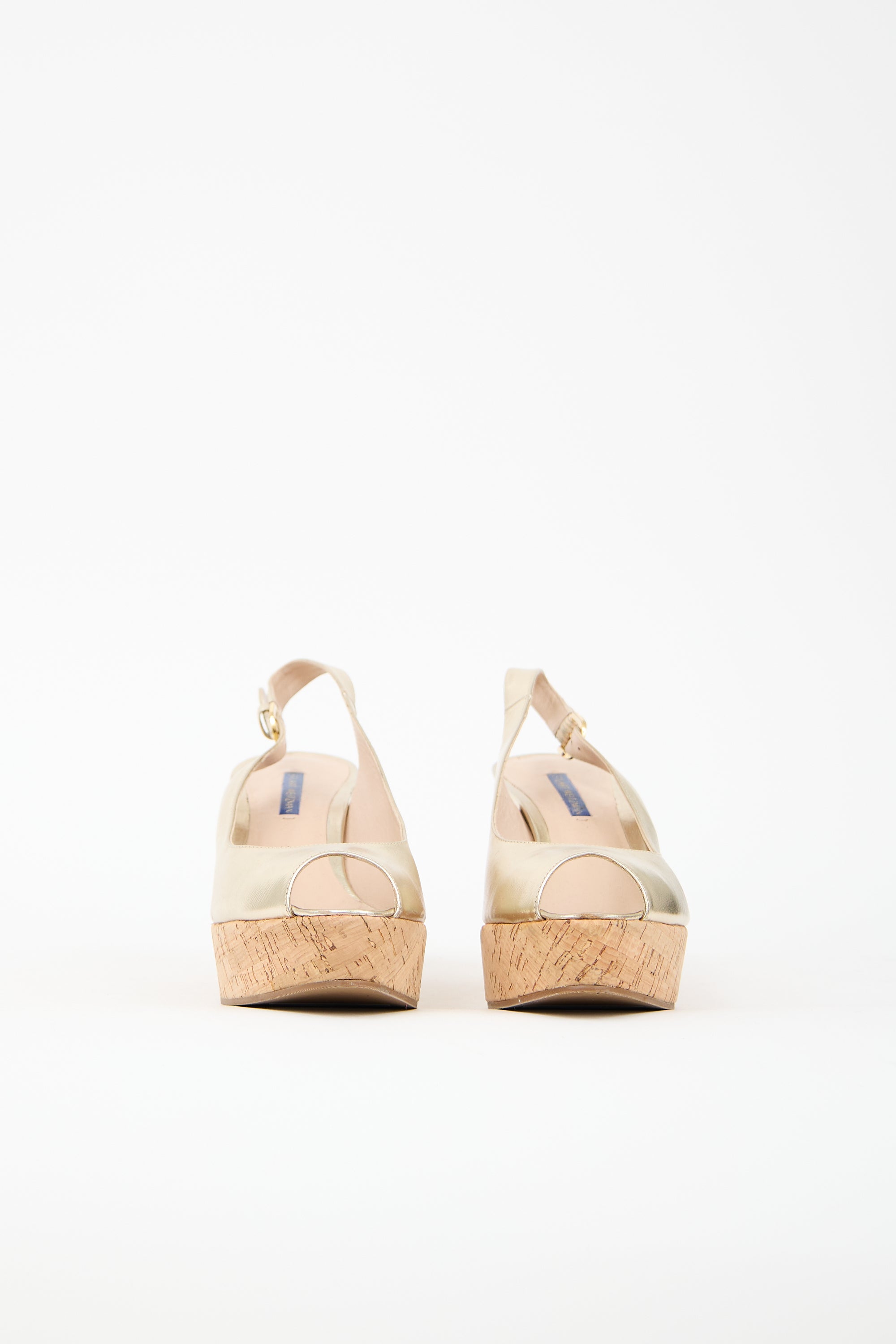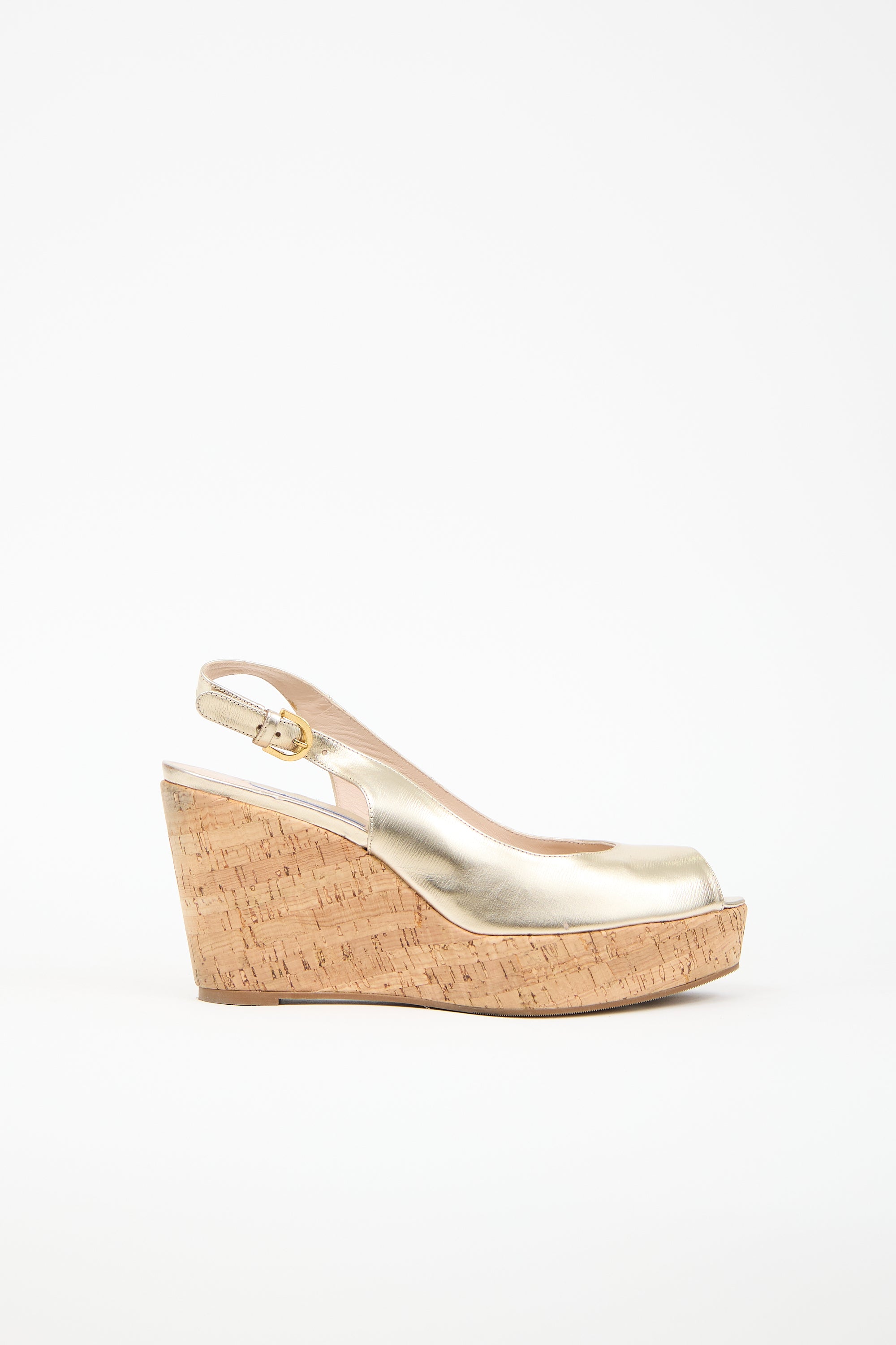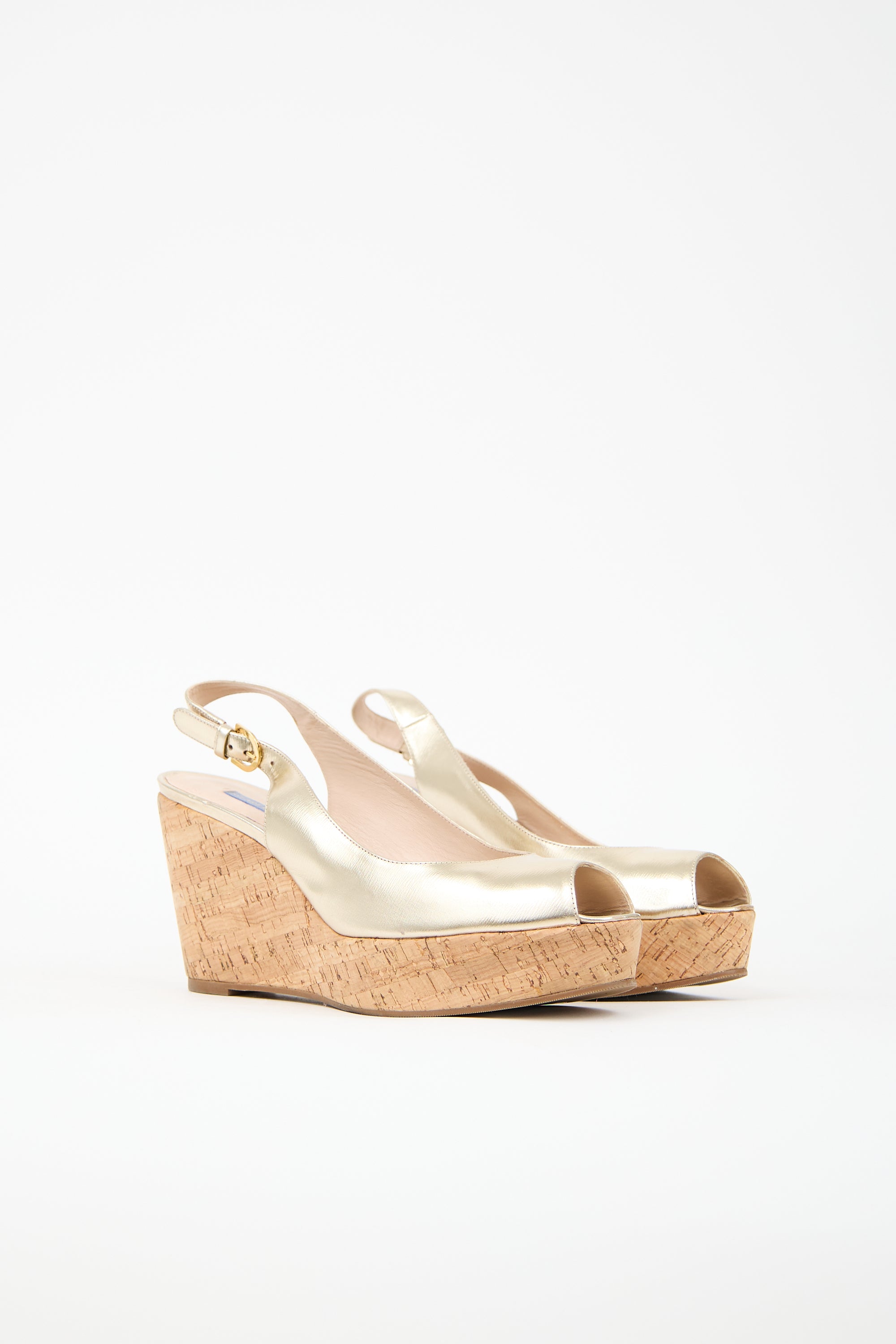 Pre-owned Stuart Weitzman gold patent leather Jean sandals featuring peep rounded toe, ankle strap with buckle closure, and cork wedge.
