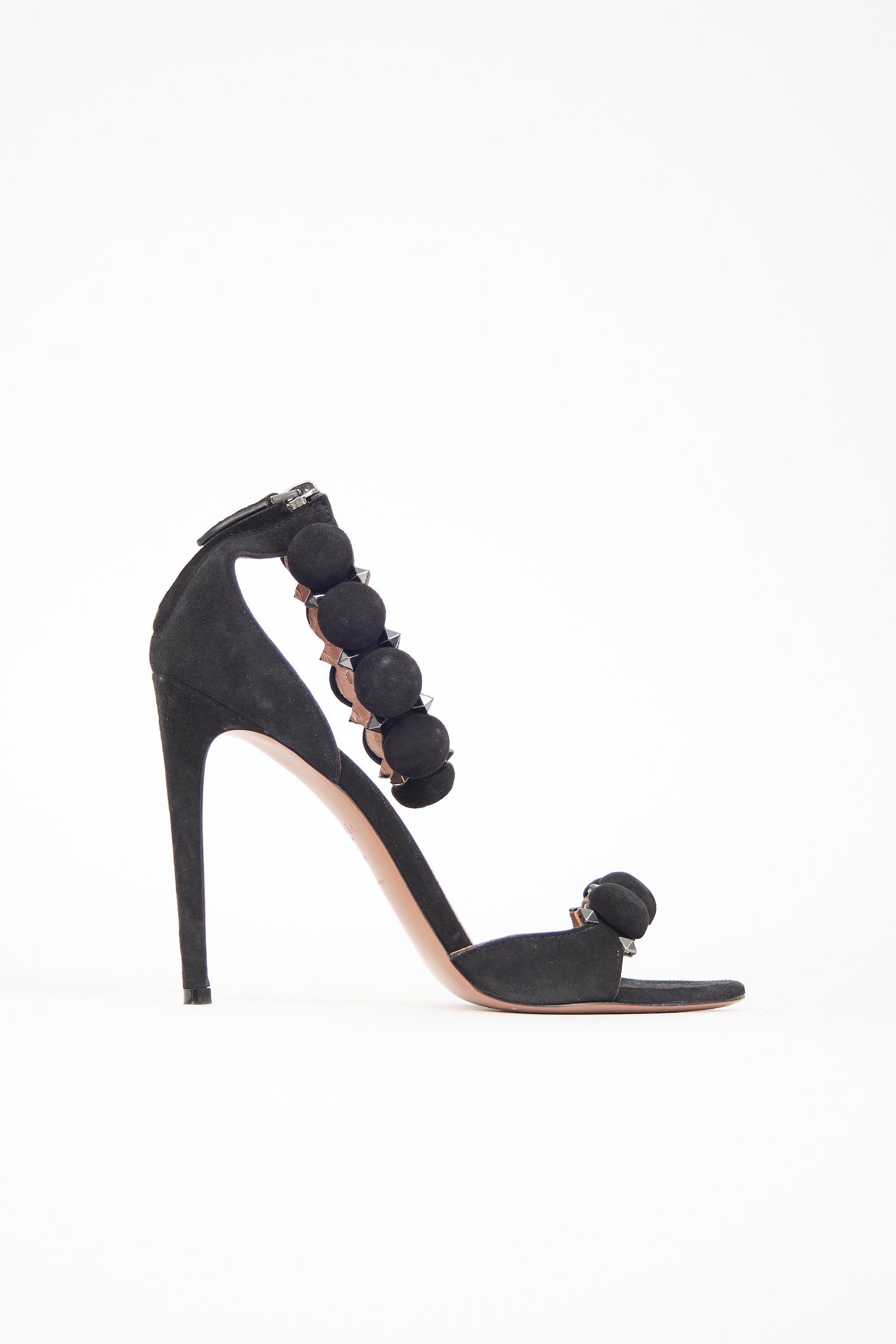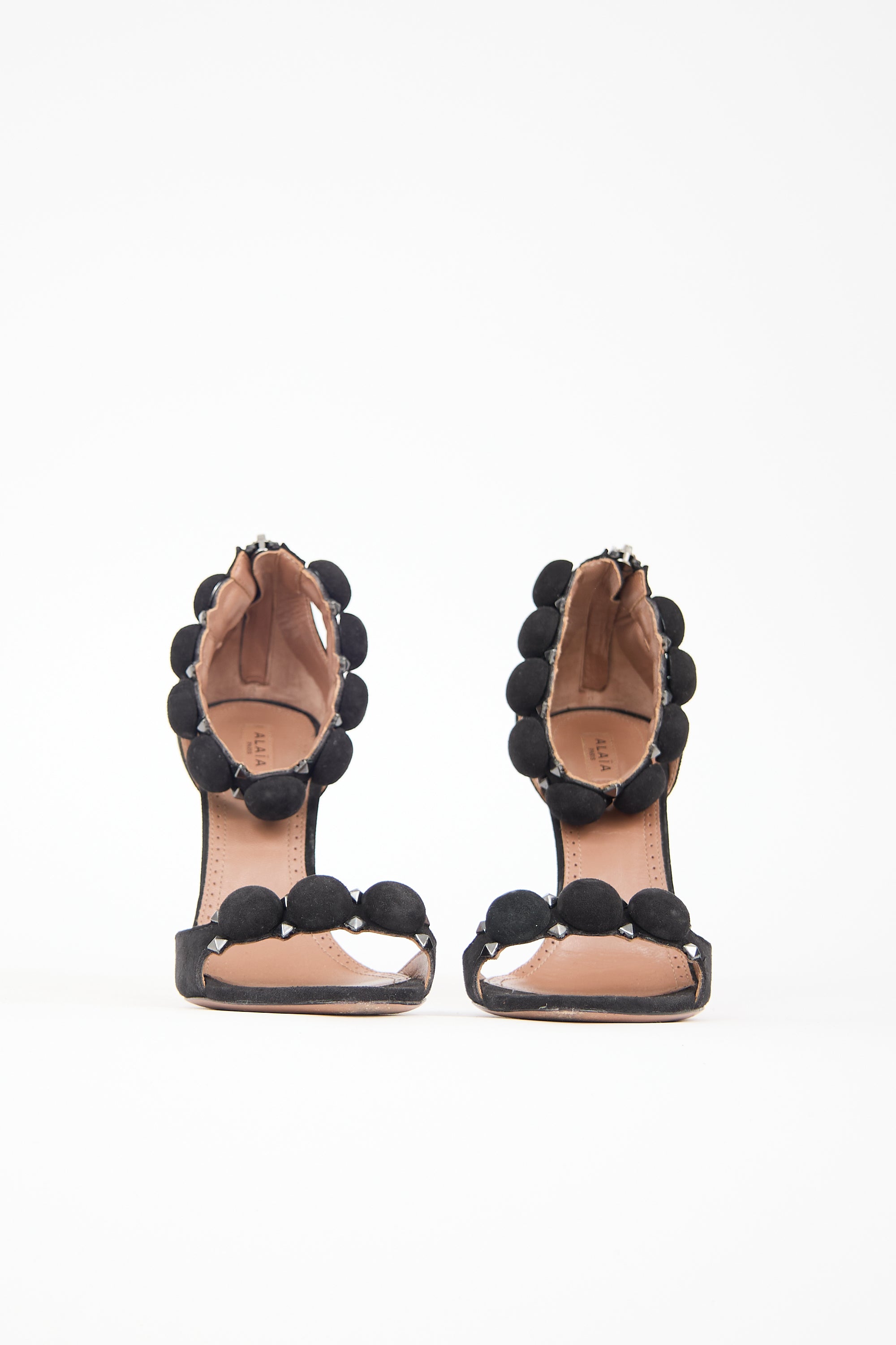 Pre-owned Alaïa black suede La Bombe sandals featuring almond toe, tonal round and gunmetal stud embellished vamp and ankle straps, back zip closure, stamped logo zipper pull, and covered stiletto heel.