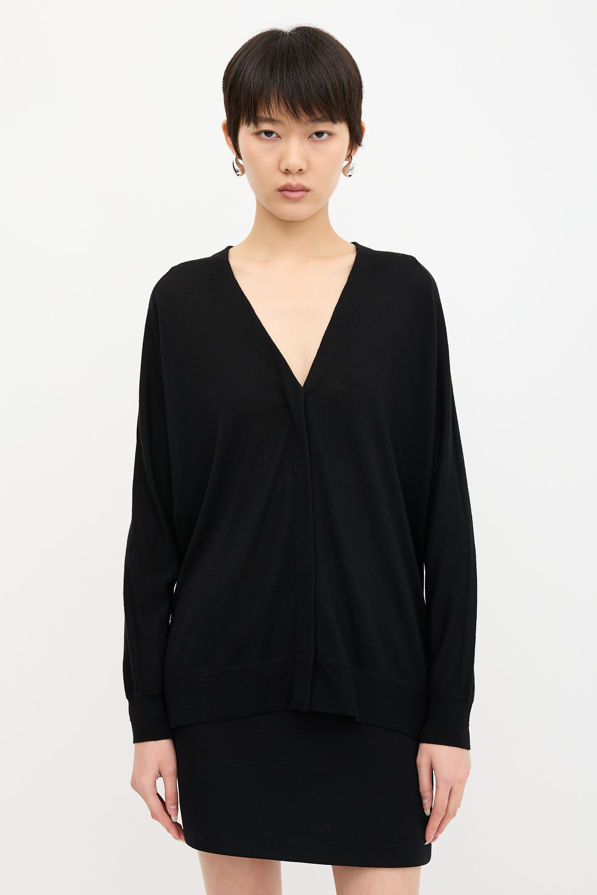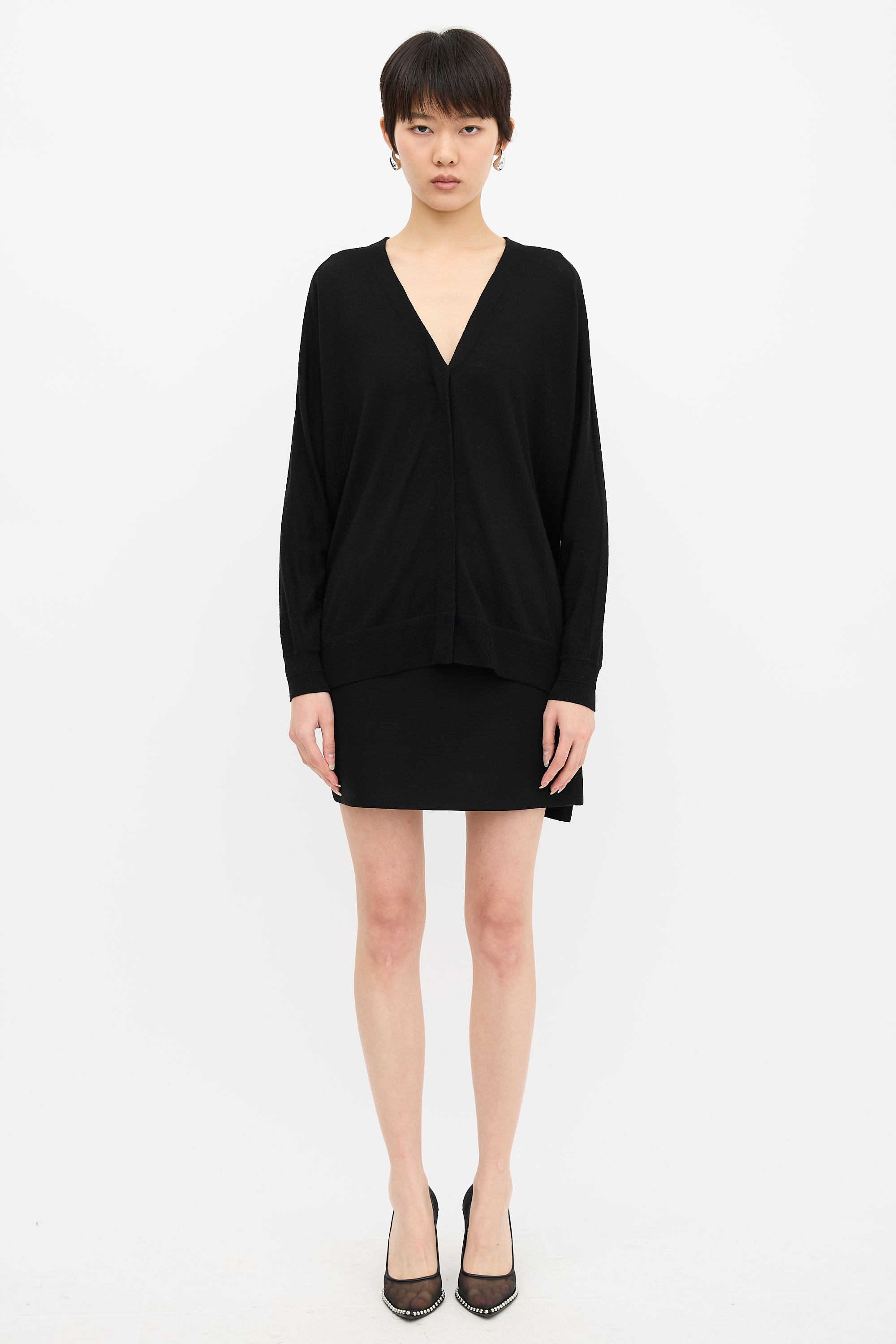 Pre-owned Alexander Wang black merino wool cardigan featuring a V-neckline, concealed button front, ribbed cuffs, and an asymmetric high low ribbed hem.