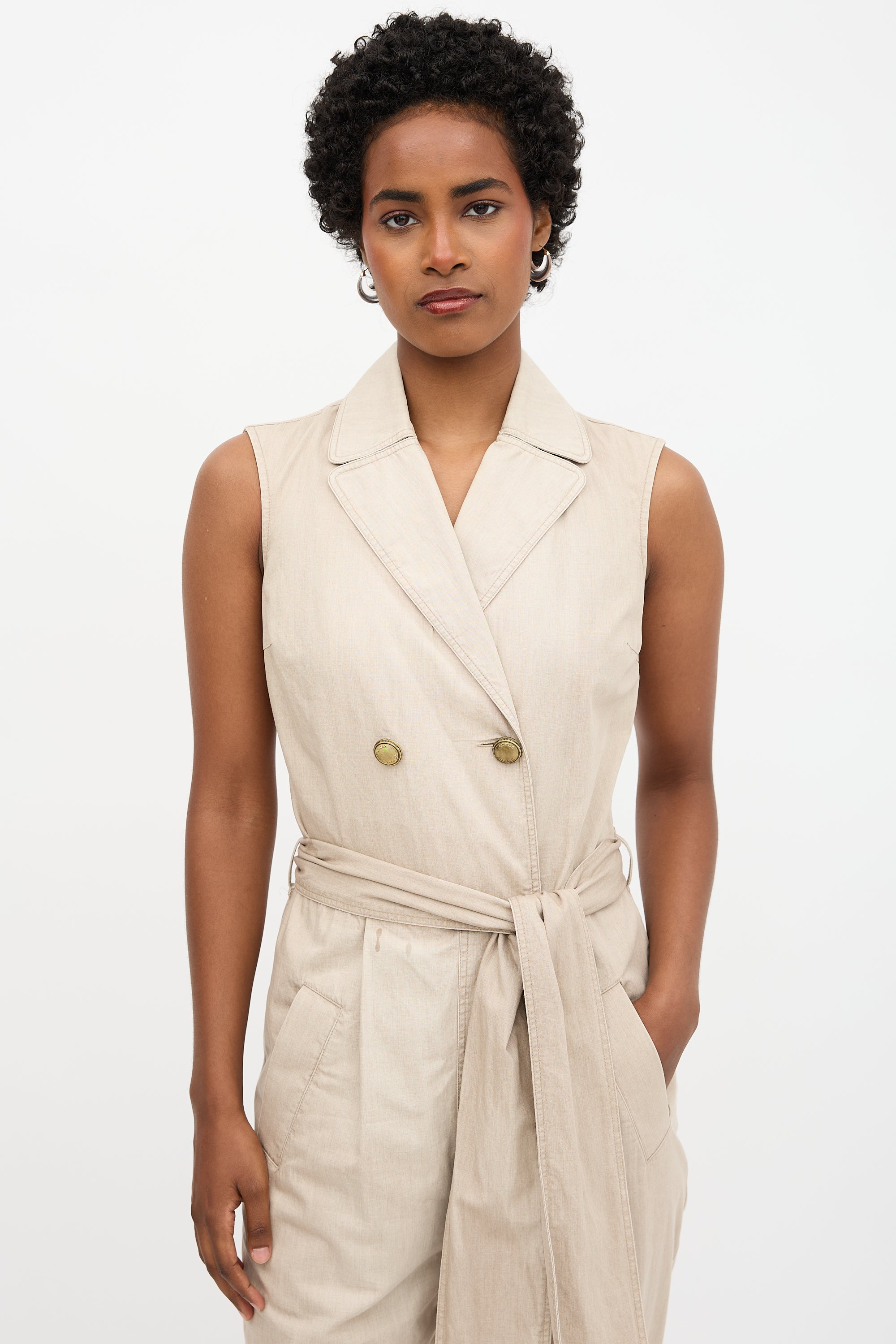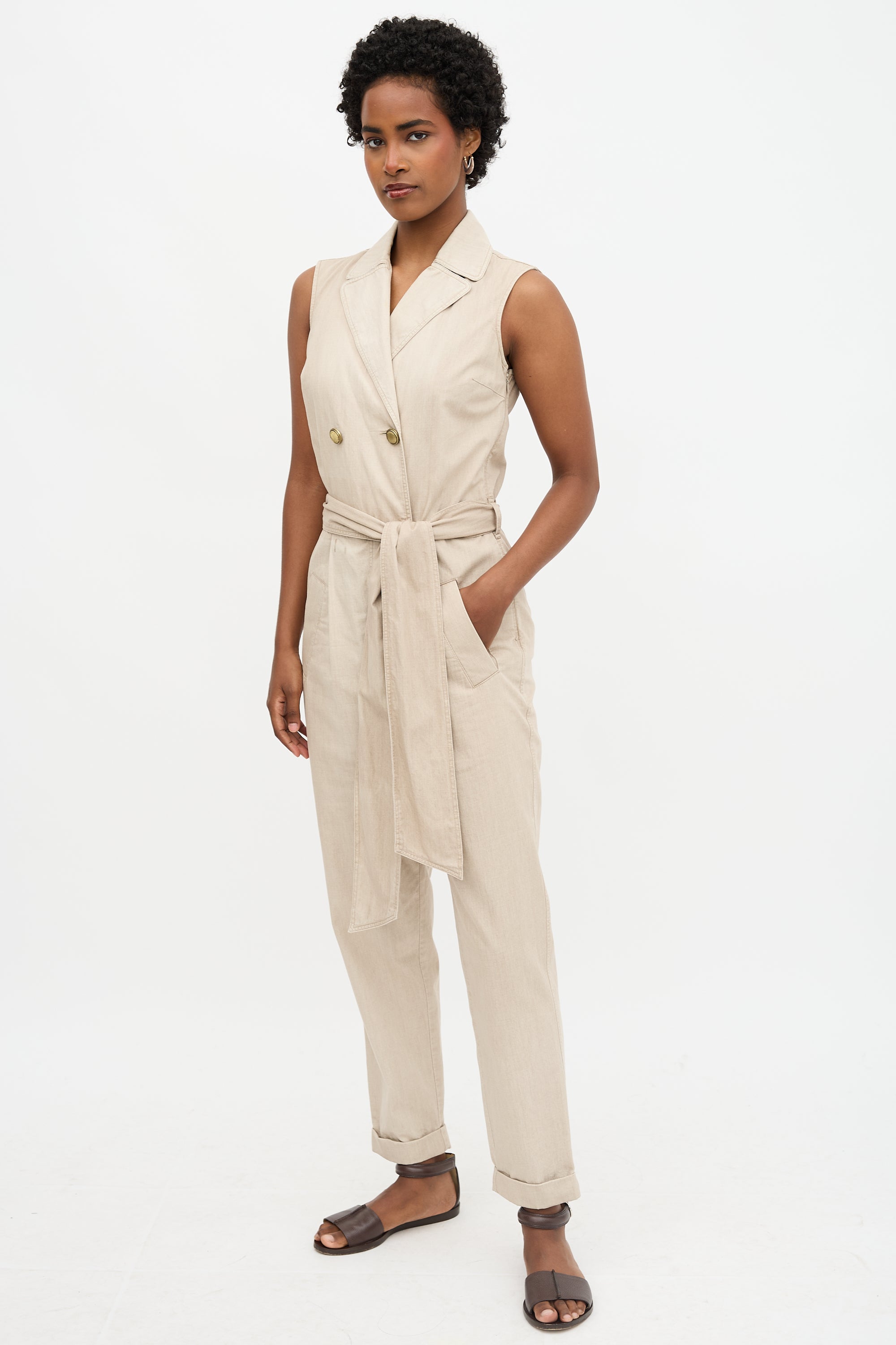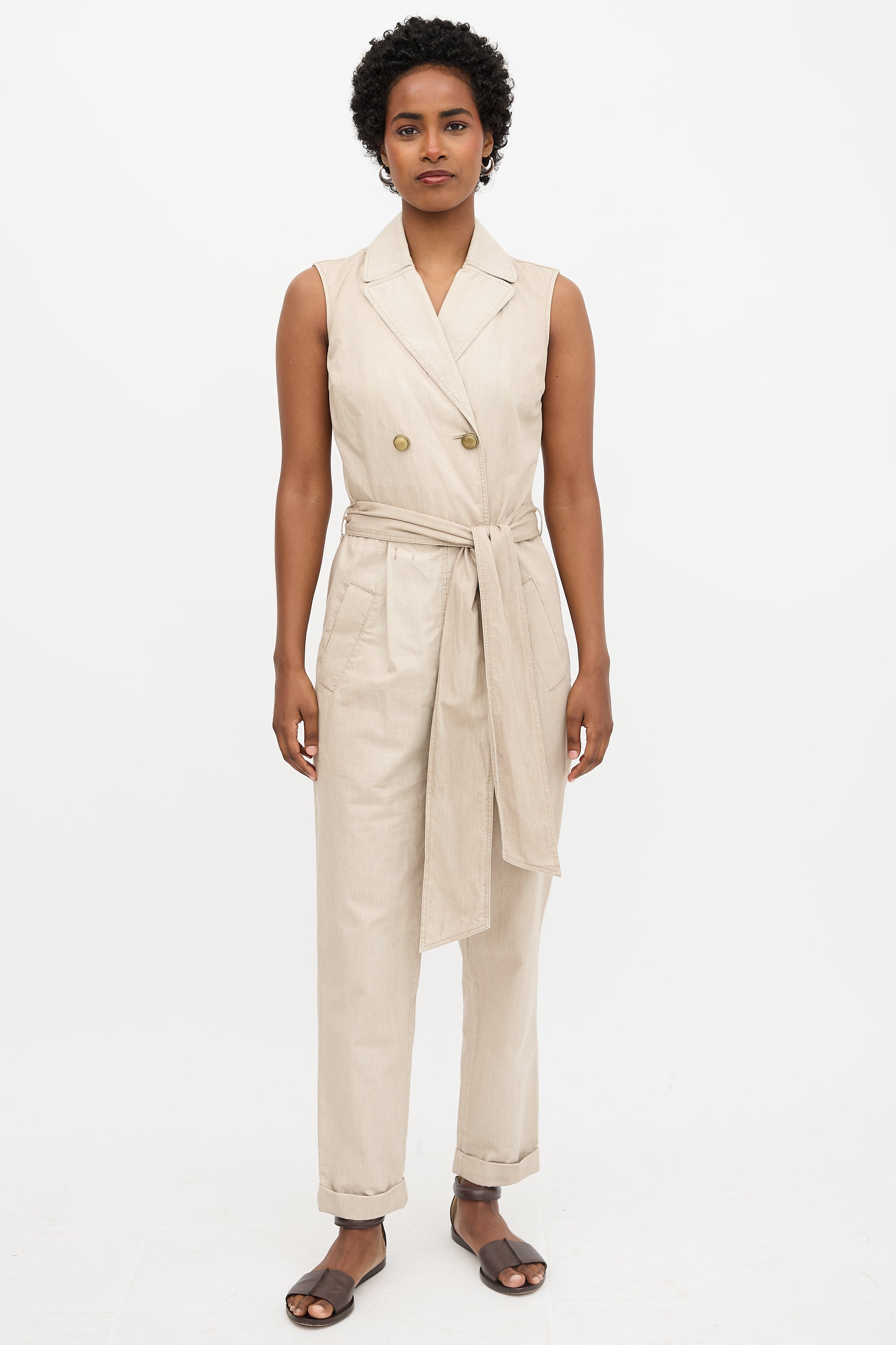 Pre-owned Brunello Cucinelli beige jumpsuit featuring a notched lapel, signature Monili beading at back collar, double breasted gold tone button front with snap button fastenings at interior, matching tie waist belt, side zip closure with hook fastening, four welt pockets, pleated waist, and a tapered leg with rolled cuffs.