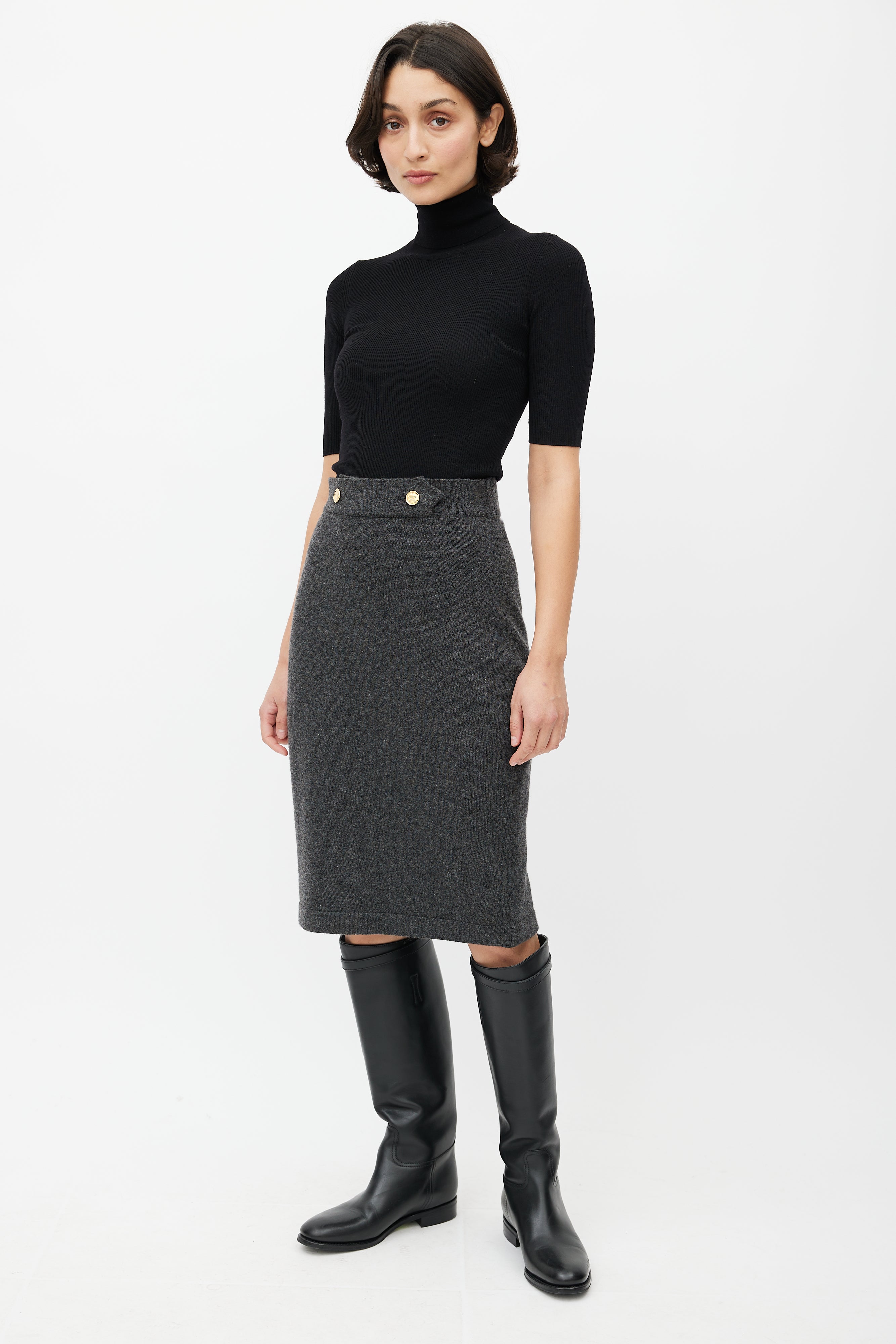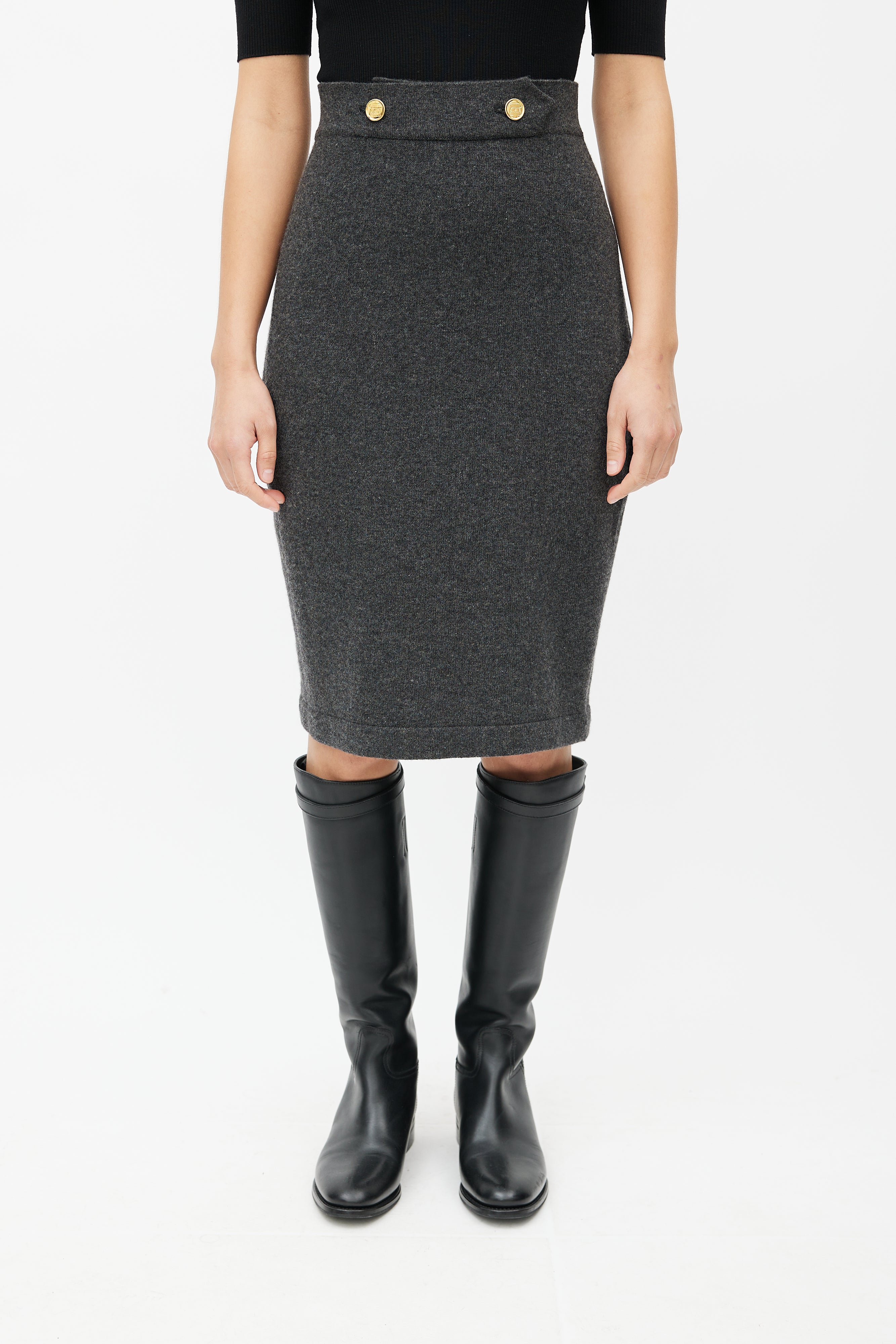 Pre-owned Vintage Chanel grey cashmere knit skirt featuring an elasticized waist, ribbed hem, and engraved gold tone button closure.