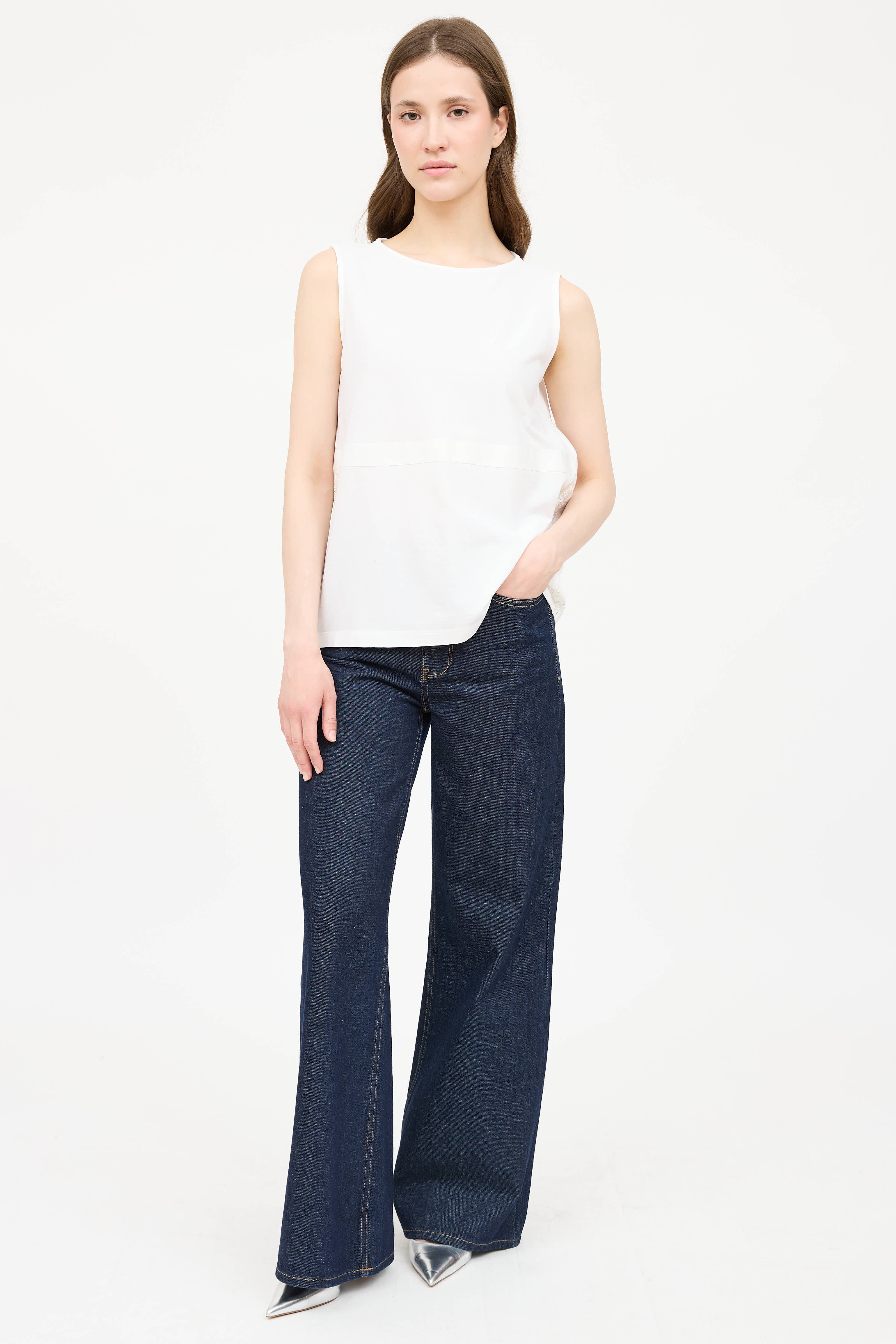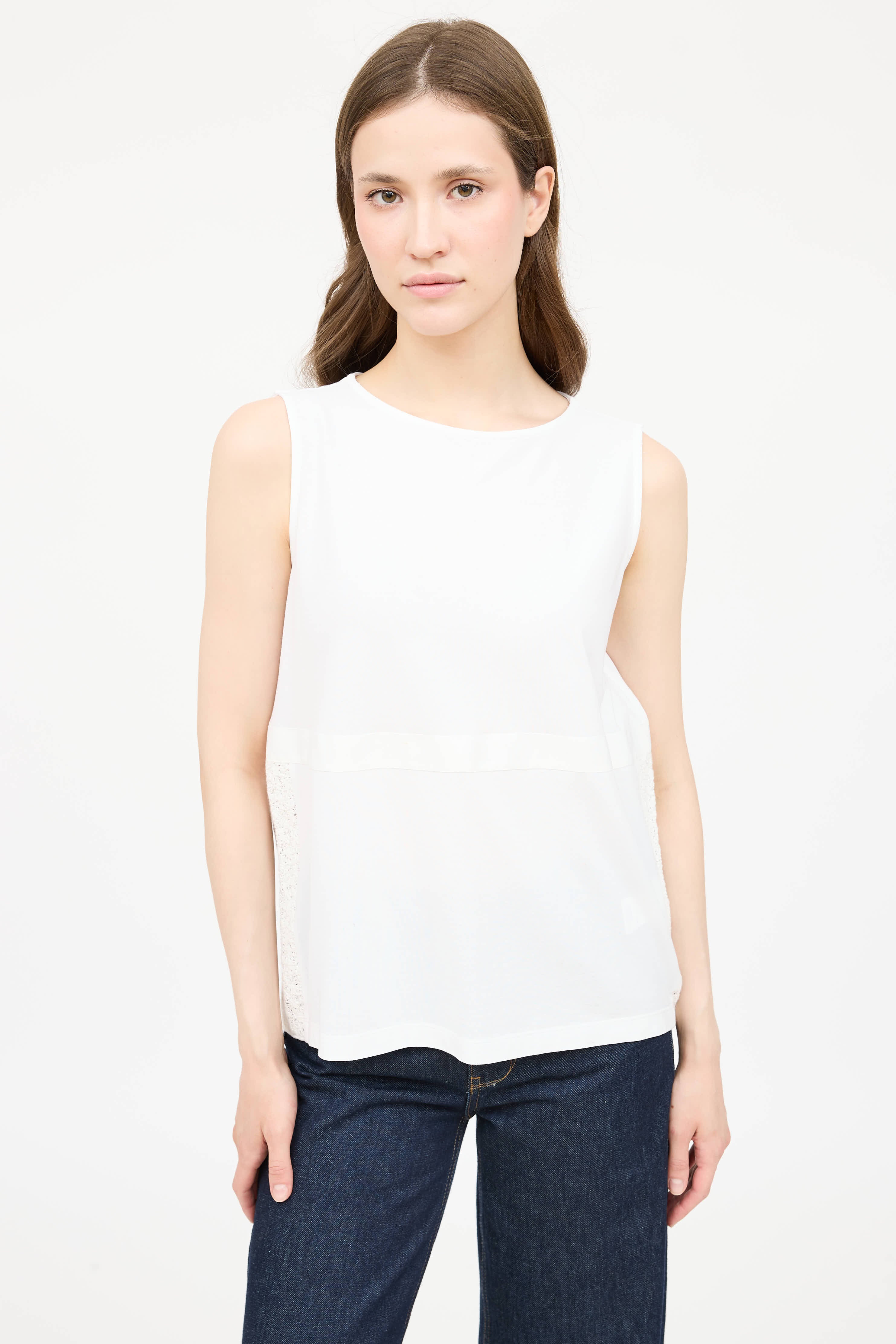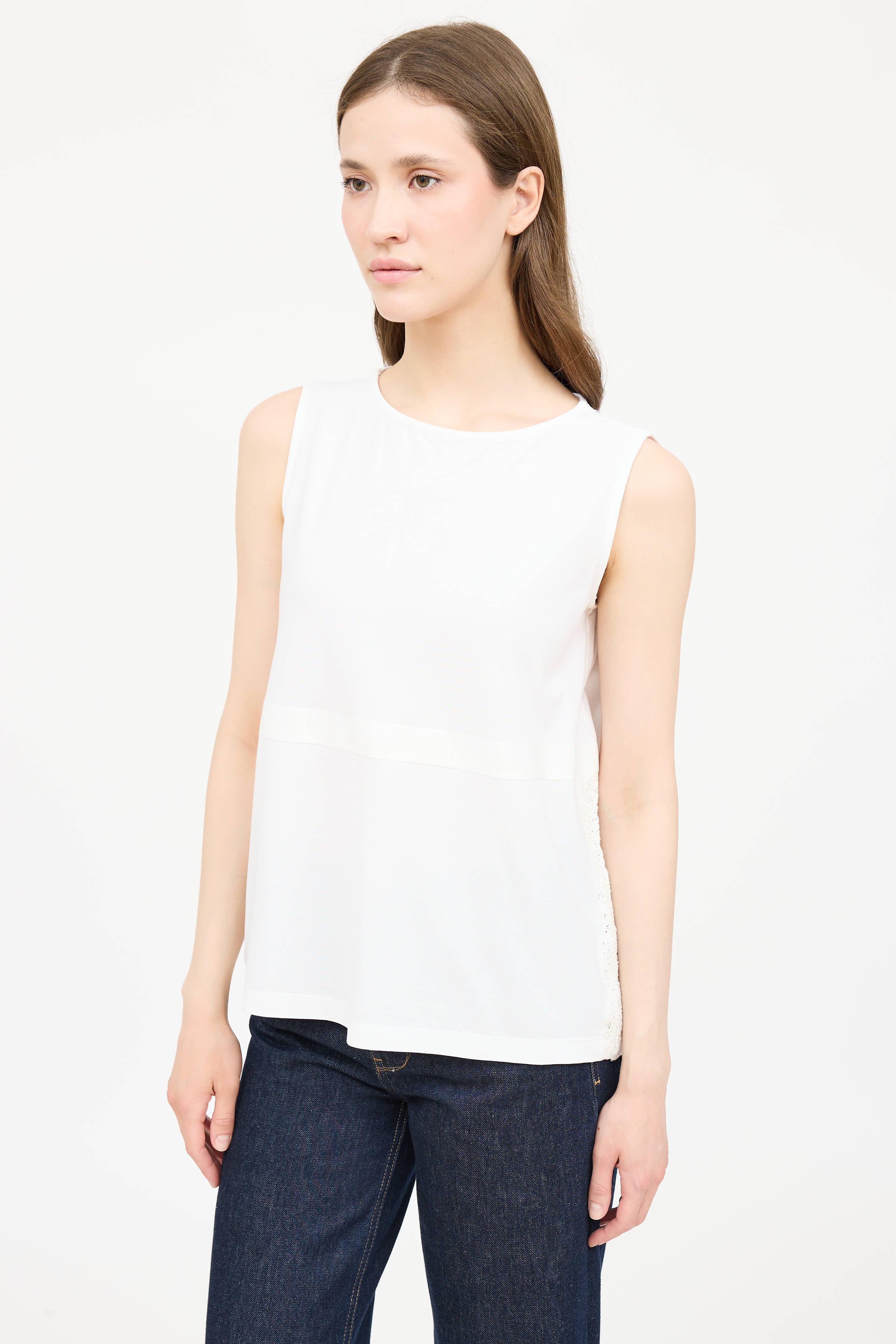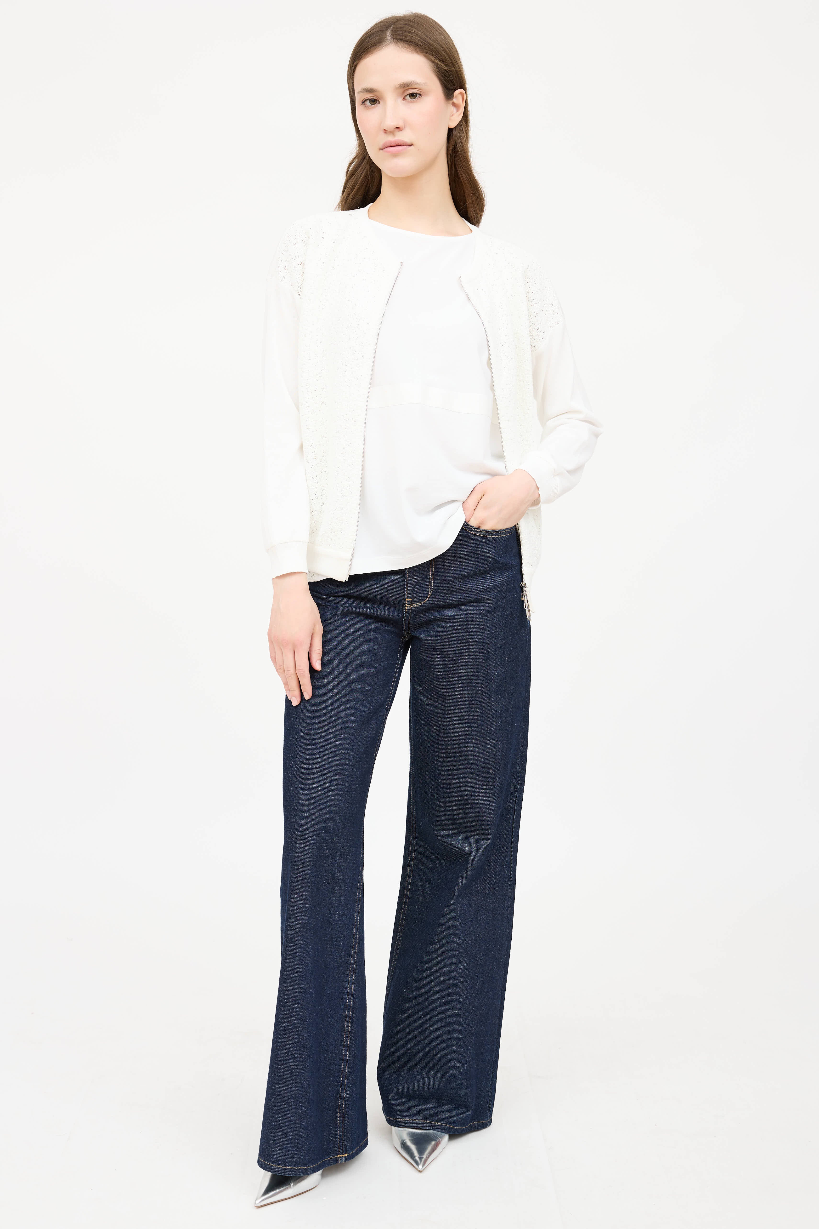 Pre-owned Fabiana Filippi white co-ord set featuring sleeveless shirt with bataeu neckline, ribbon trim at waist, and textured crochet back. Matching jacket featuring zip up front, ribbed collar, cuffs and hemline, and textured crochet at front.