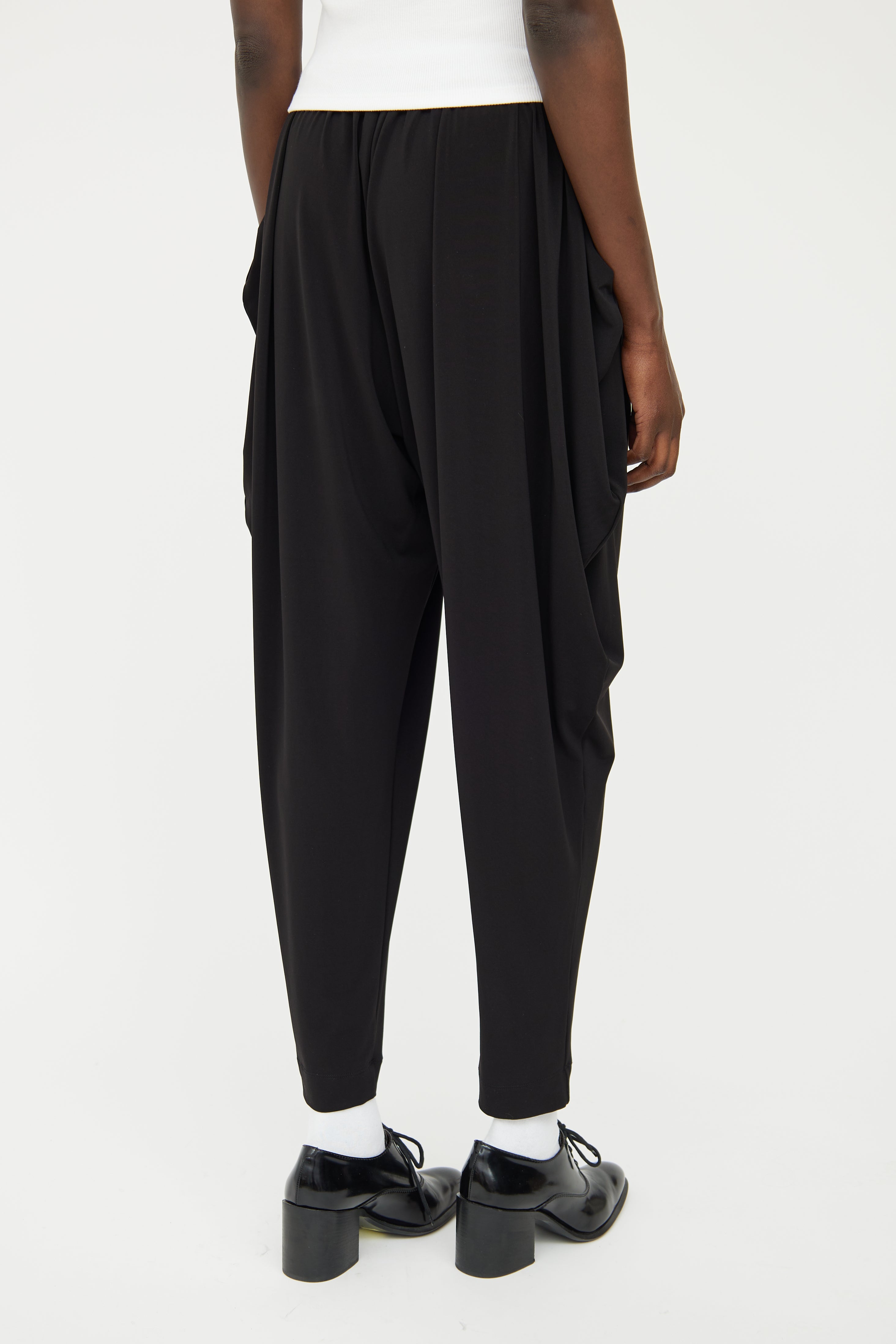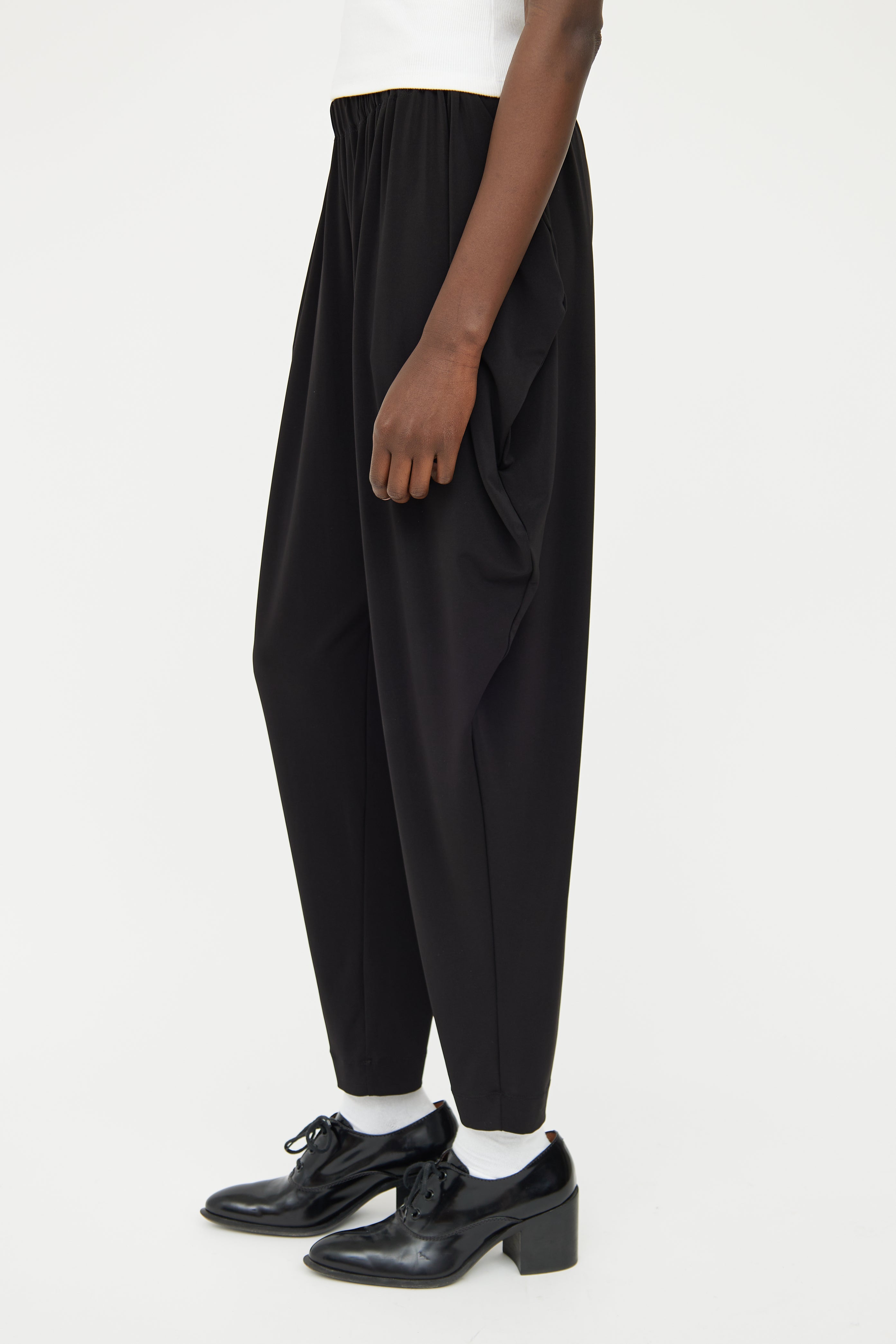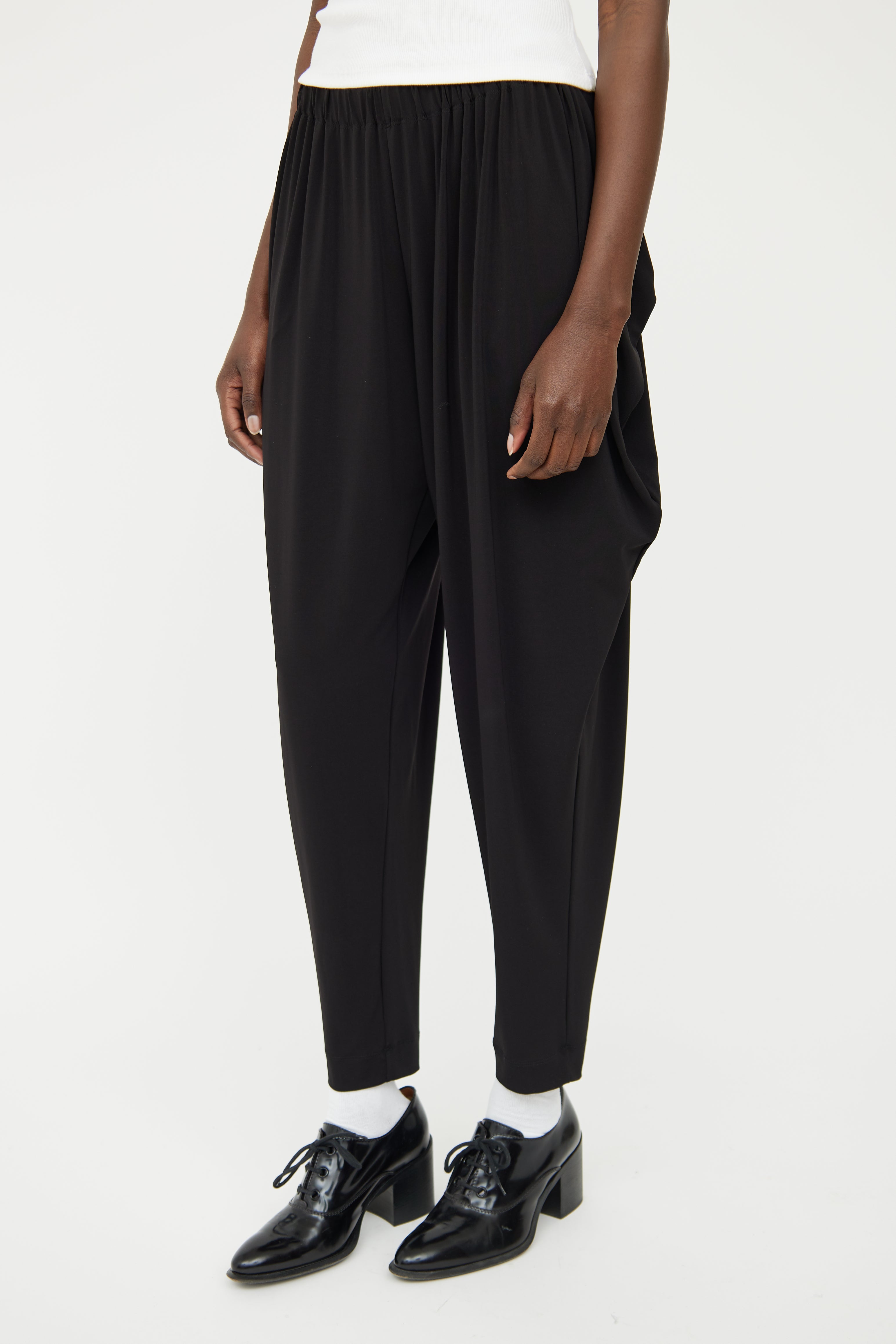 Pre-owned Issey Miyake black pants featuring elastic waist, accentuated hip, pleating throughout and skinny leg.