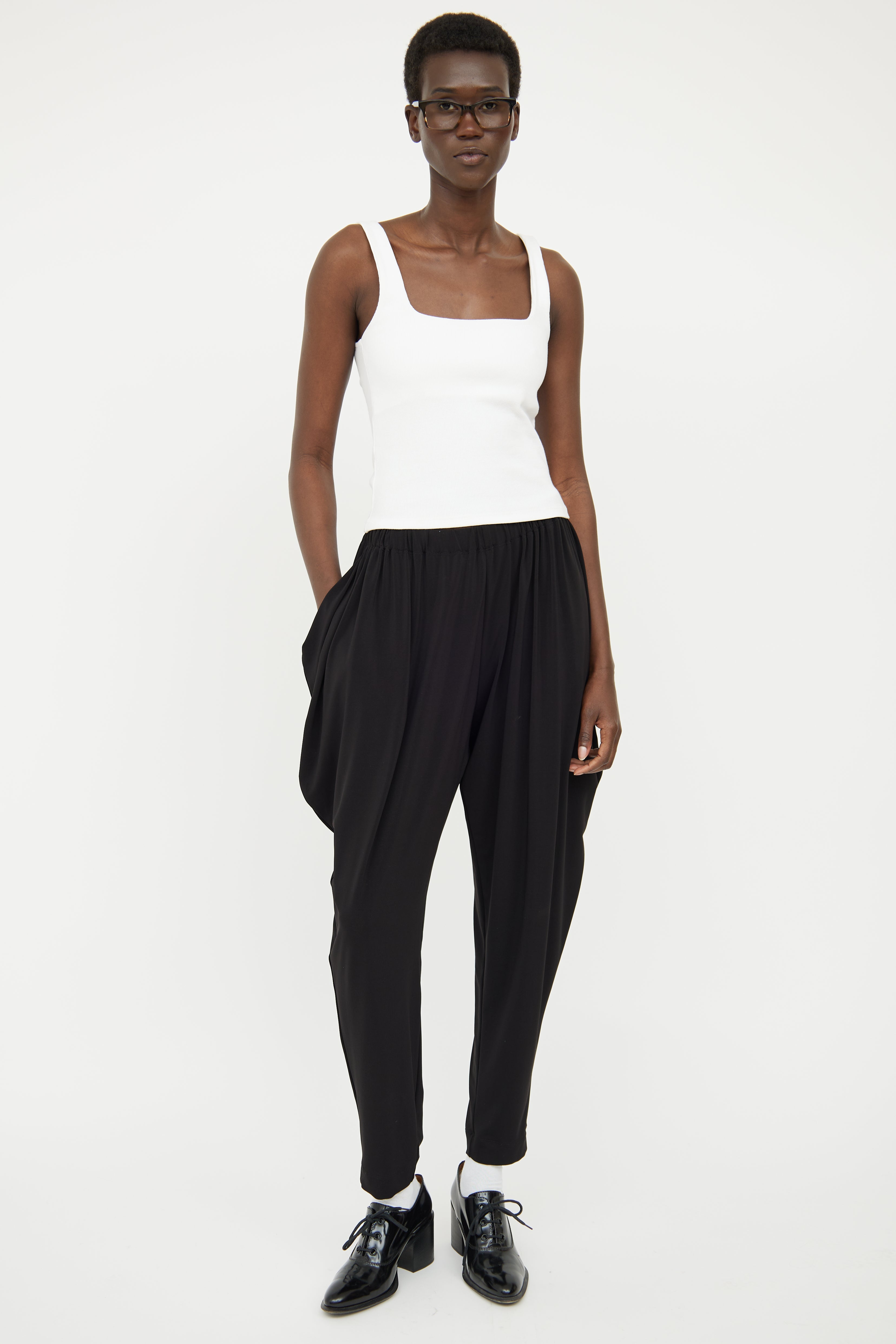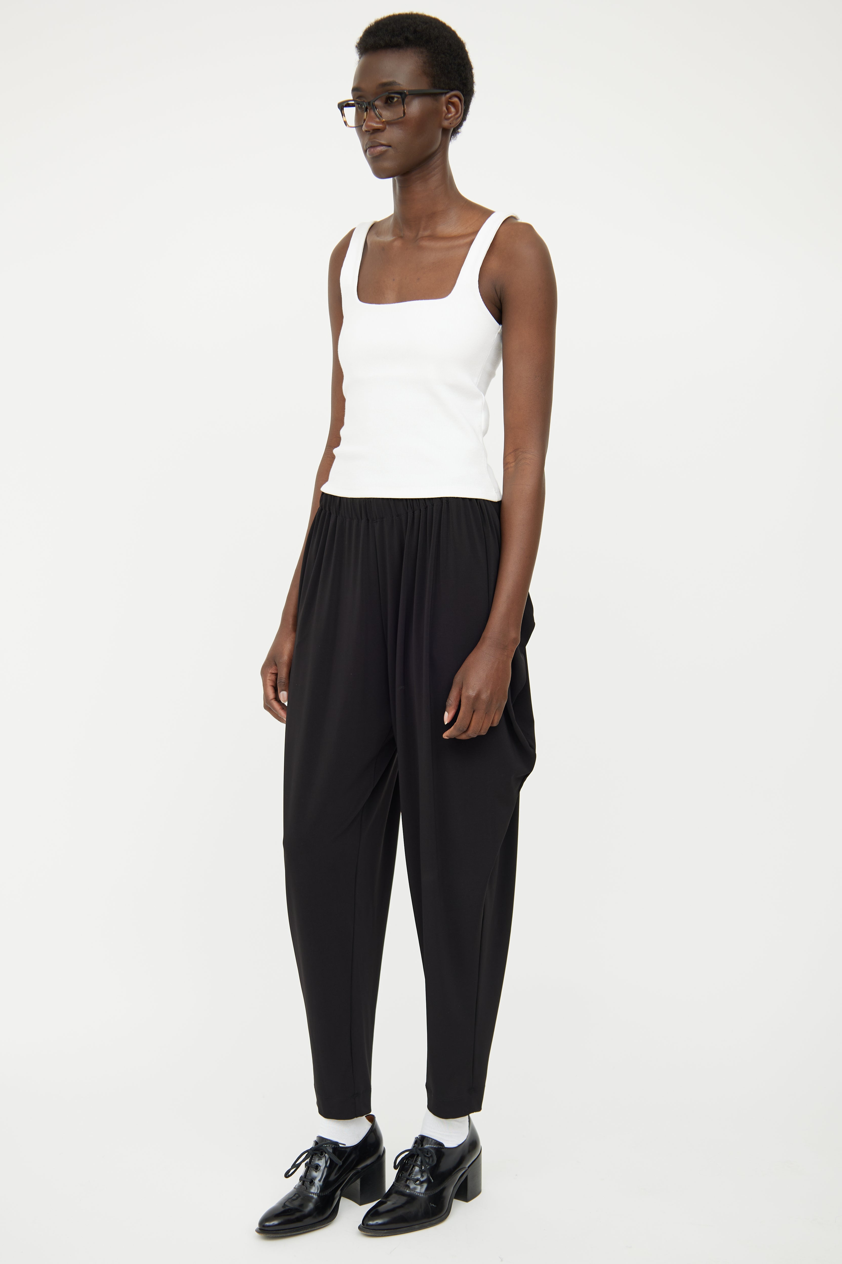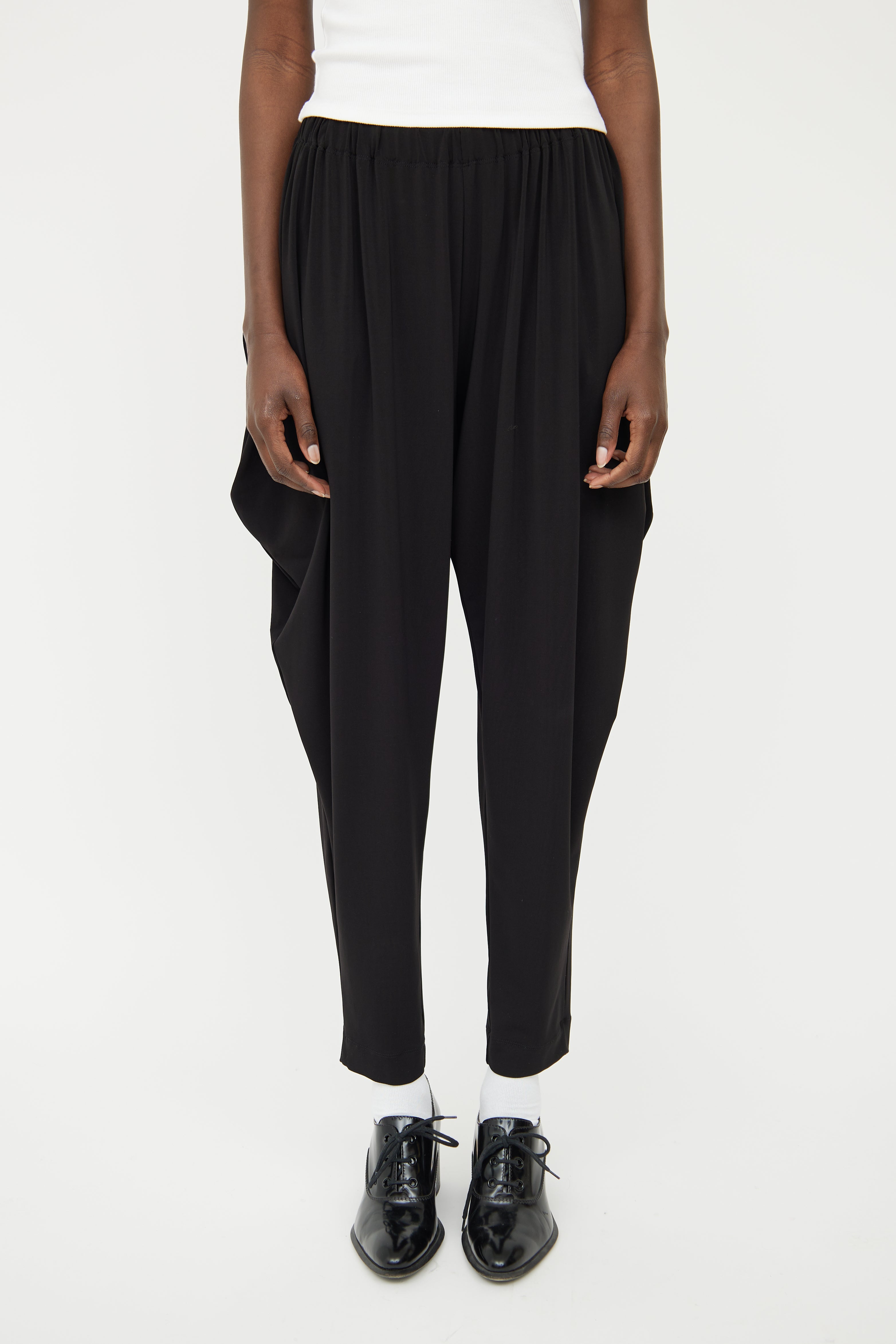 Pre-owned Issey Miyake black pants featuring elastic waist, accentuated hip, pleating throughout and skinny leg.