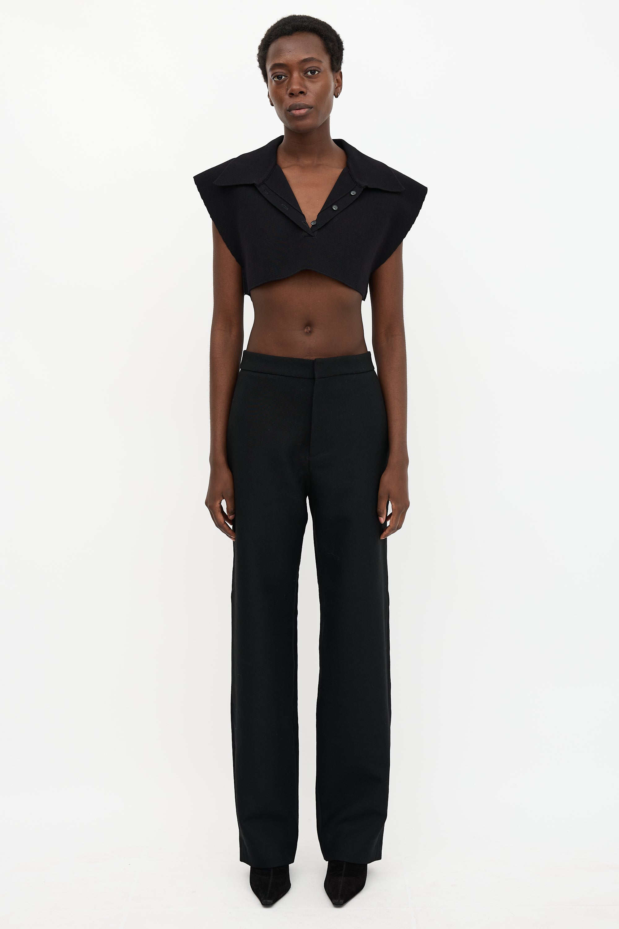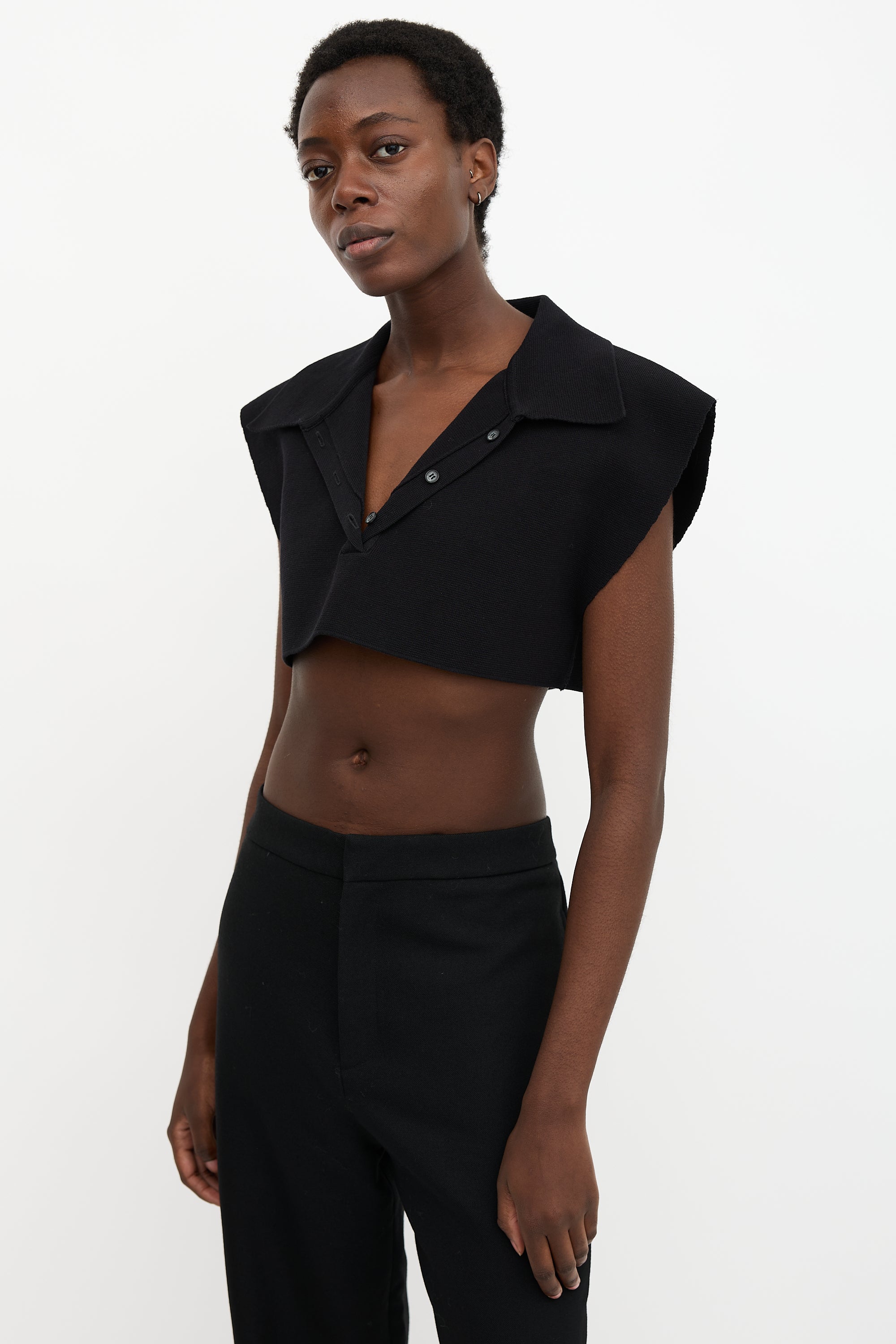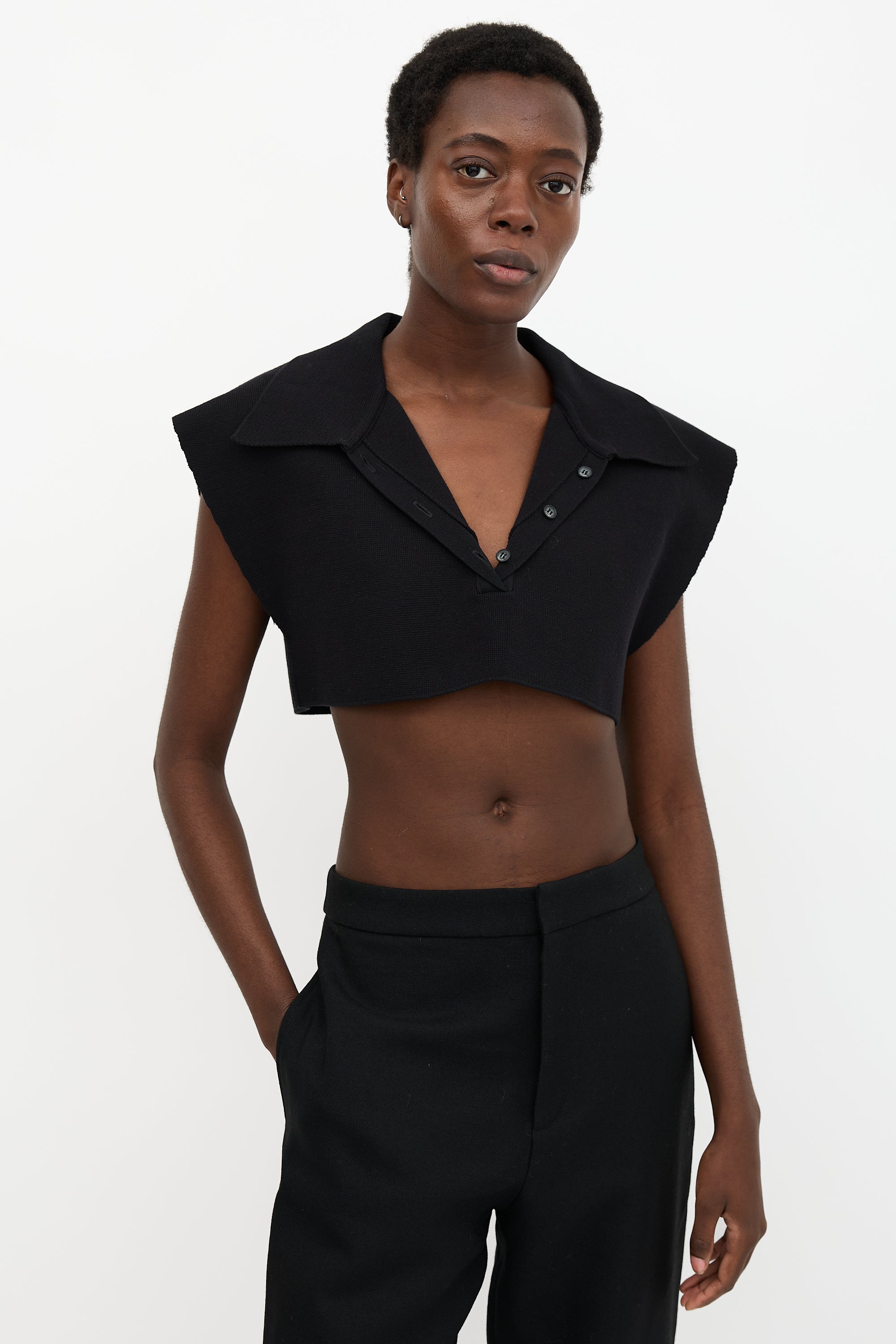 Pre-owned Jacquemus black polo featuring sleeveless styling, Johnny collar, fixed open placket, and cropped hem.