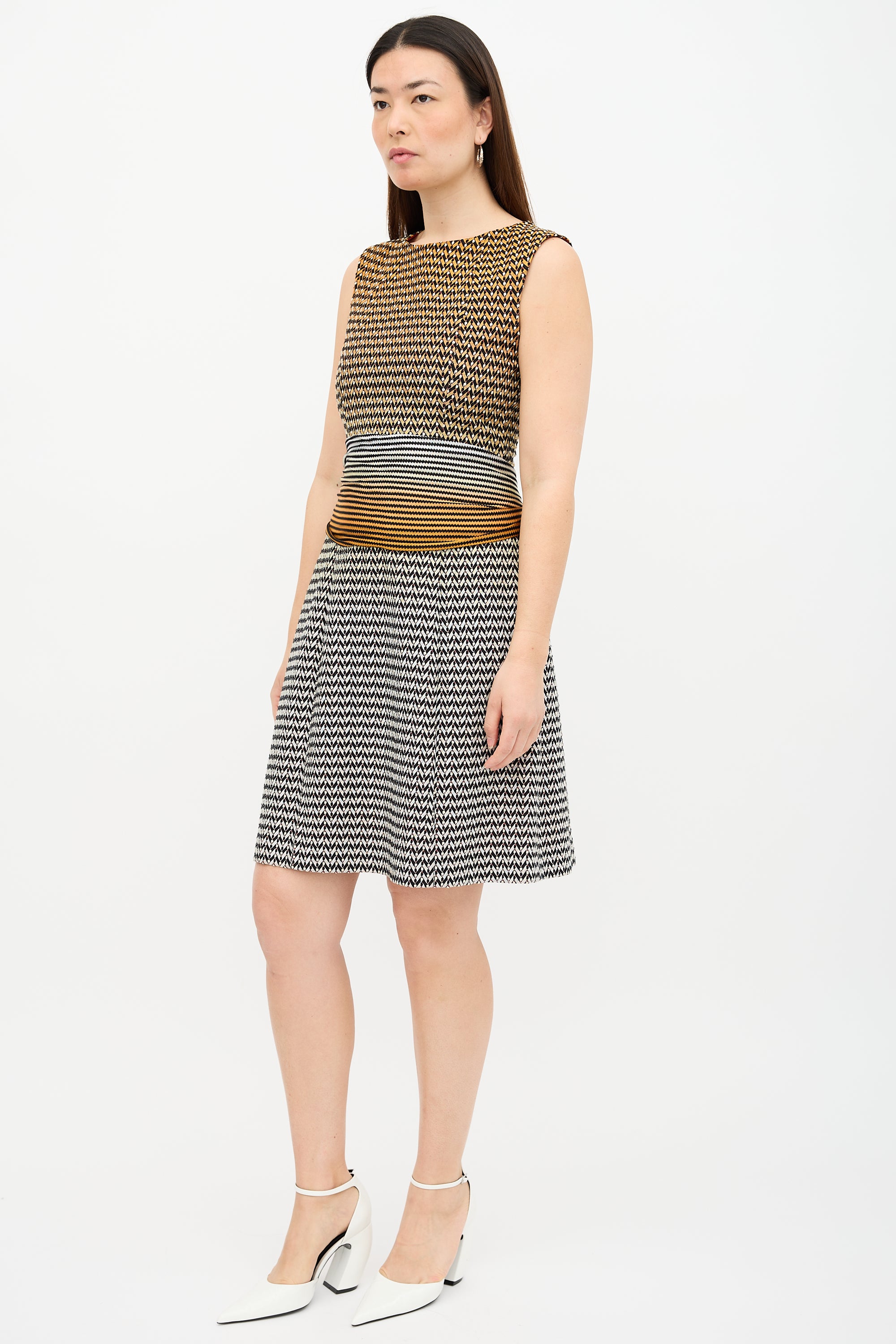 Pre-owned Missoni knit dress featuring orange and white gradient, chevron intarsia, round neckline, knit striped tie belt or scarf, and concealed side zip. Lined.