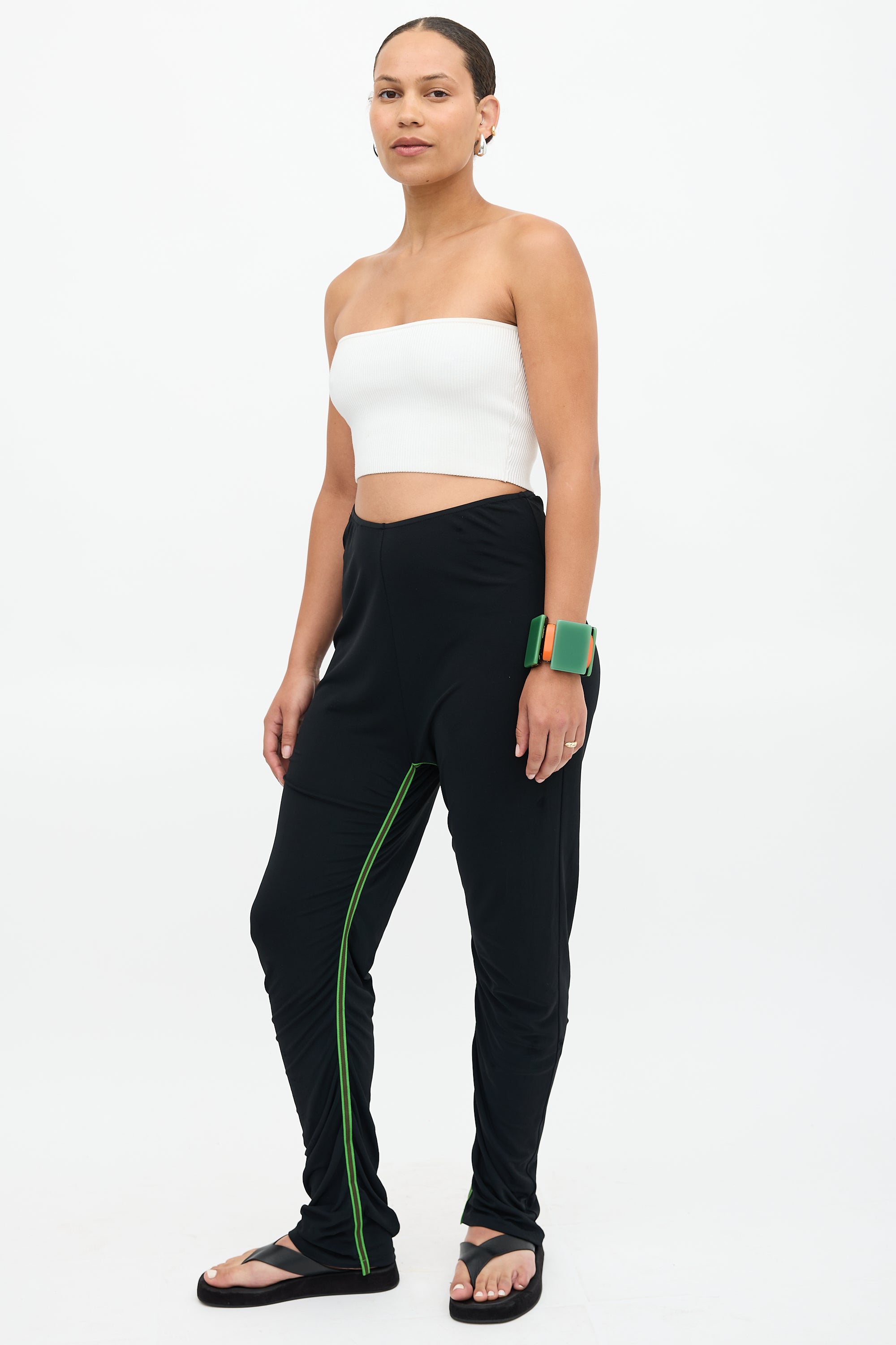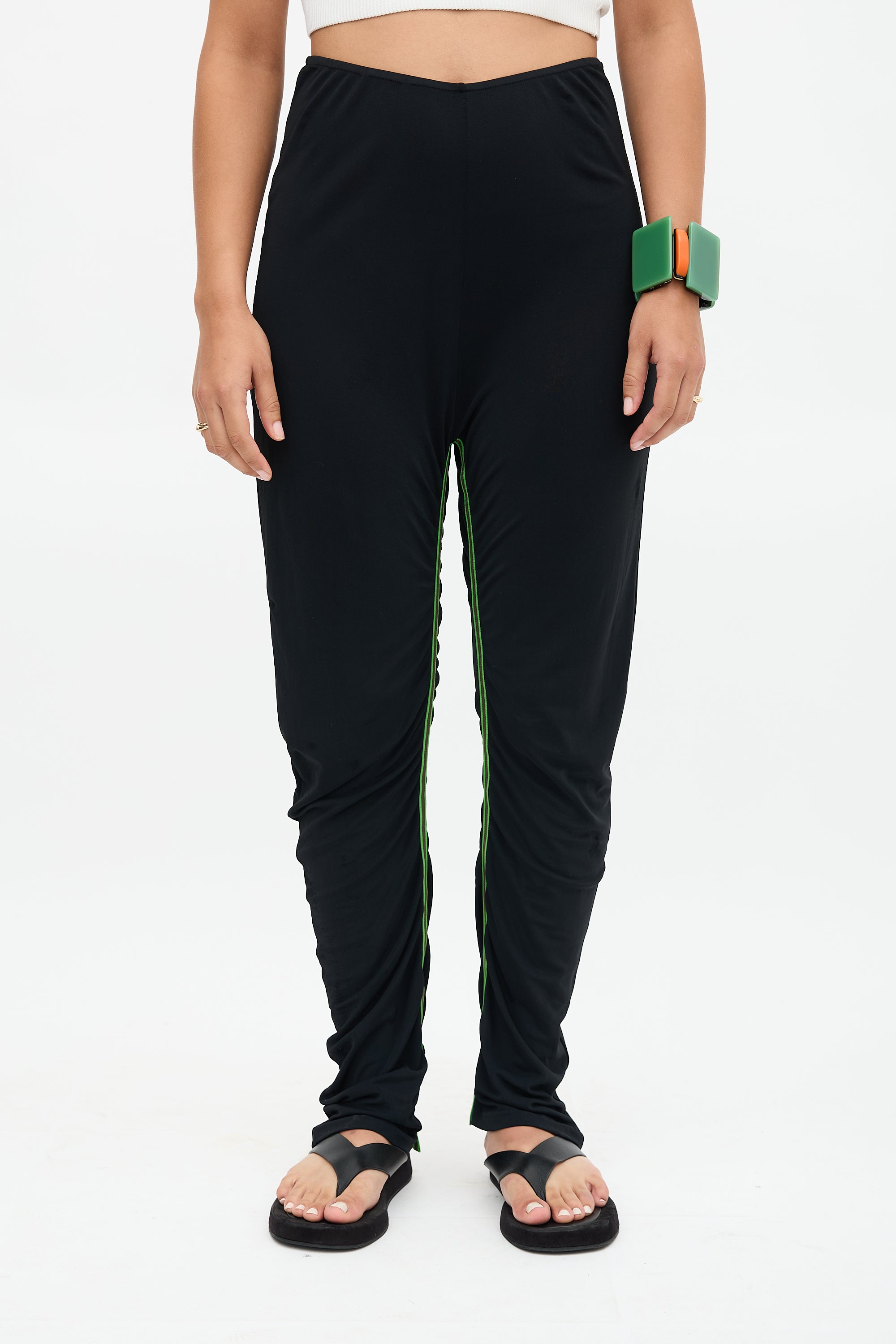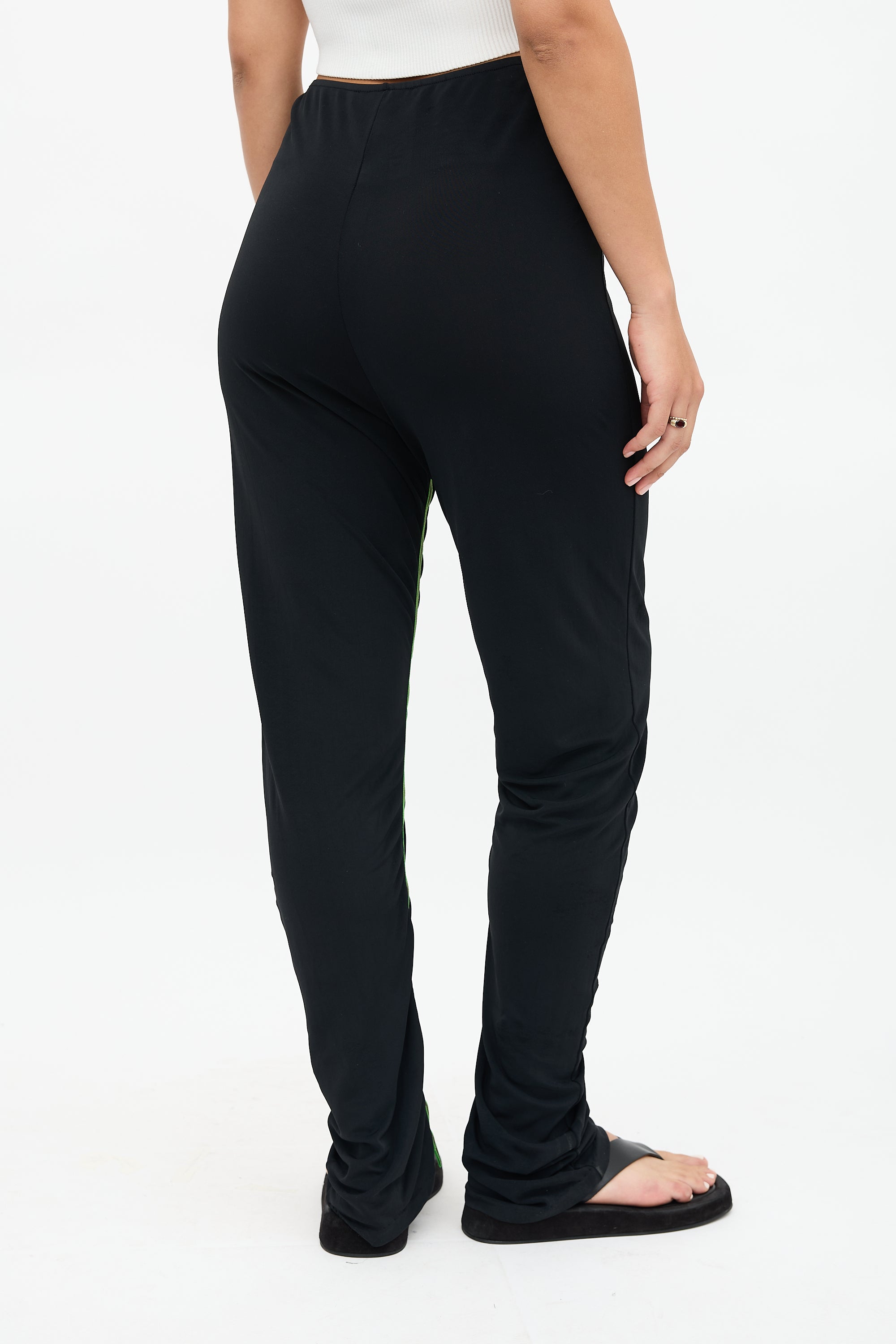 Pre-owned Miu Miu 2000's black nylon leggings featuring an elasticized waist, dropped seat, and green and grey striped grosgrain trimmed inseam.