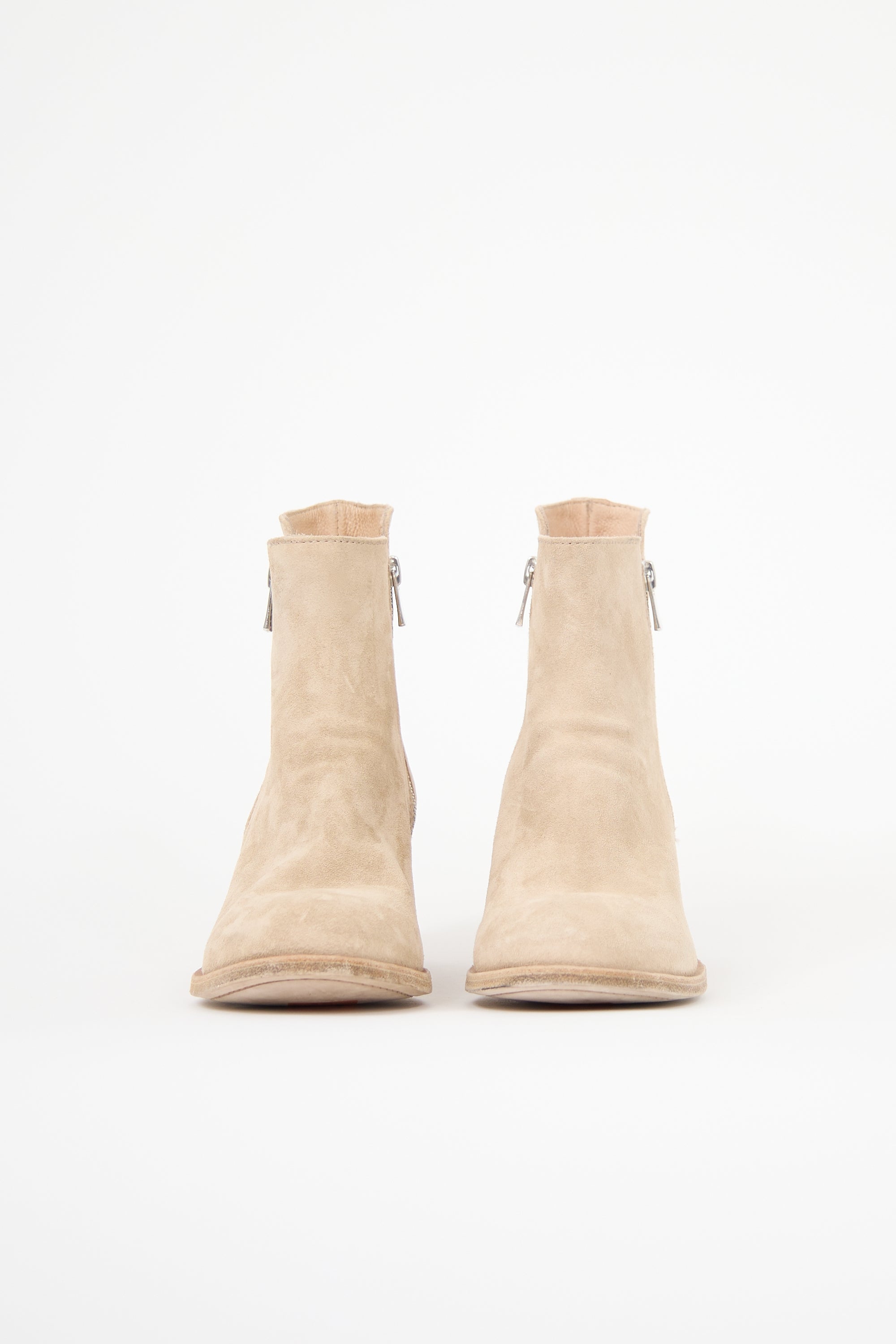 Pre-owned Officine Creative beige suede Denner ankle boots featuring rounded toe, two silver tone side zip closures, and block heel. Comes with original dust bag.
