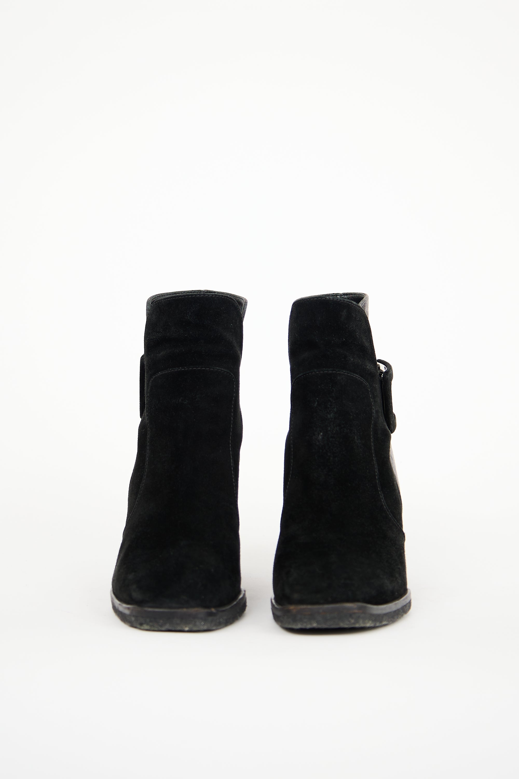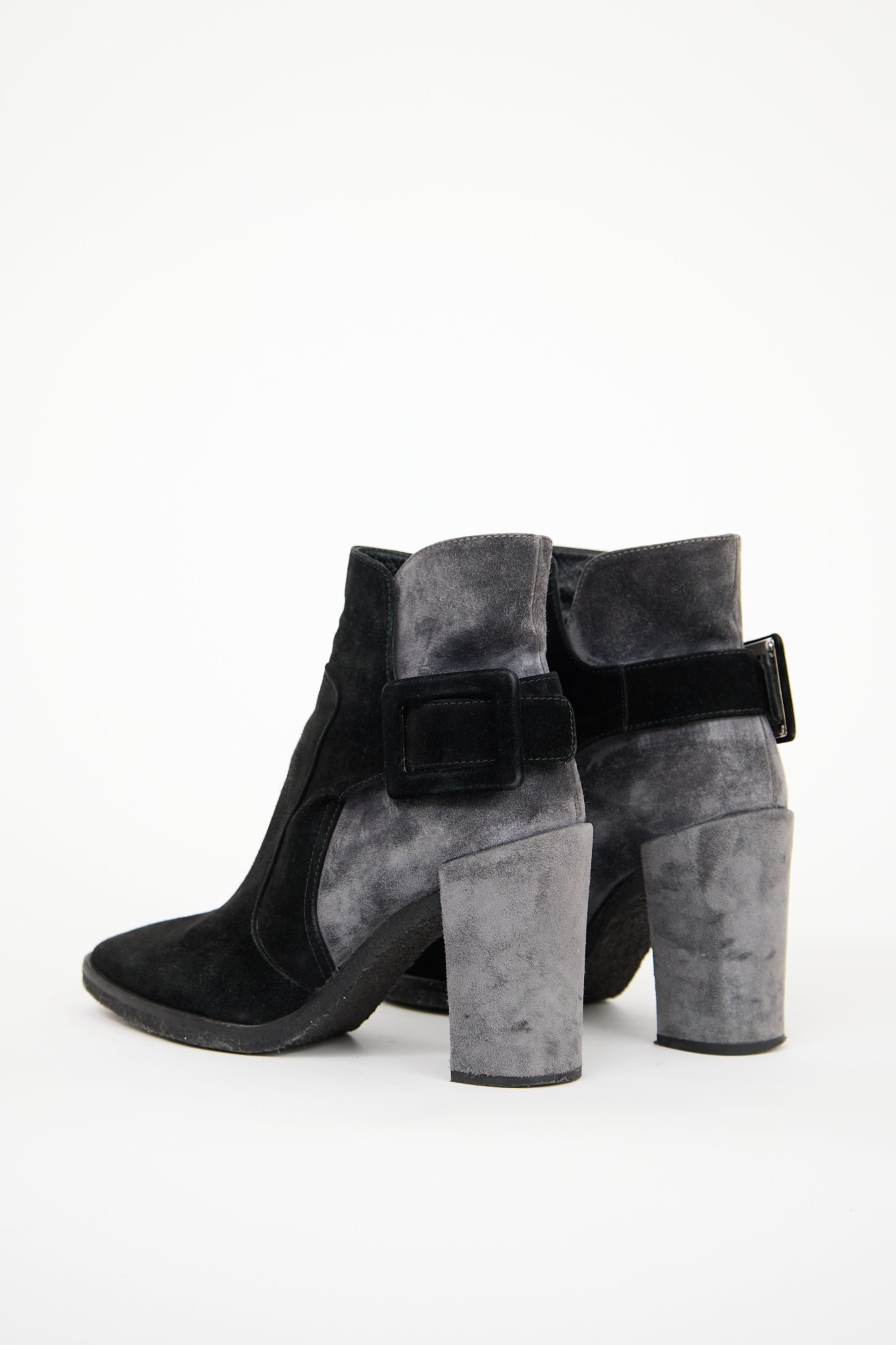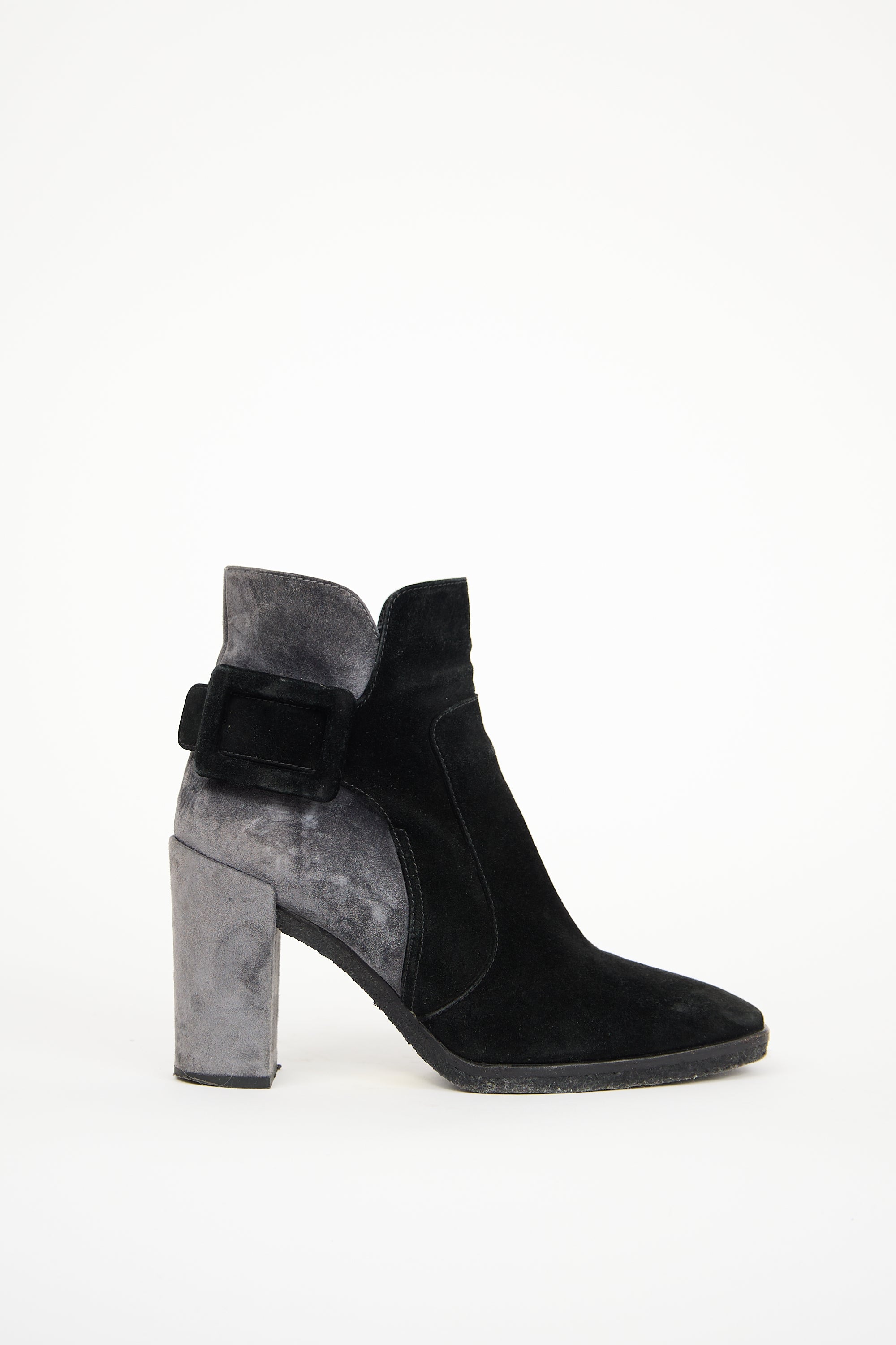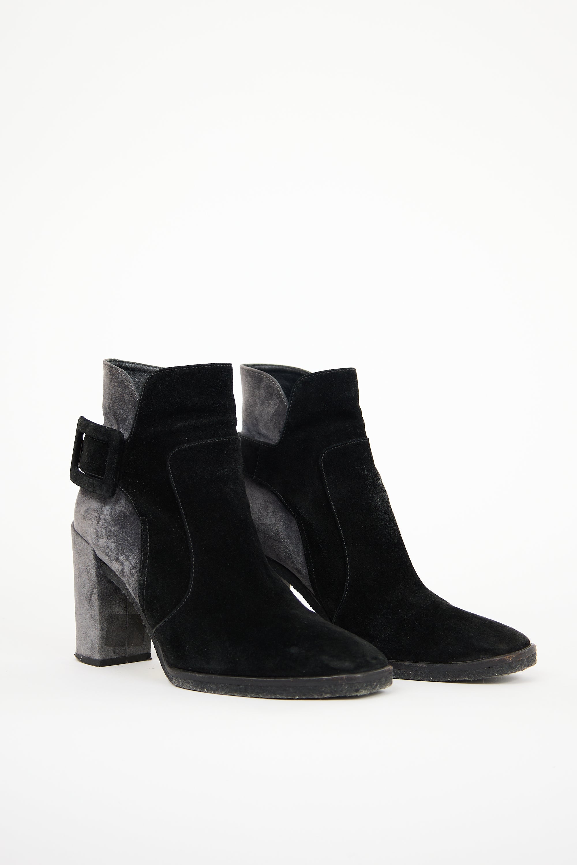 Pre-owned Roger Vivier black and grey suede boots featuring a square toe, suede adjustable buckle with elasticated strap, and a covered block heel.