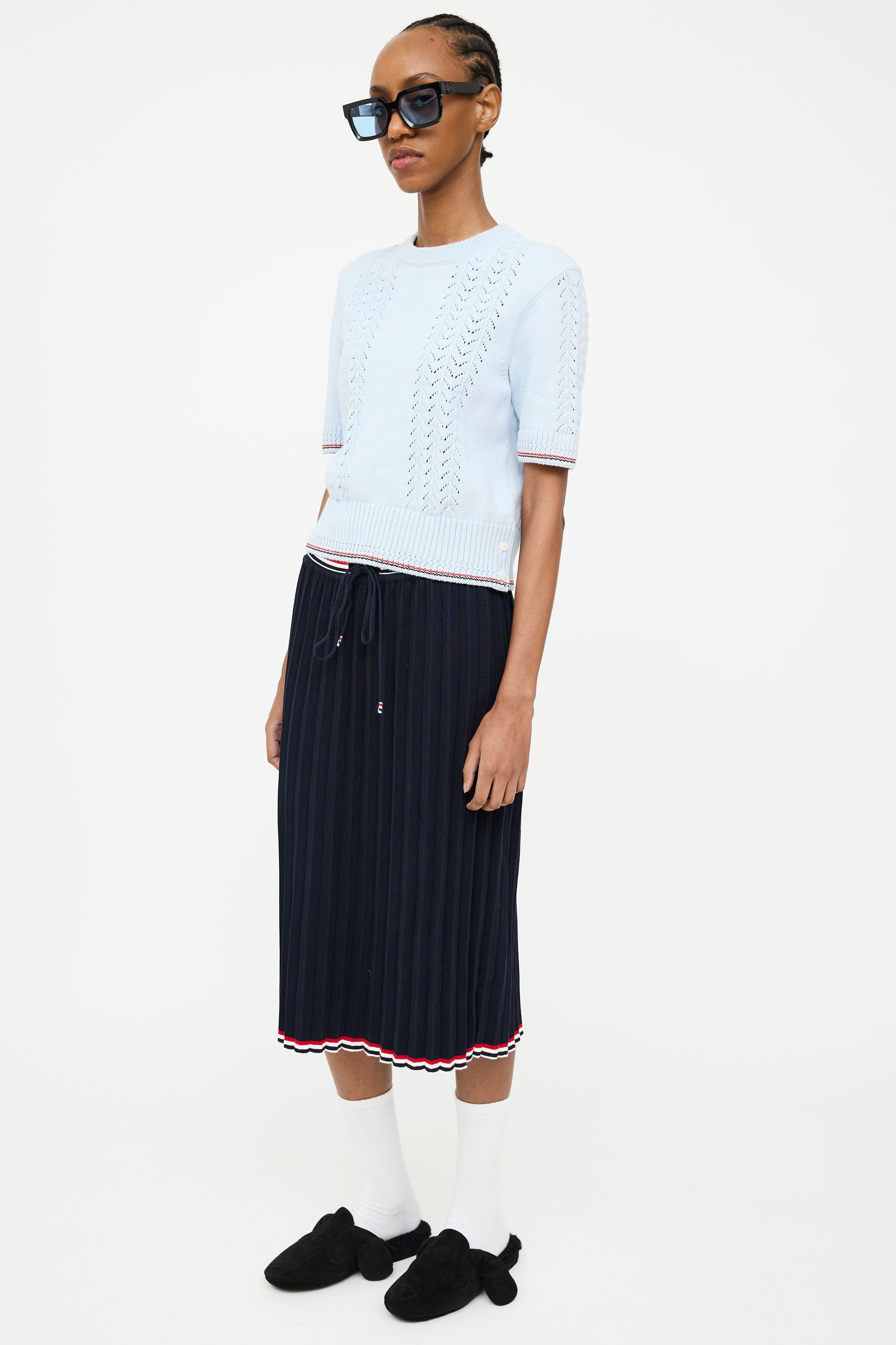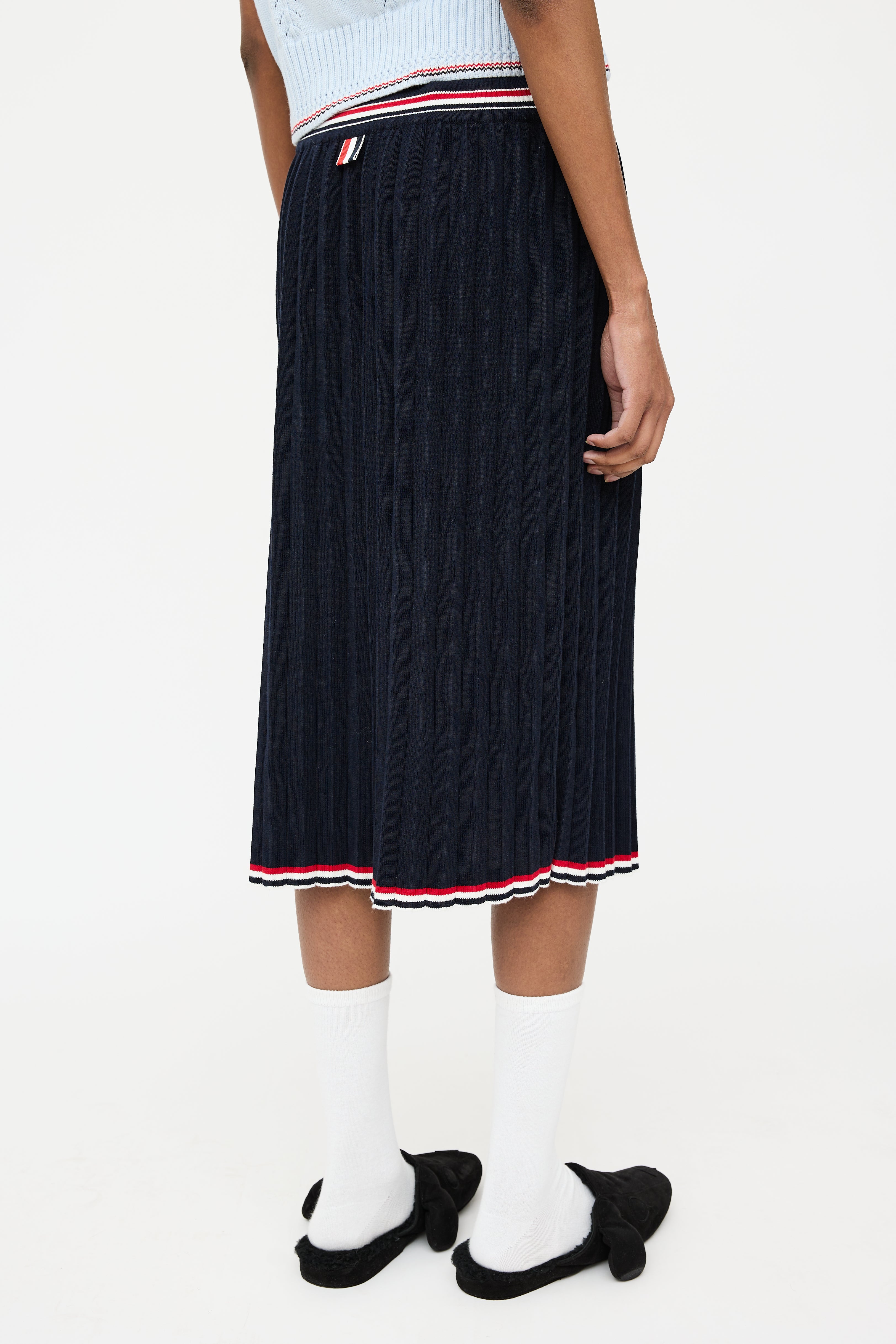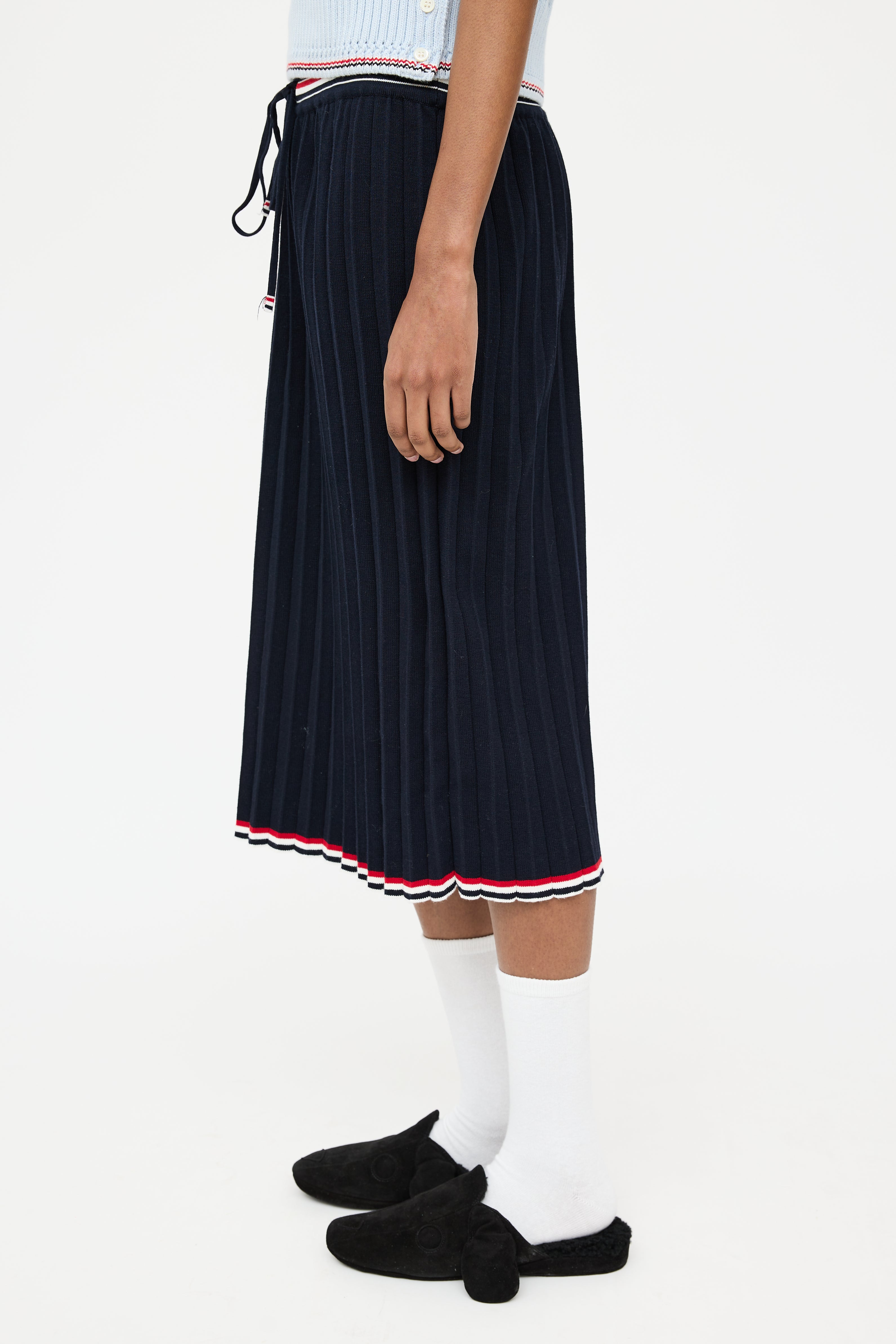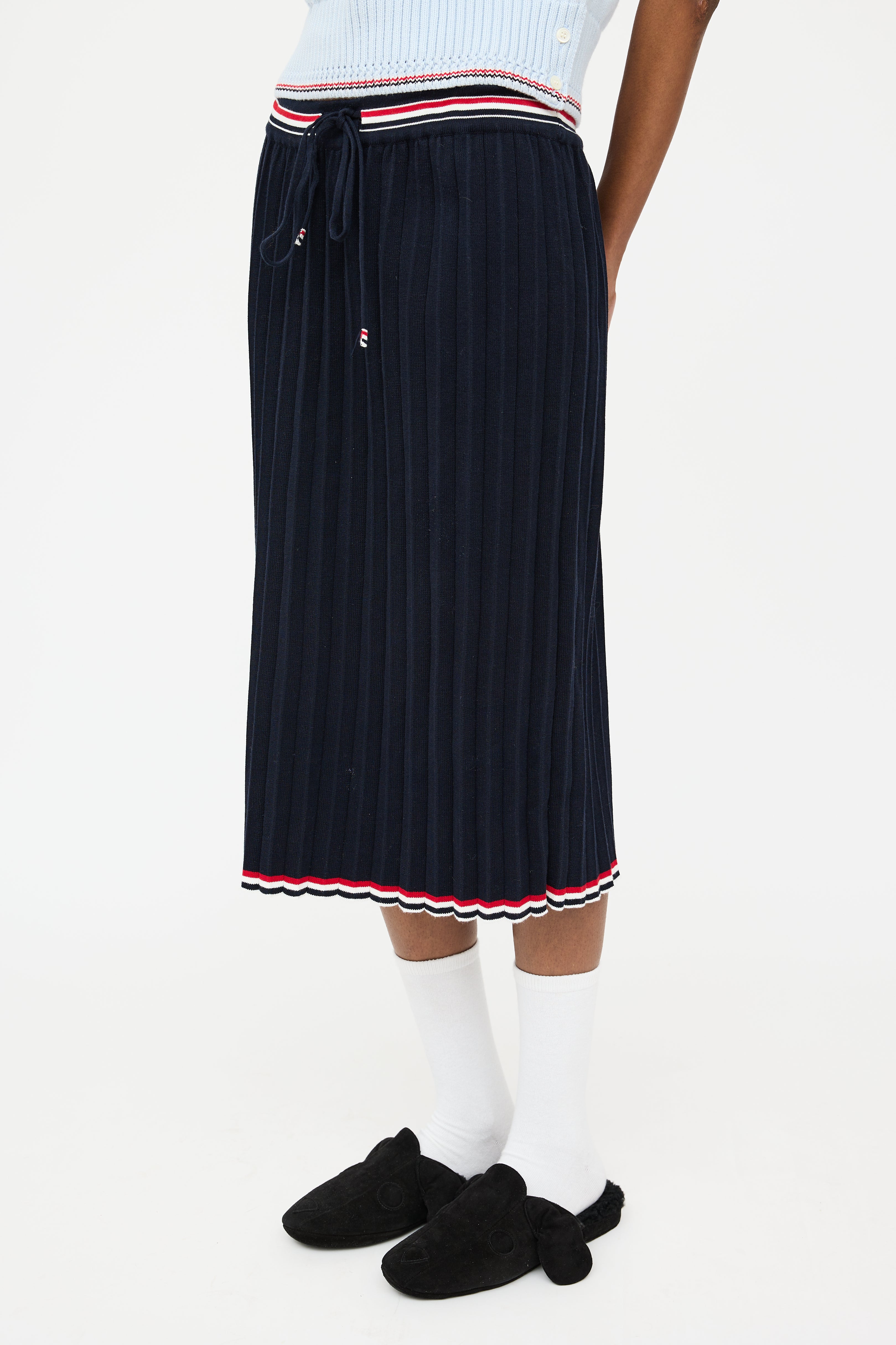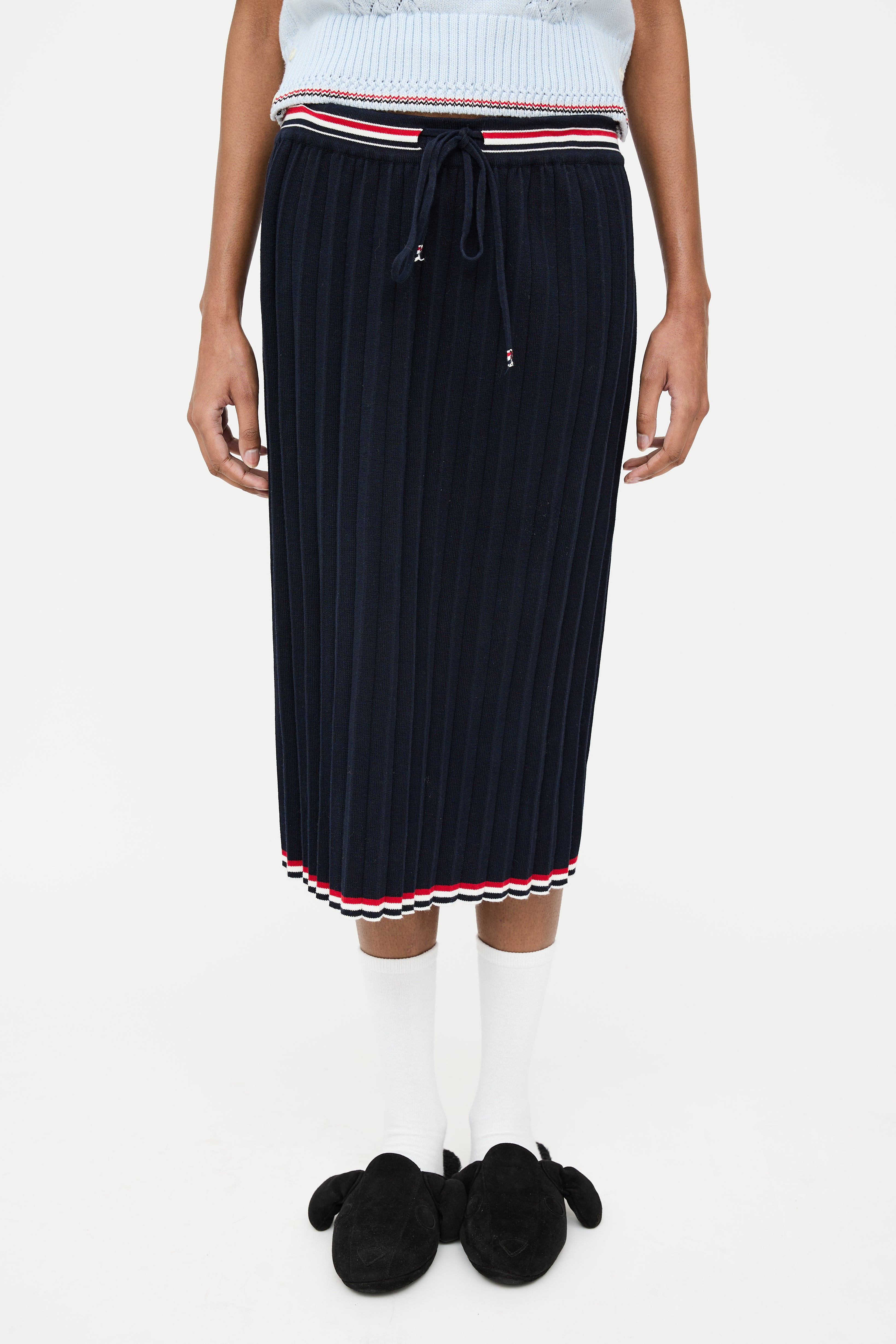 Pre-owned Thom Browne navy midi skirt featuring an elastic drawstring waist, pleated detailing, multicolour striped trim, and signature webbed tricolour grosgrain tab at waist.