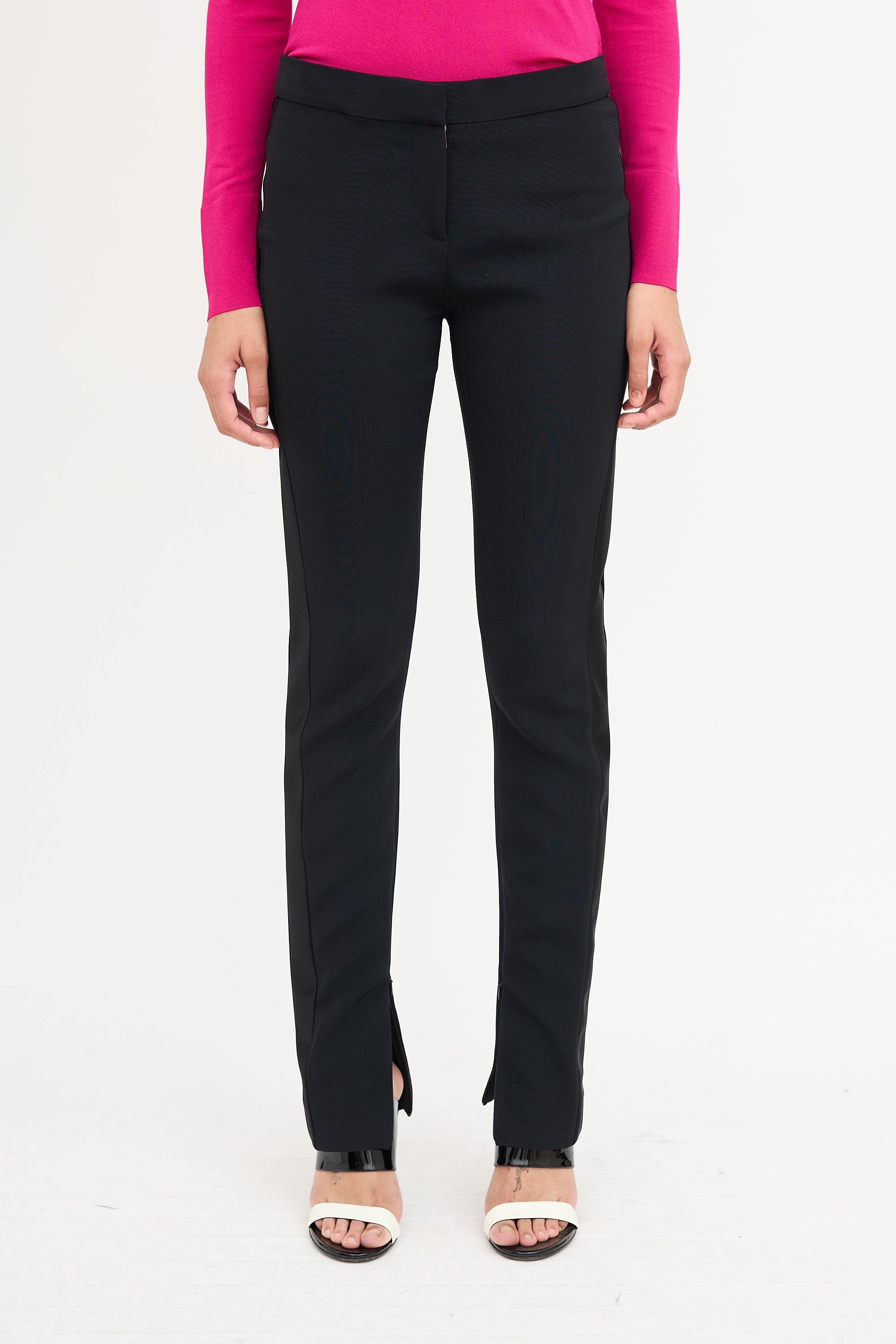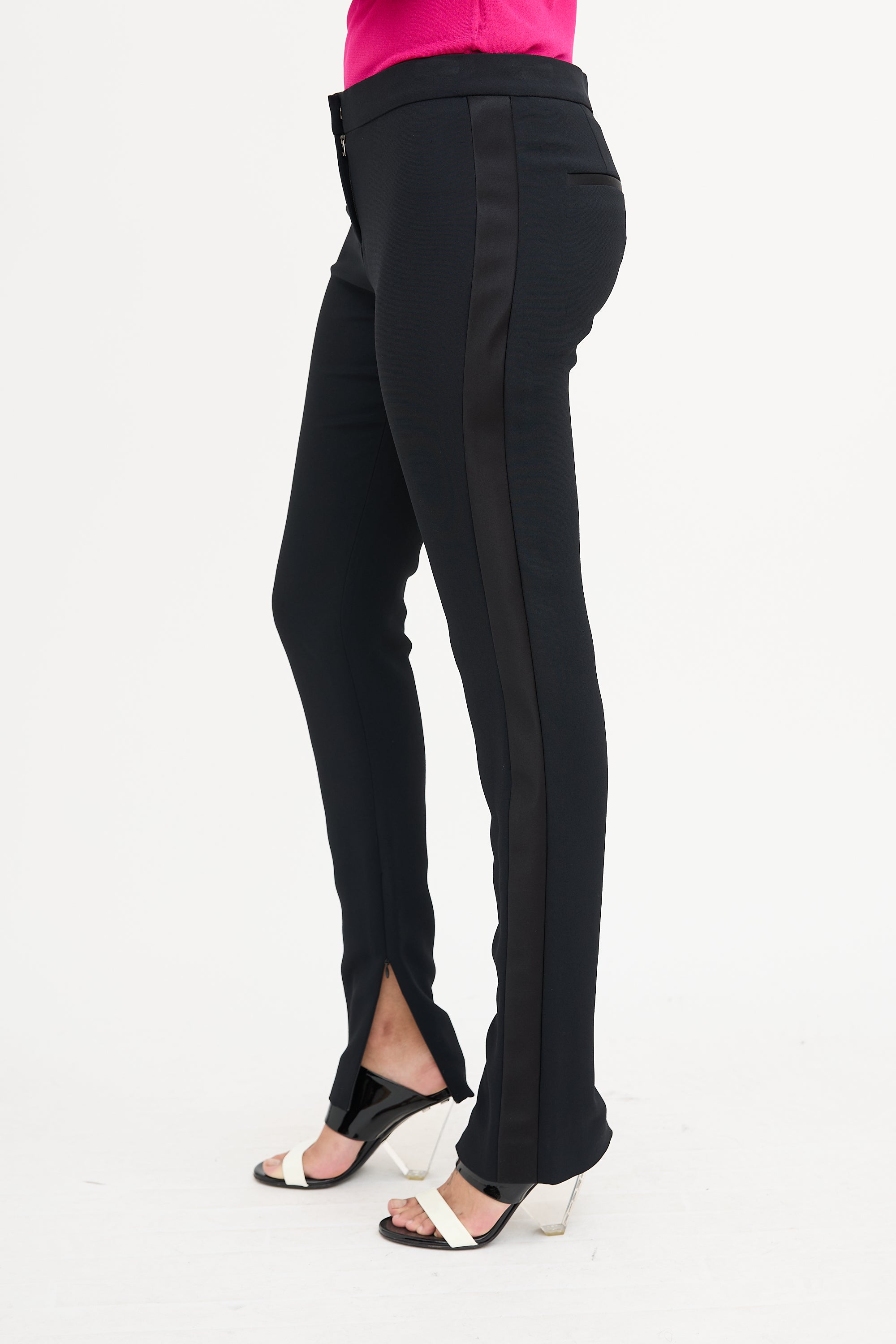 Pre-owned Tom Ford black trouser featuring zip fly with hook and eye fastening, two welt pockets at back, tonal silk side stripe, and tapered leg with zip cuff.