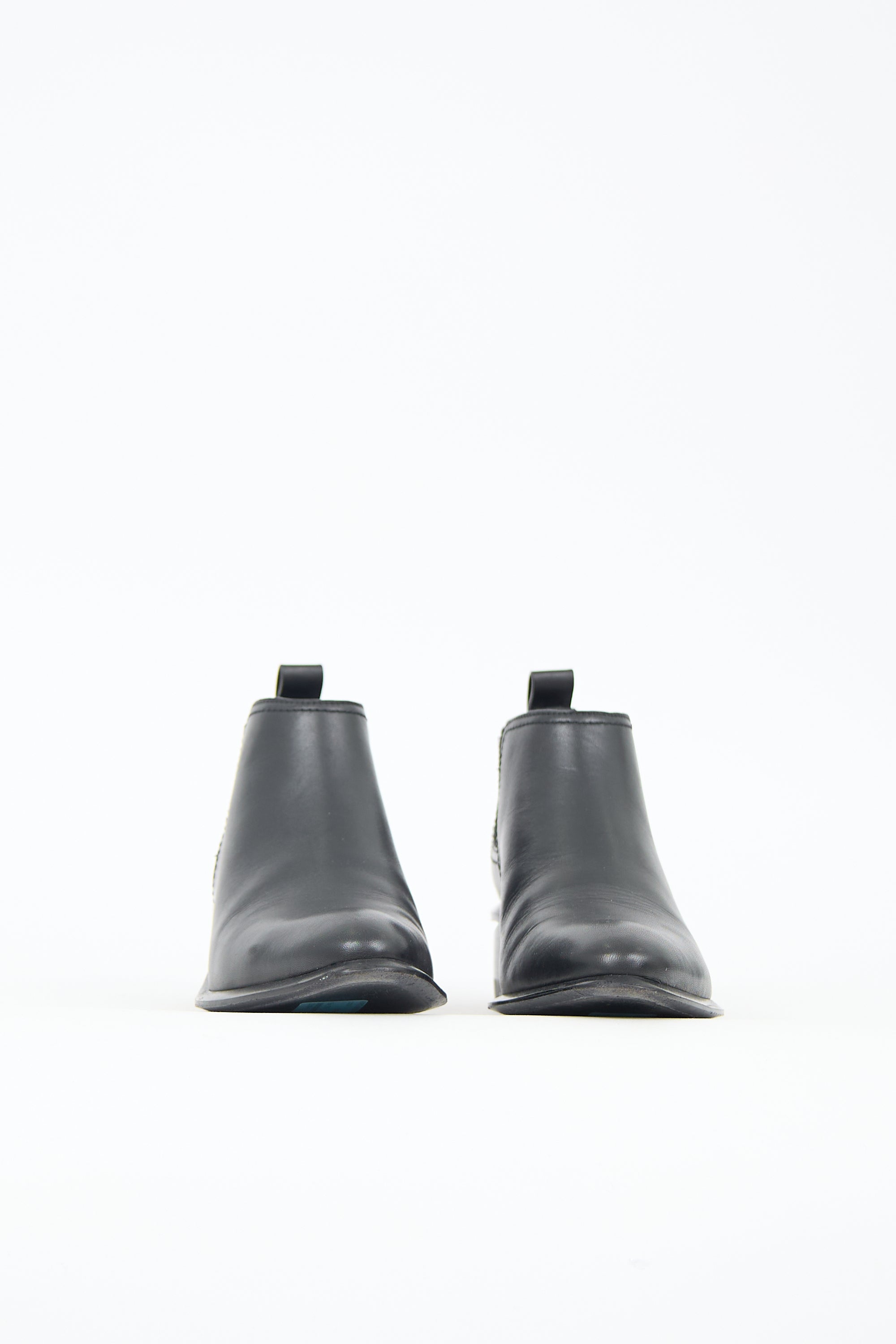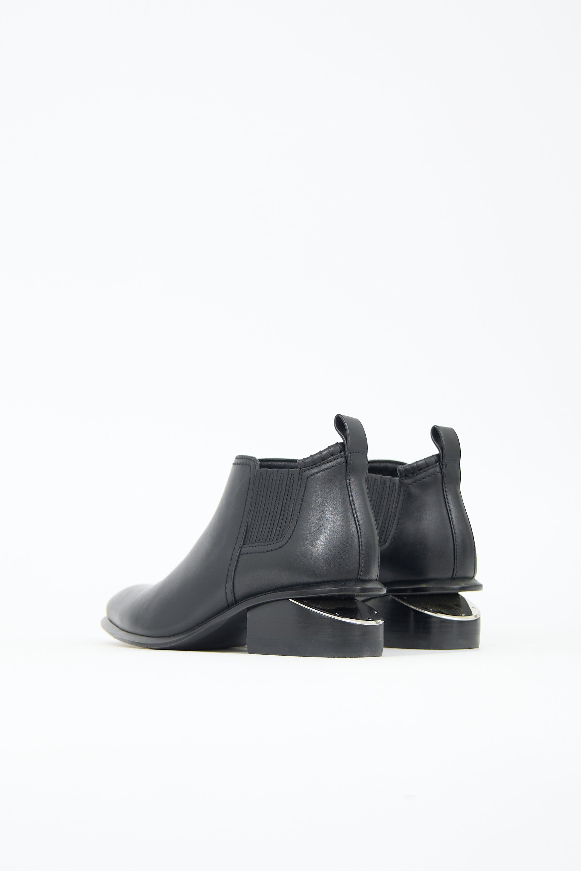 Pre-owned Alexander Wang black leather Kori ankle boots featuring almond toe, covered elastic side panels, pull tab at counter, and cut out wooden block heel with silver tone metal plate. Comes with original dust bag.