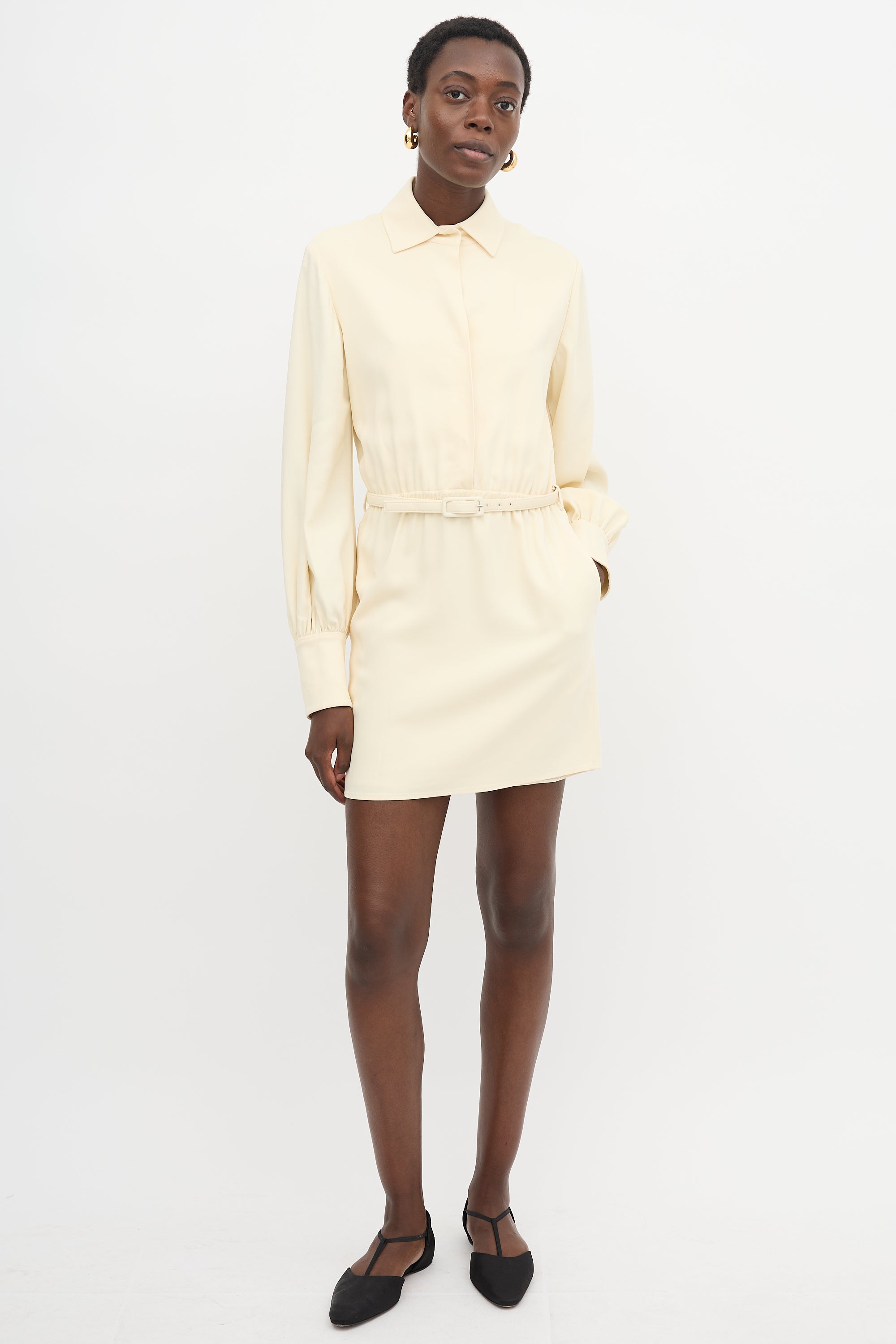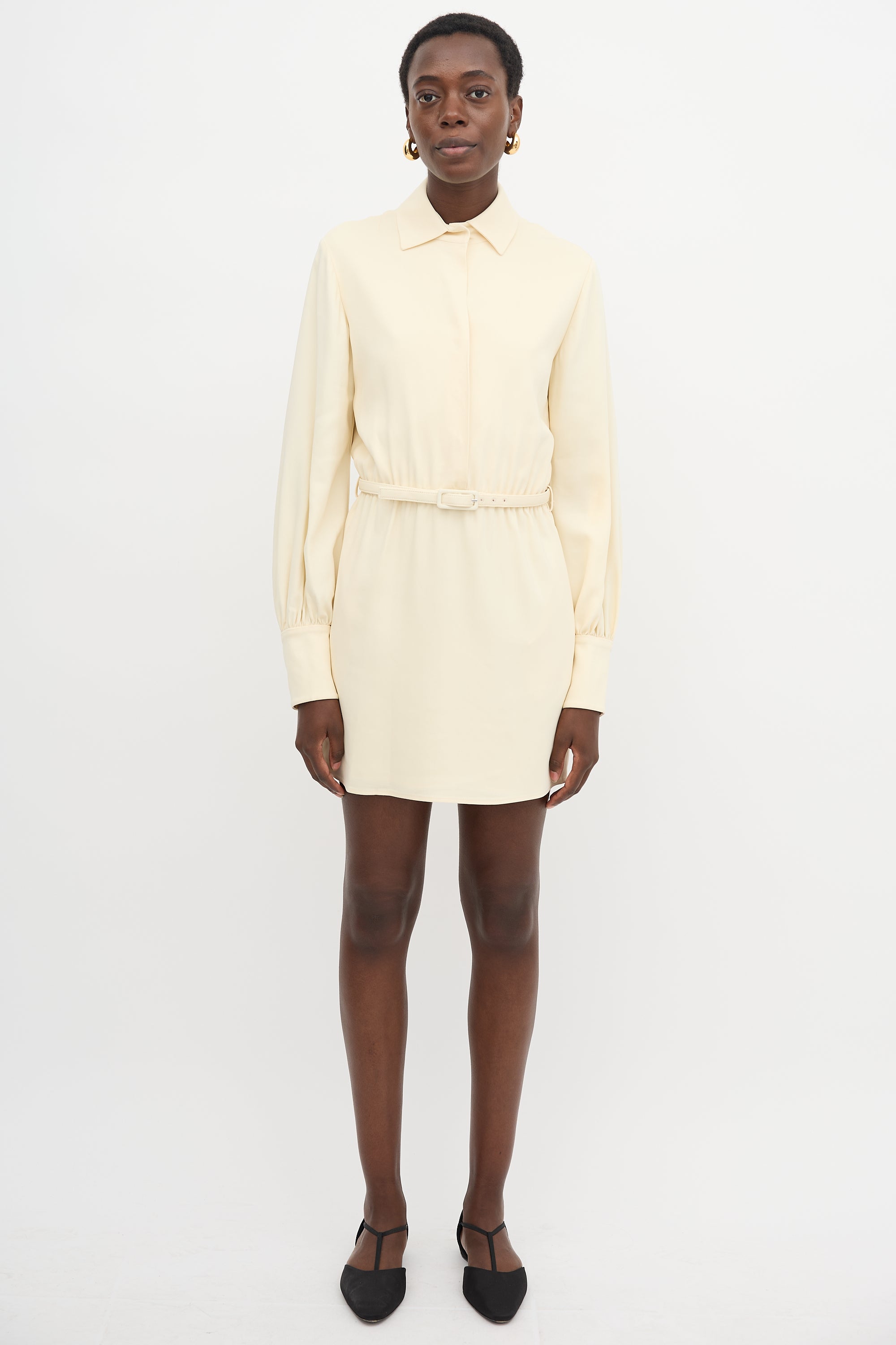 Pre-owned Alexis cream mini Levina dress featuring spread collar, snap button up front top, elasticized waist, waist belt, and buttoned cuffs. Lined skirt.