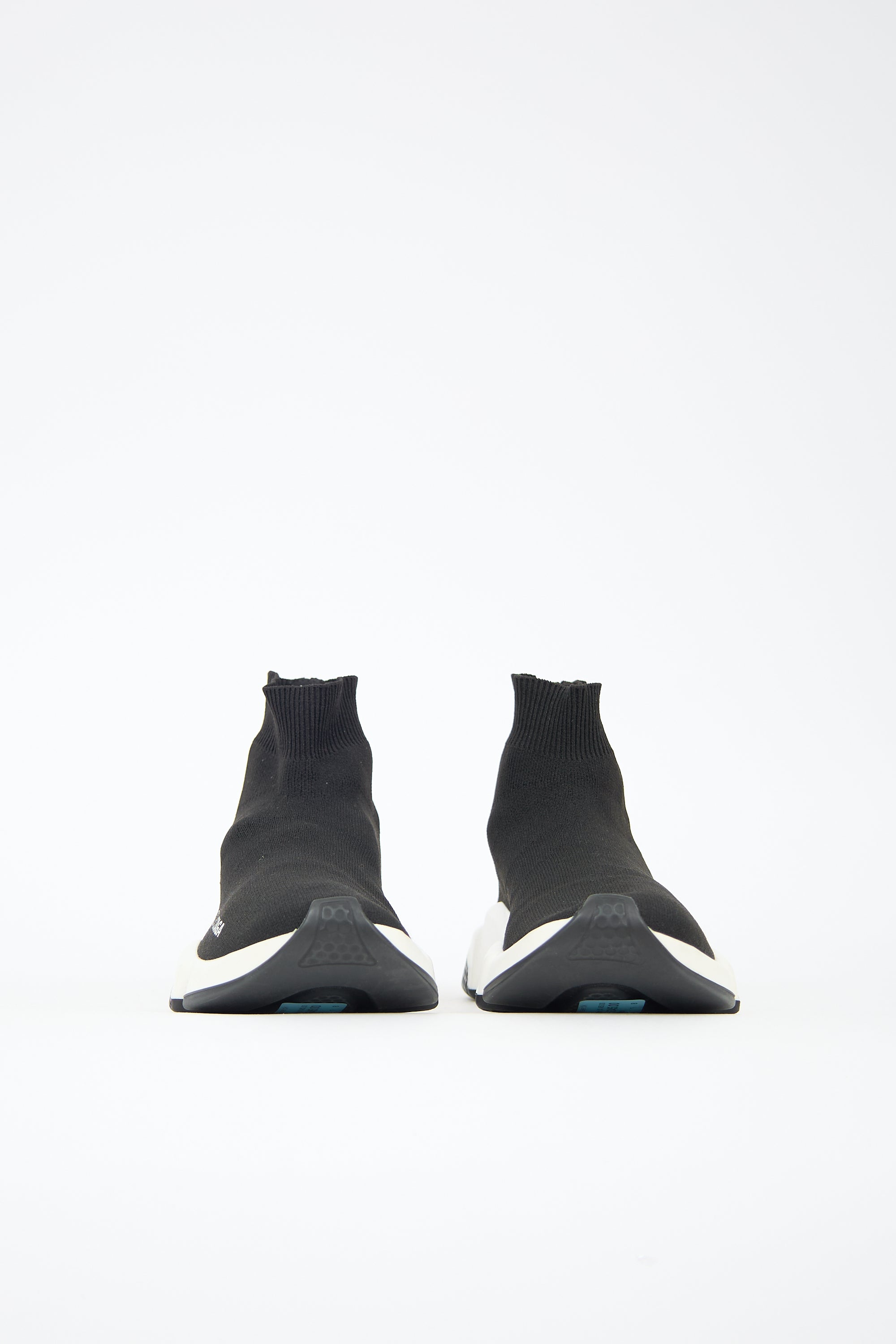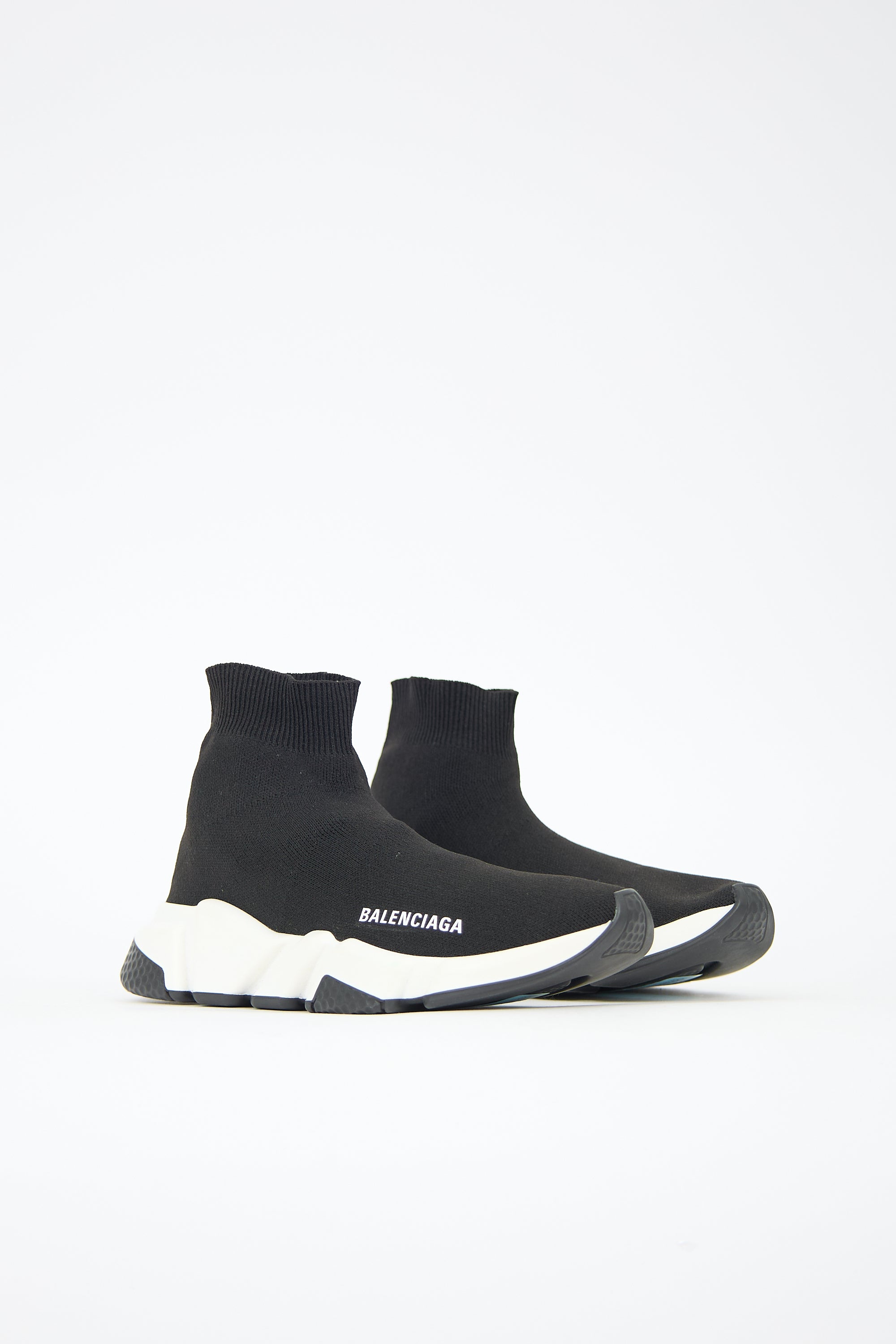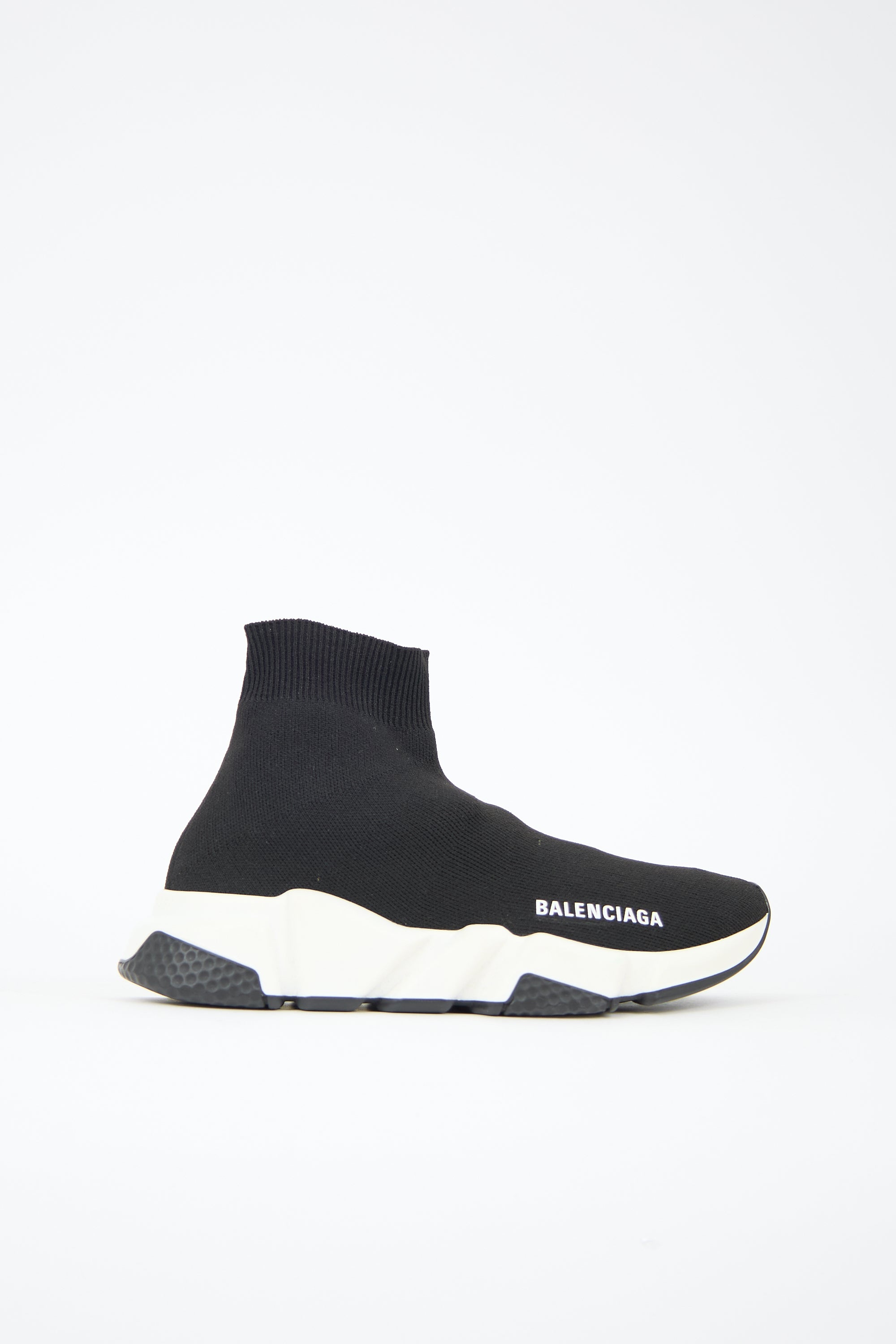 Pre-owned Balenciaga black Speed Knit sneaker featuring rounded toe, white printed logo at outer toe box, stretch knit upper, ribbed topline, and white rubber sole. Comes with original dust bag.