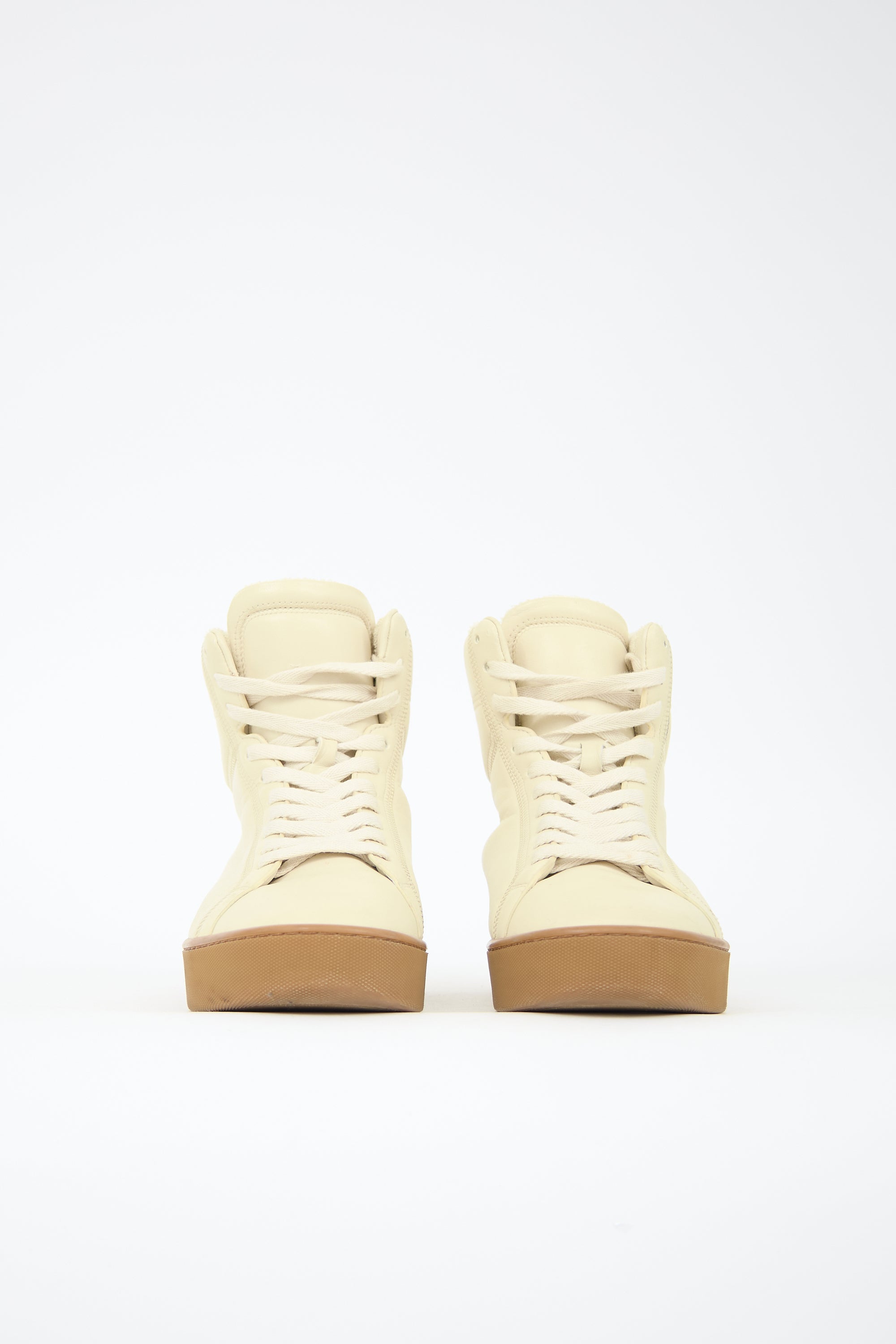 Pre-owned Bottega Veneta cream leather Quilted high top sneakers featuring rounded toe, lace up vamp, pull tab at counter, brown rubber sole, and terry interior.