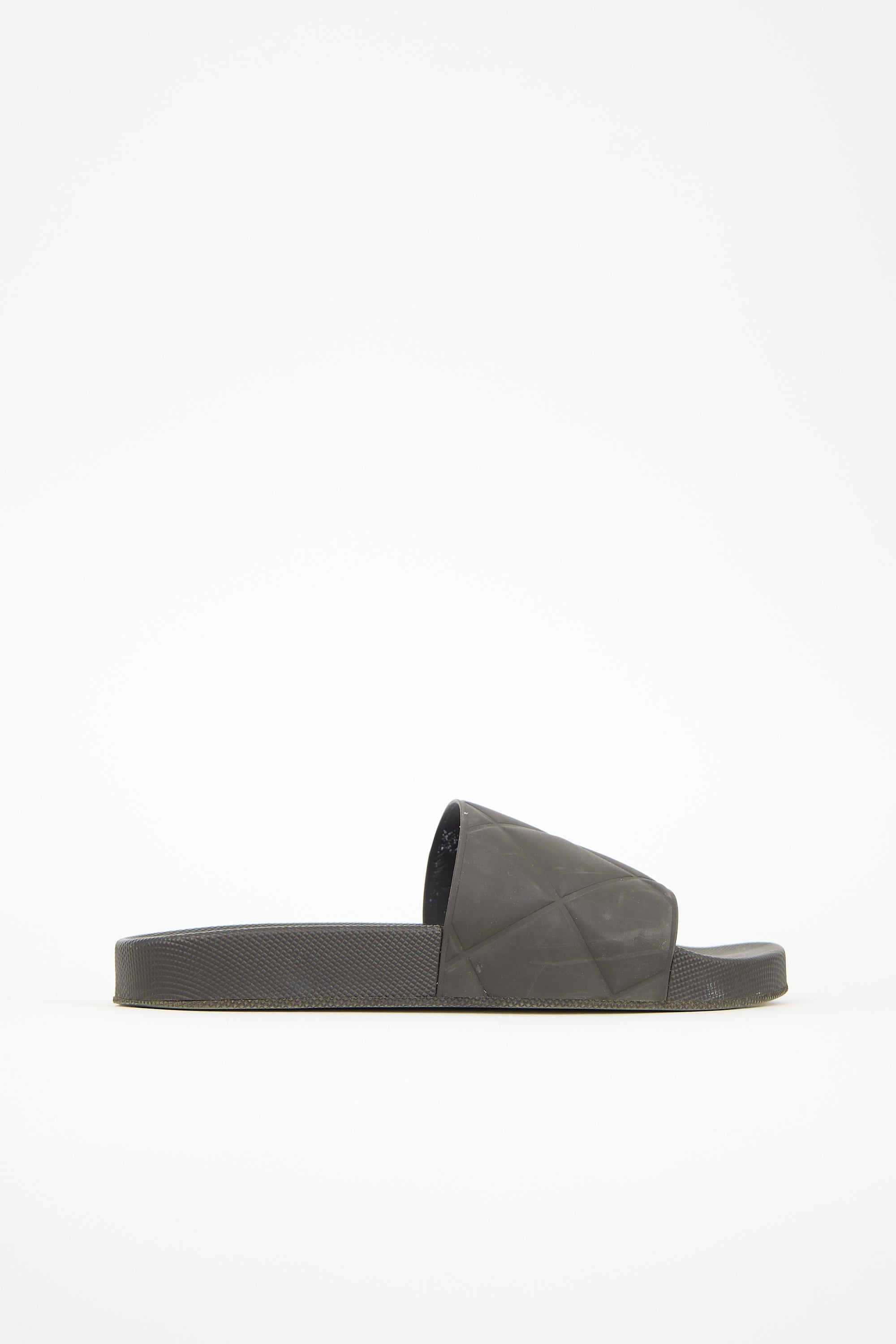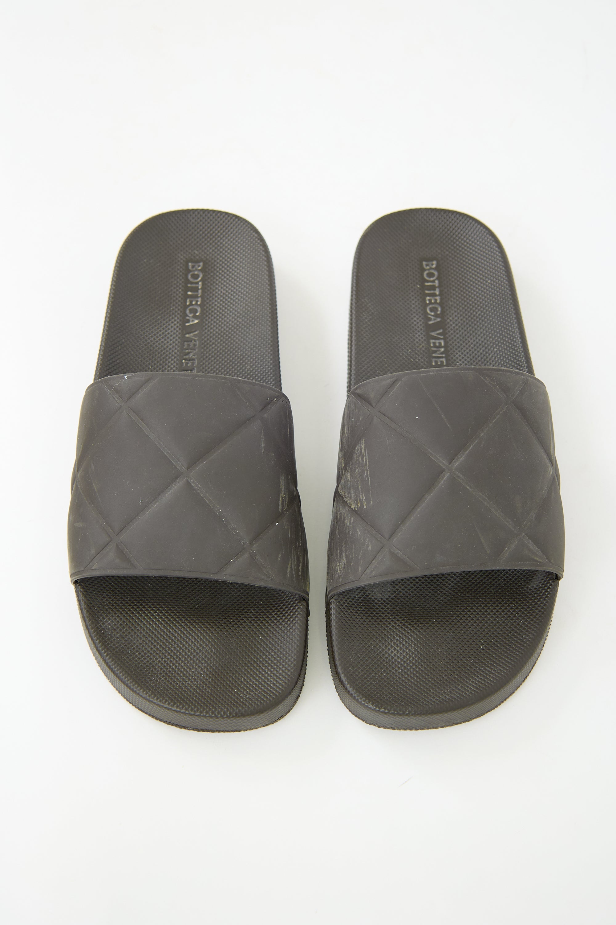 Pre-owned Bottega Veneta black rubber slides featuring a squared toe and quilted rubber strap across vamp.