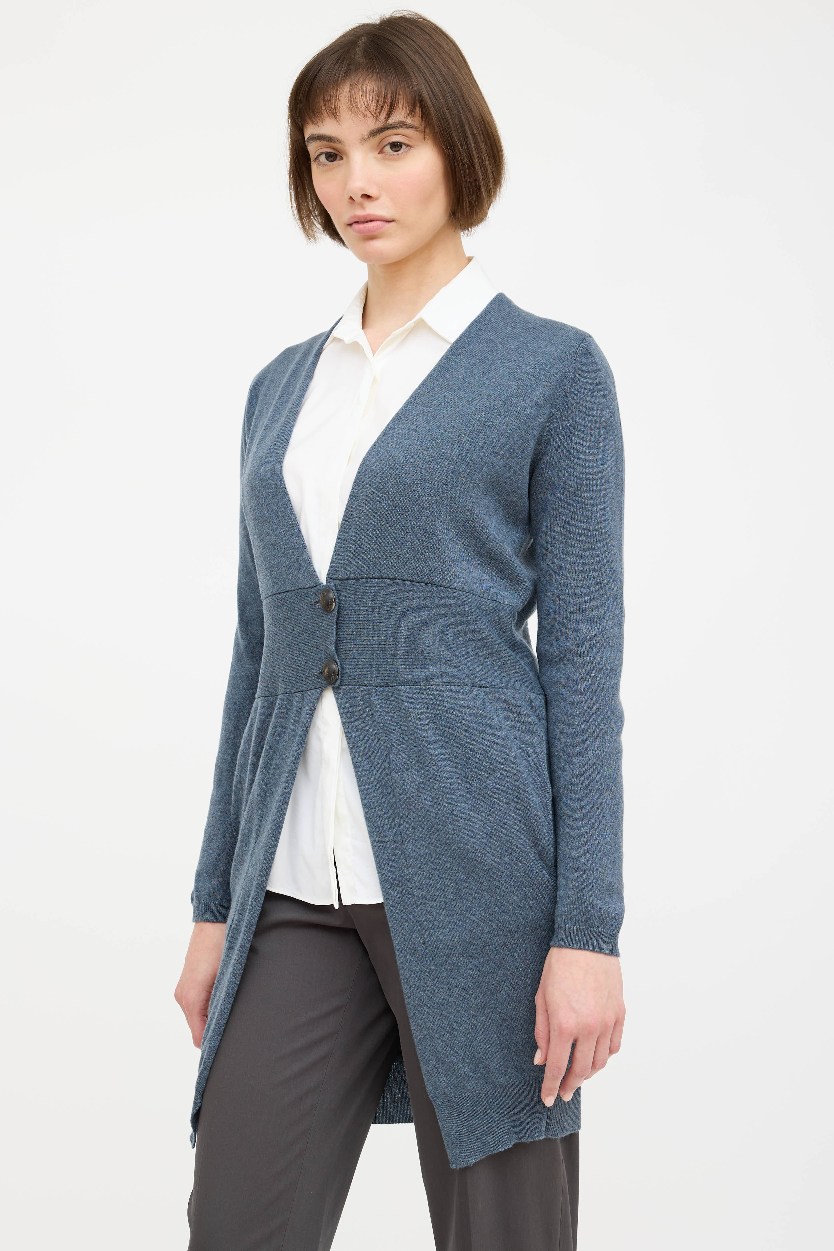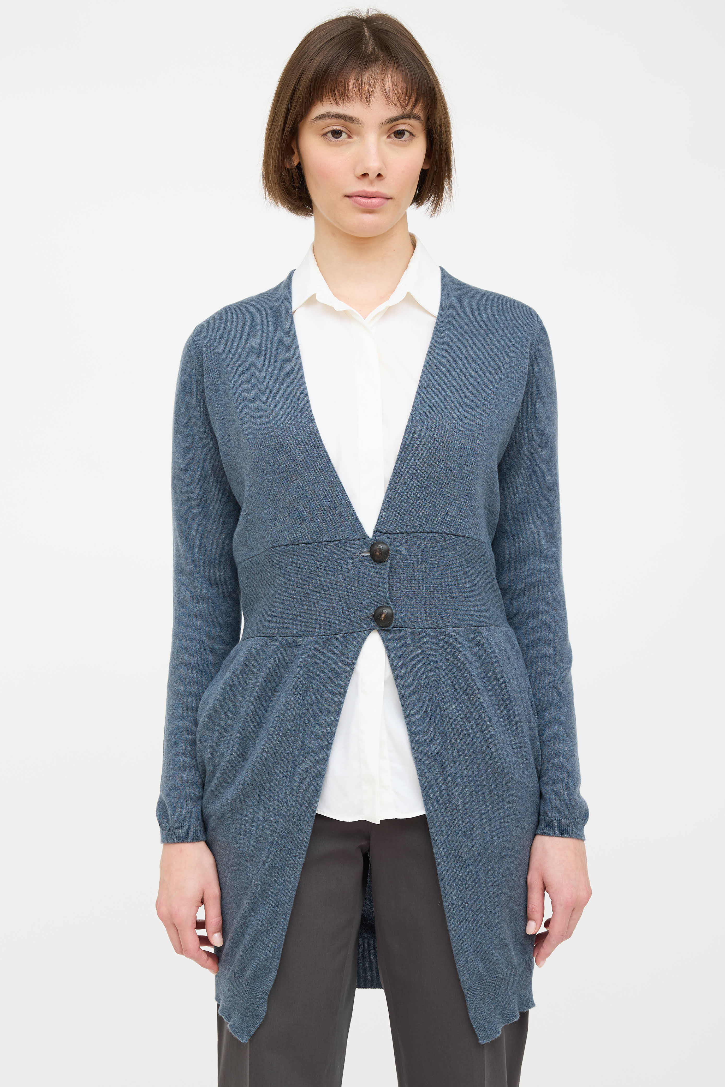 Pre-owned Brunello Cucinelli blue cashmere knit cardigan featuring a V-neckline, long sleeves, ribbed hem, and logo two button closure.