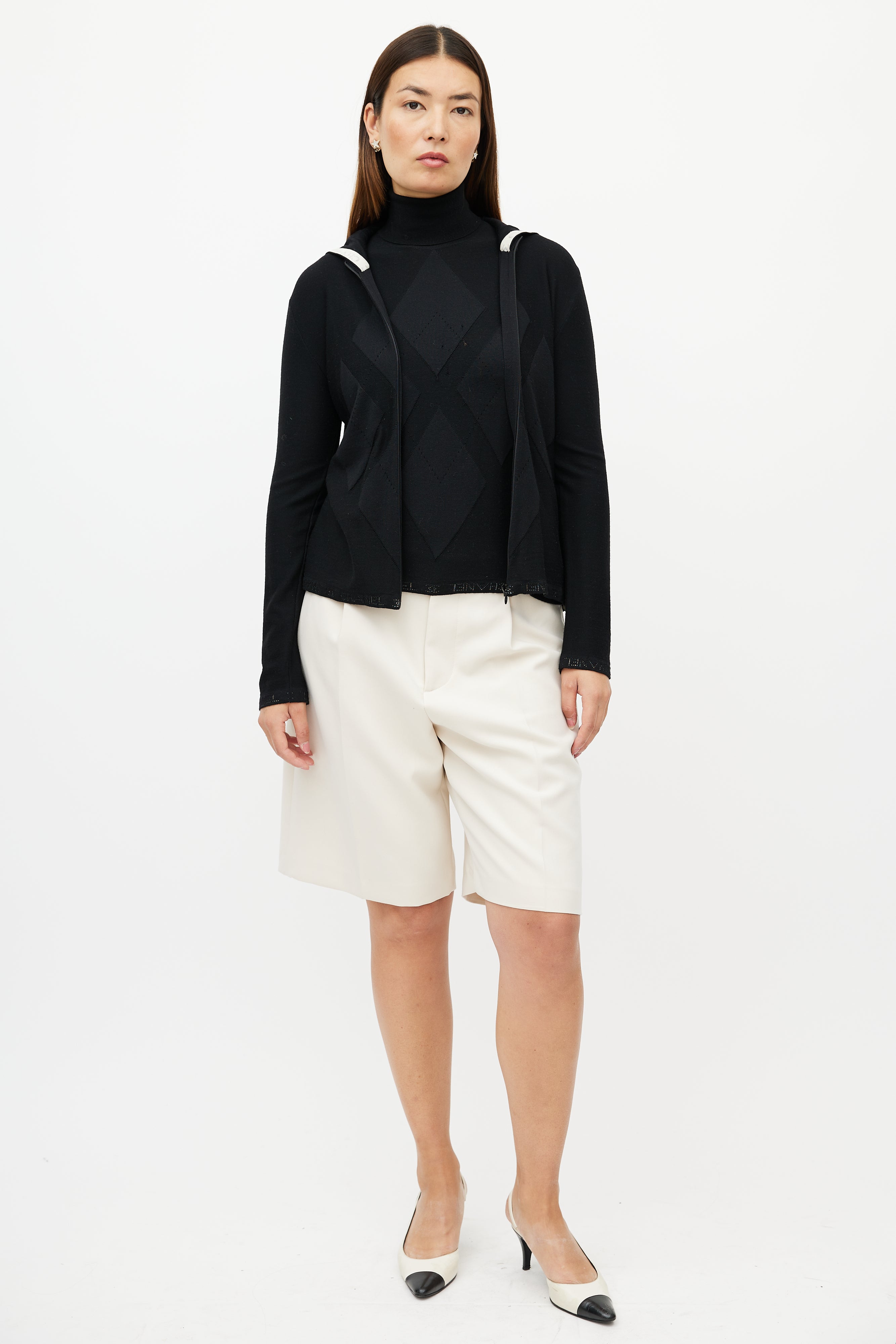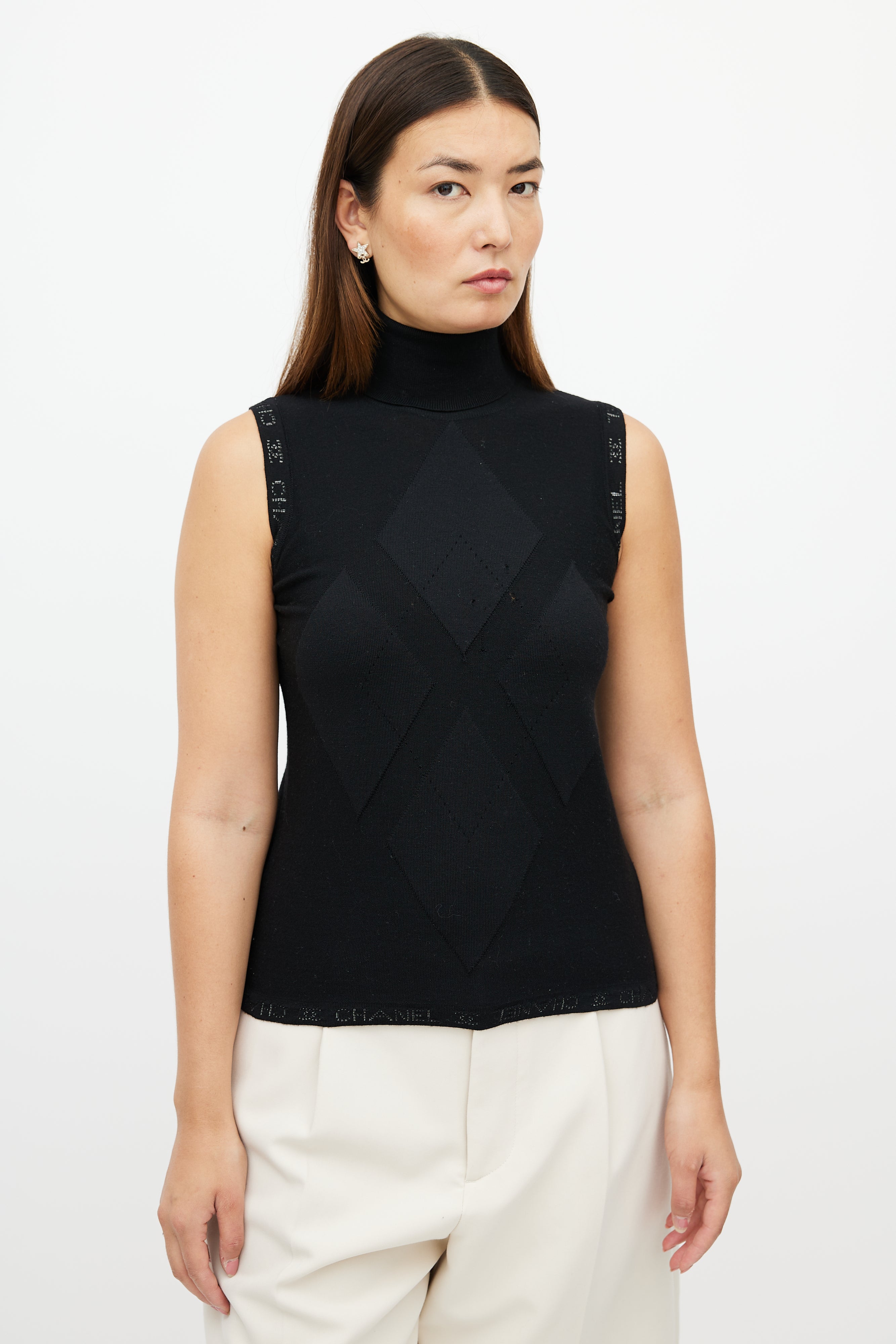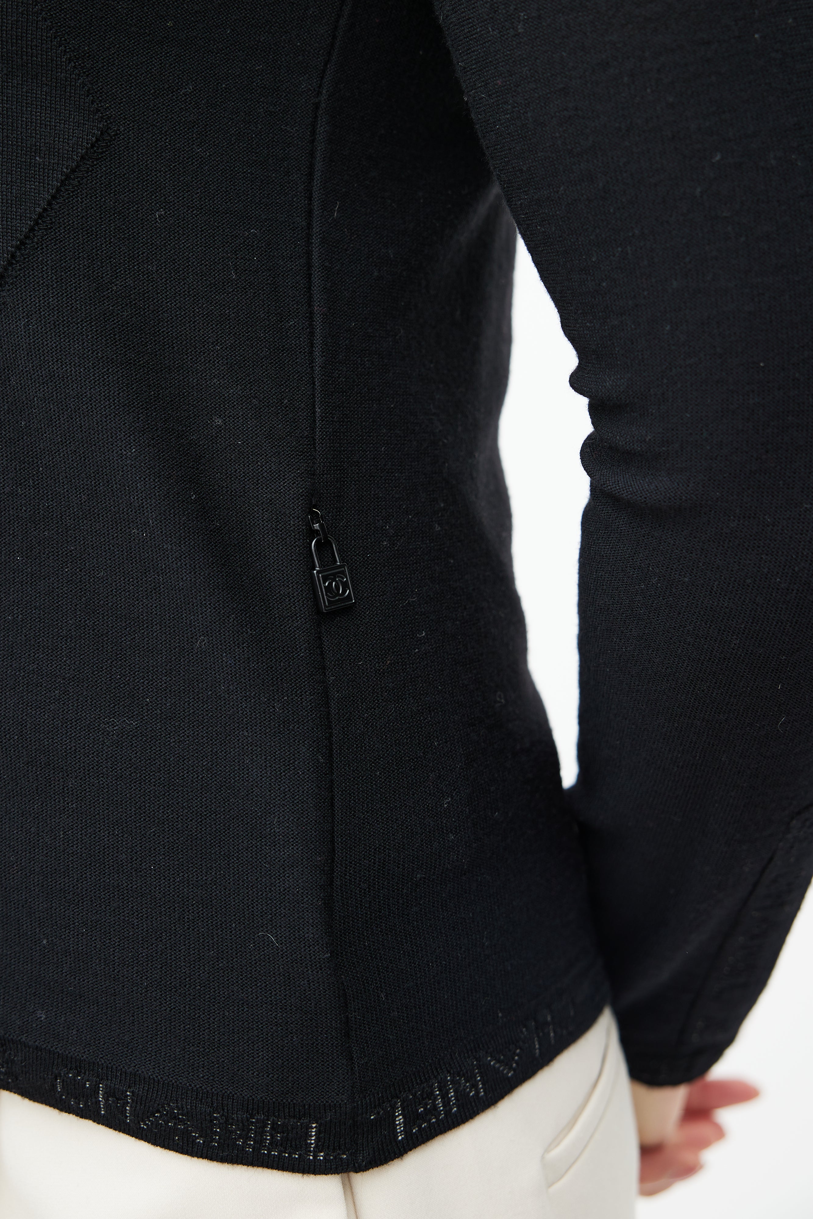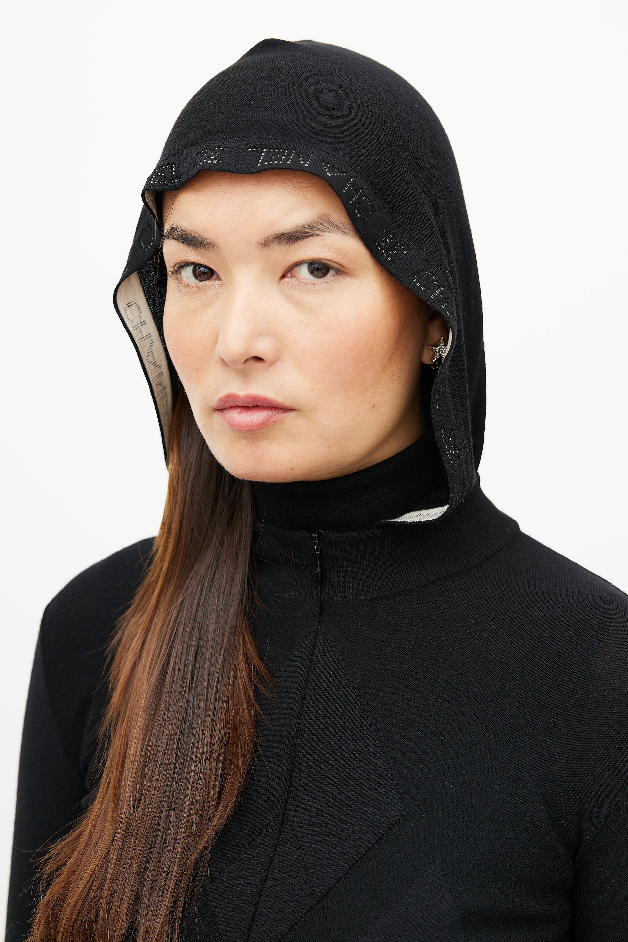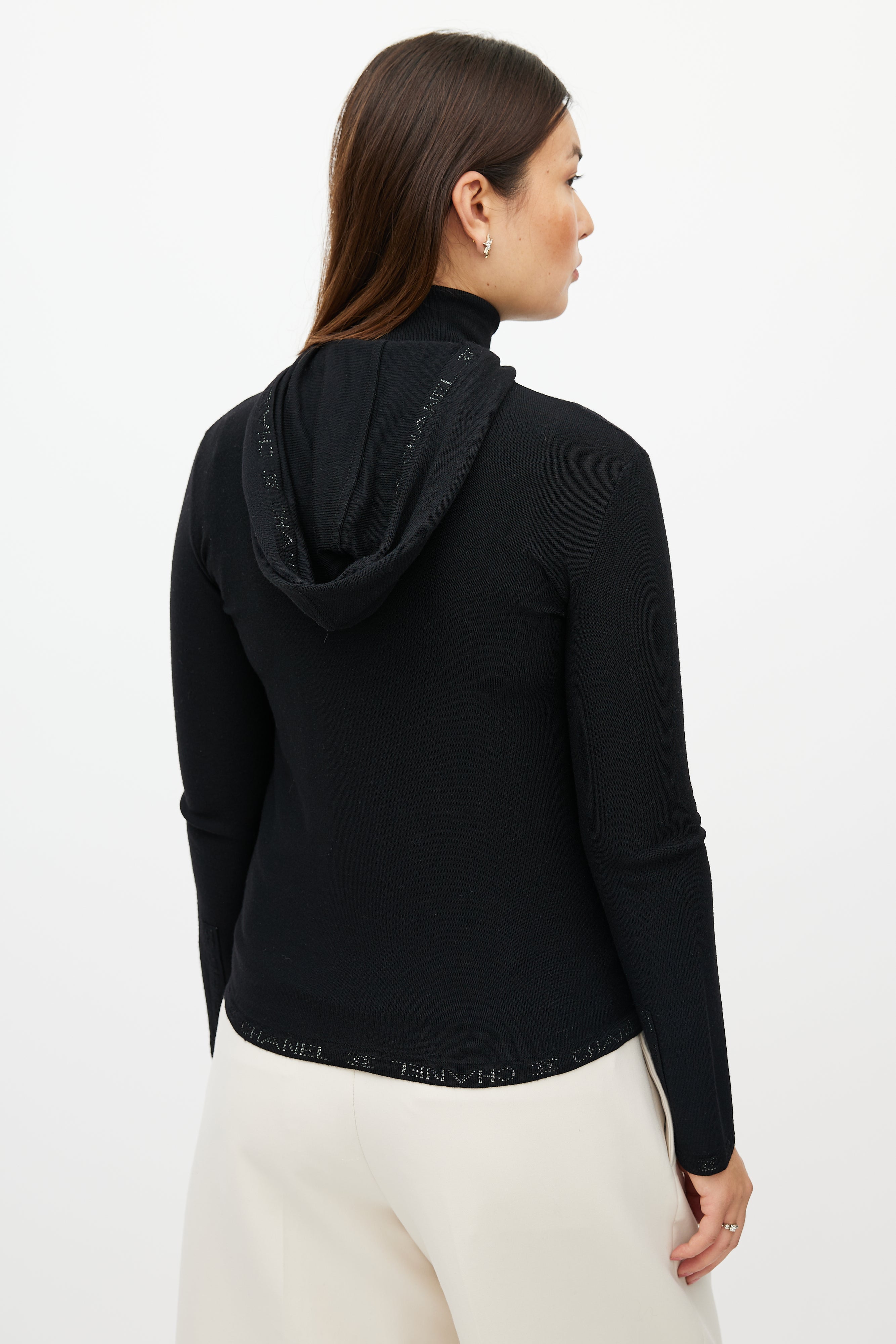 Pre-owned Fall/Winter 2007 Chanel black wool hoodie featuring an attached hood with woven logo trim, long sleeves, two zip pockets at hip, tonal argyle weave at chest, and zip closure. Matching vest features a turtleneck, sleeveless styling with woven logo trim, tonal argyle weave at chest, and ribbed logo hem.