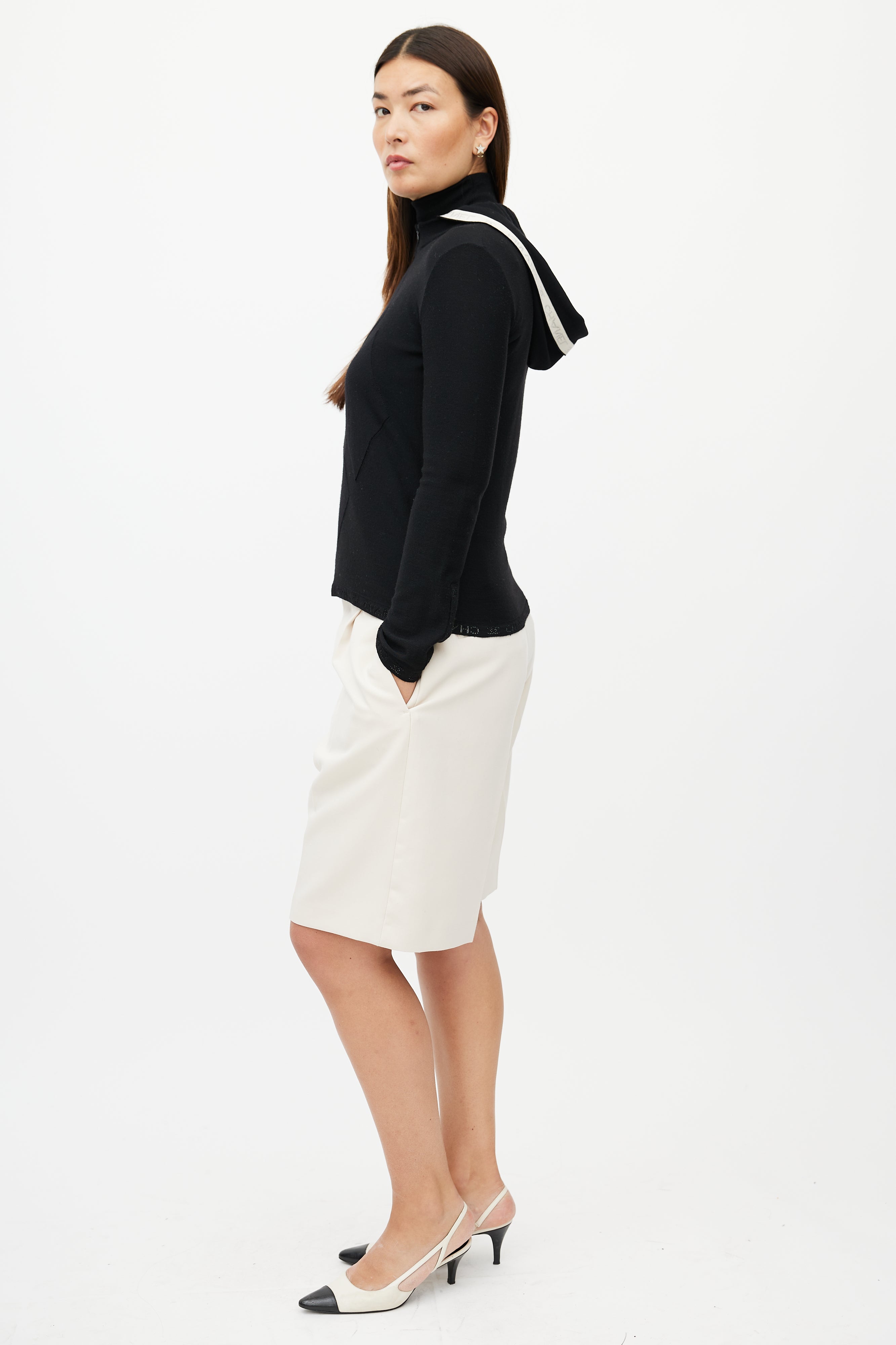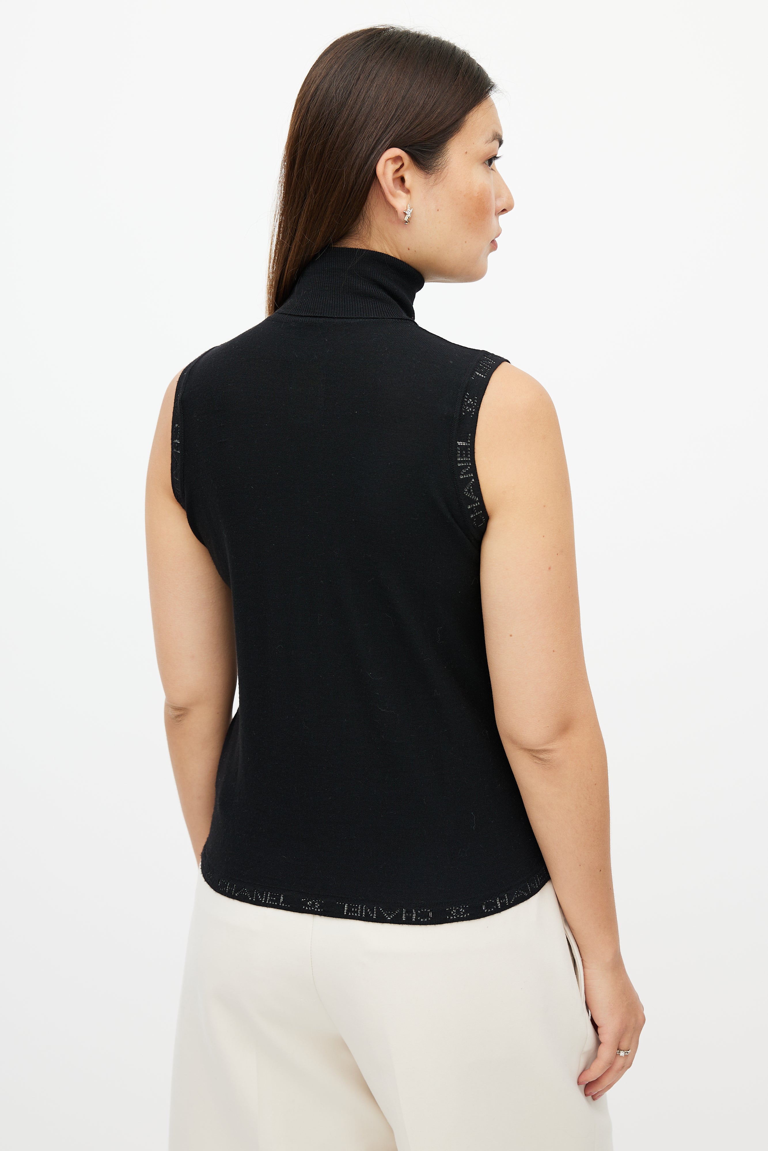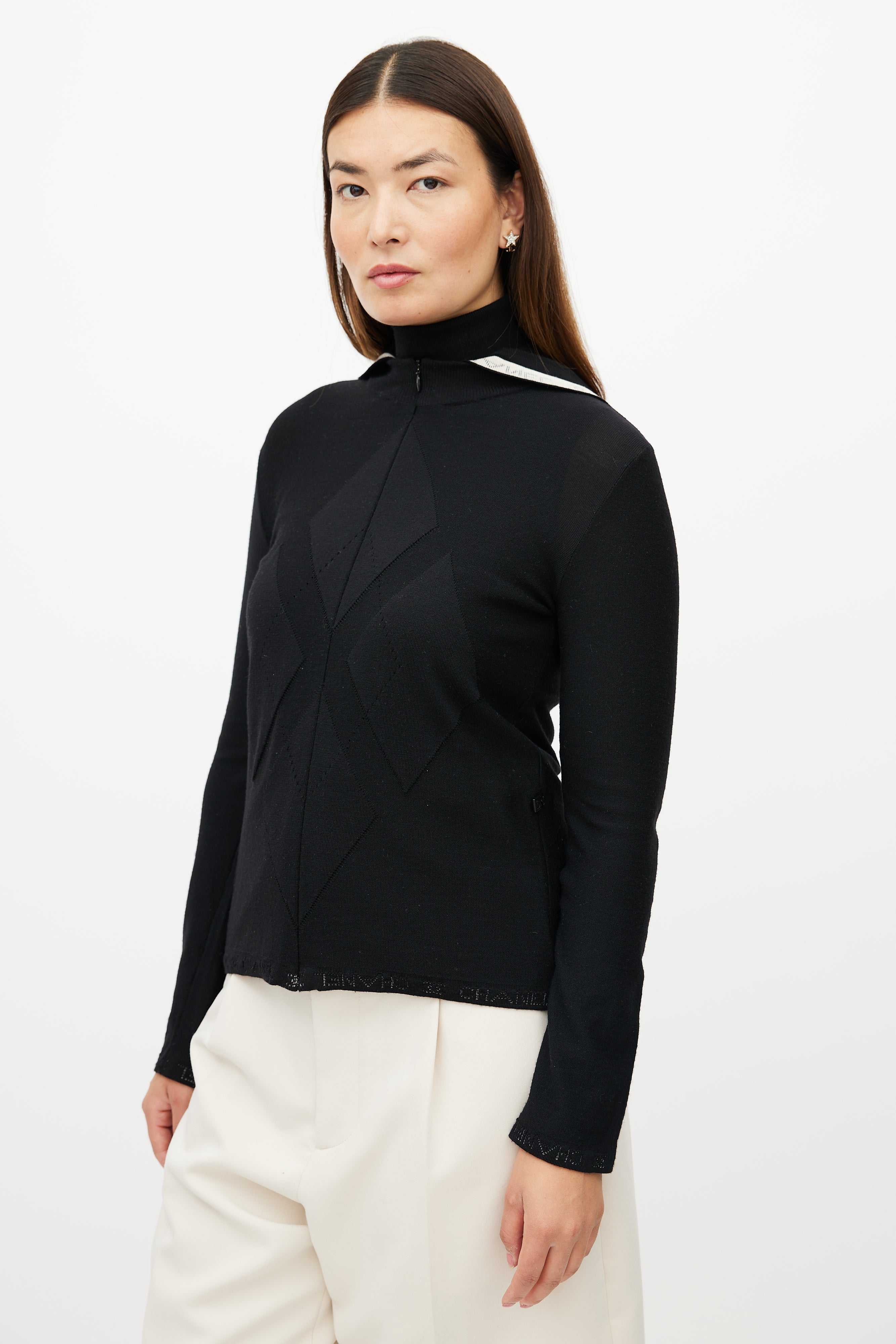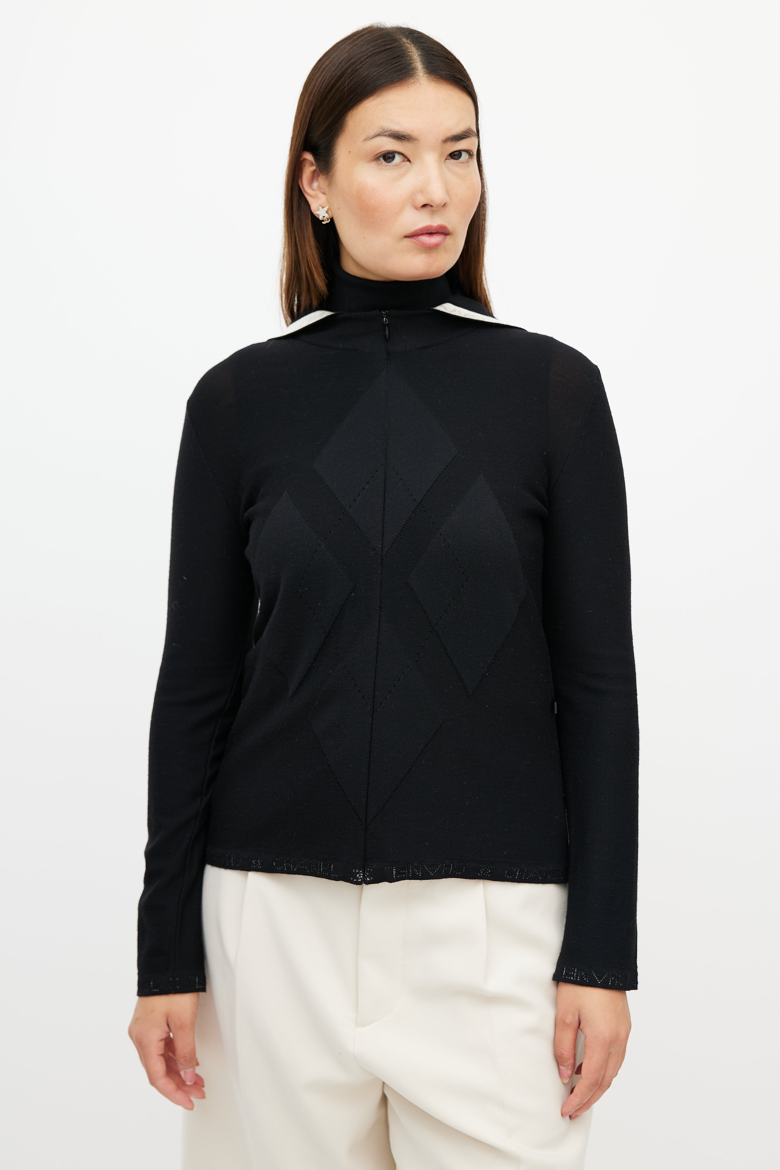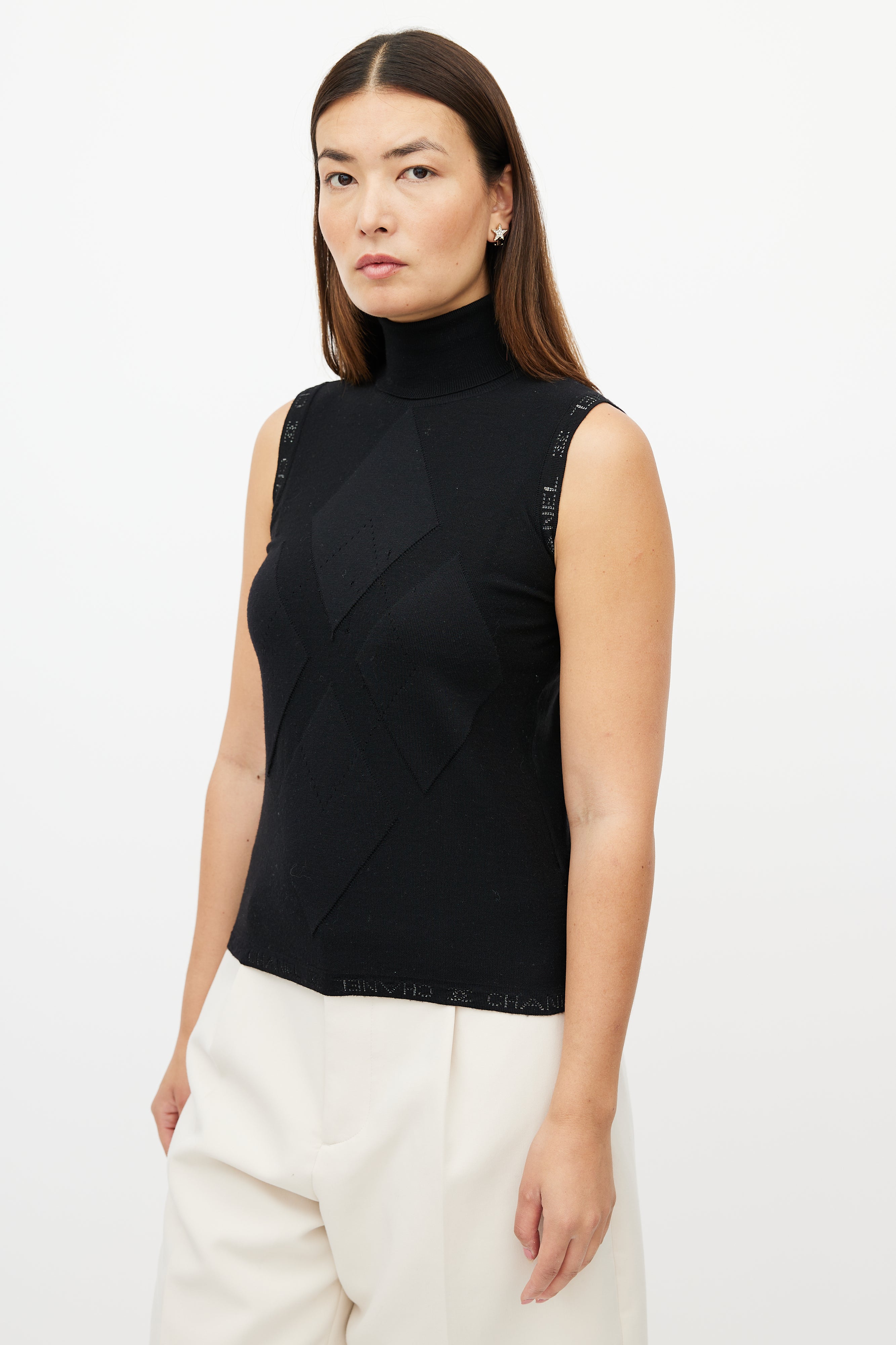 Pre-owned Fall/Winter 2007 Chanel black wool hoodie featuring an attached hood with woven logo trim, long sleeves, two zip pockets at hip, tonal argyle weave at chest, and zip closure. Matching vest features a turtleneck, sleeveless styling with woven logo trim, tonal argyle weave at chest, and ribbed logo hem.