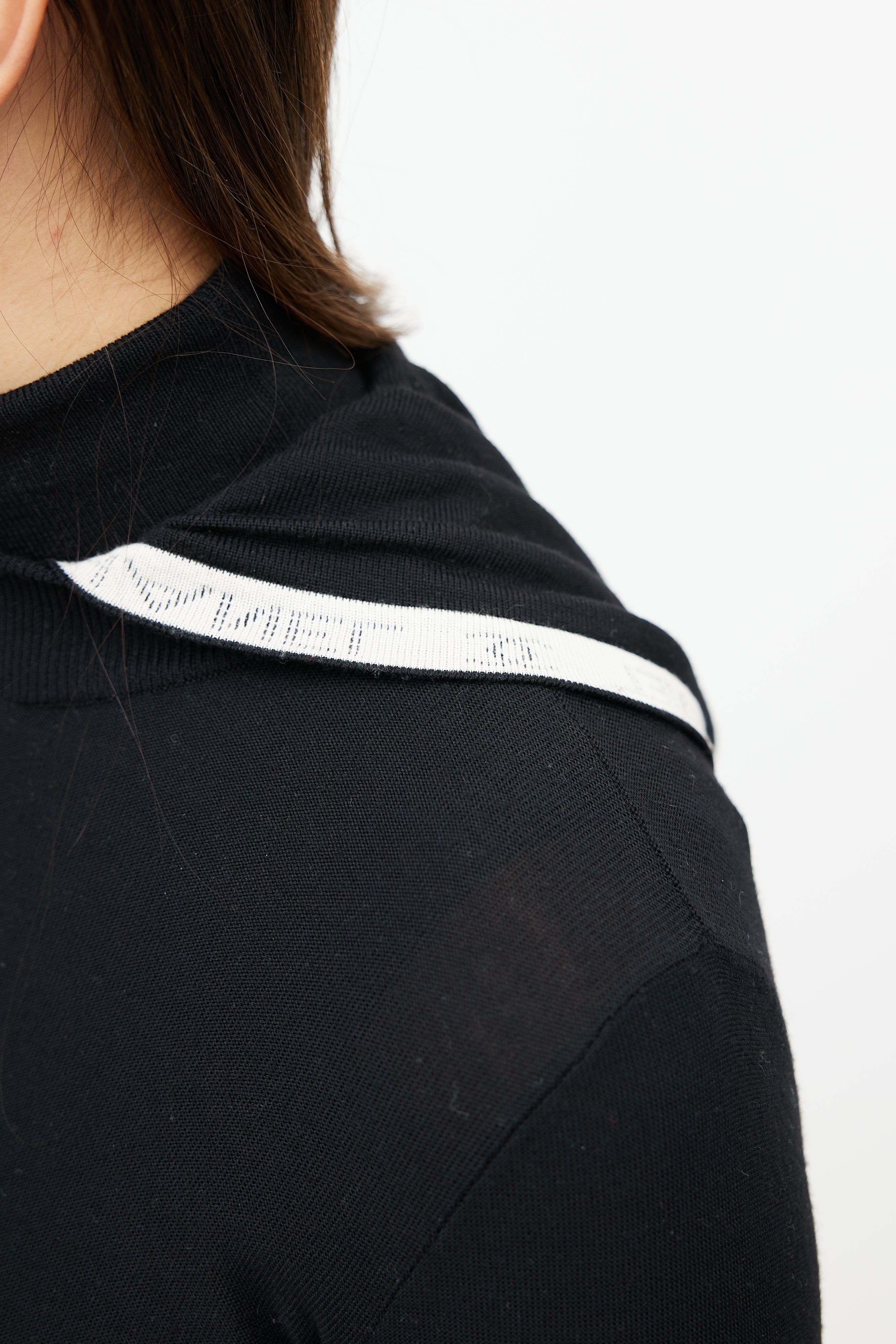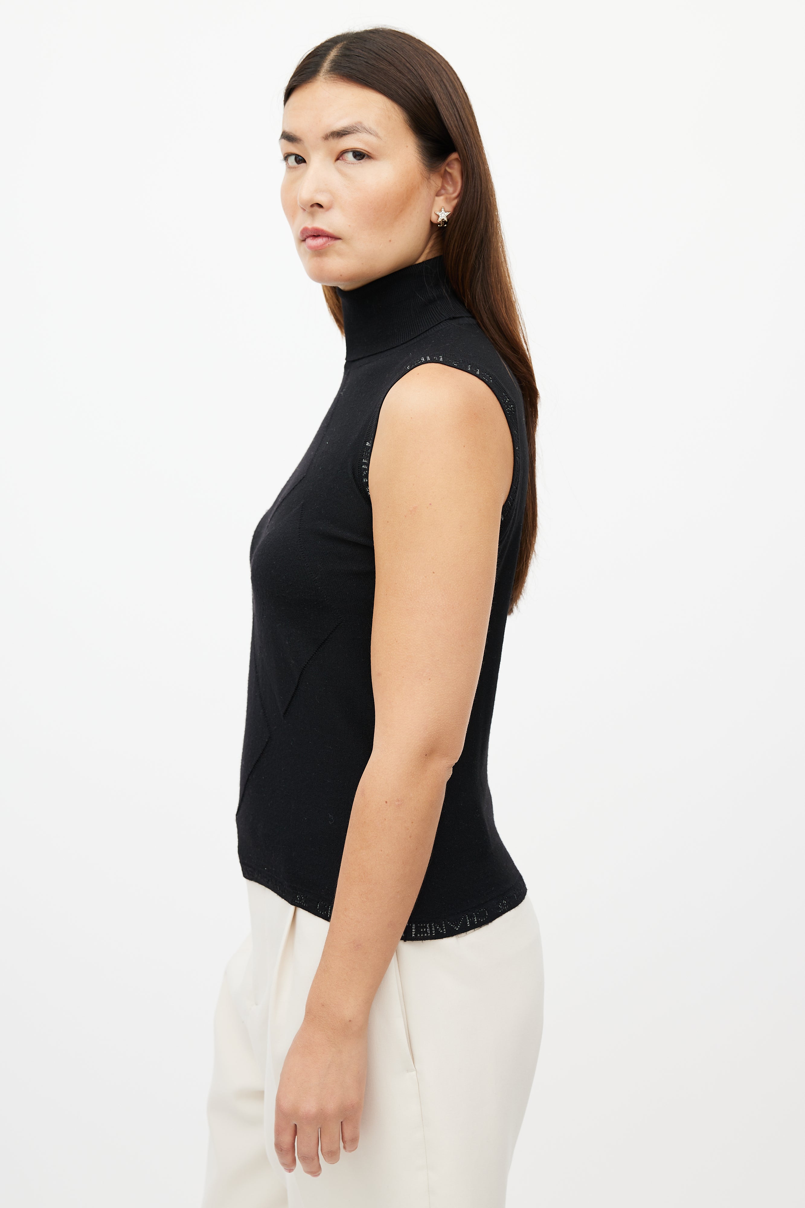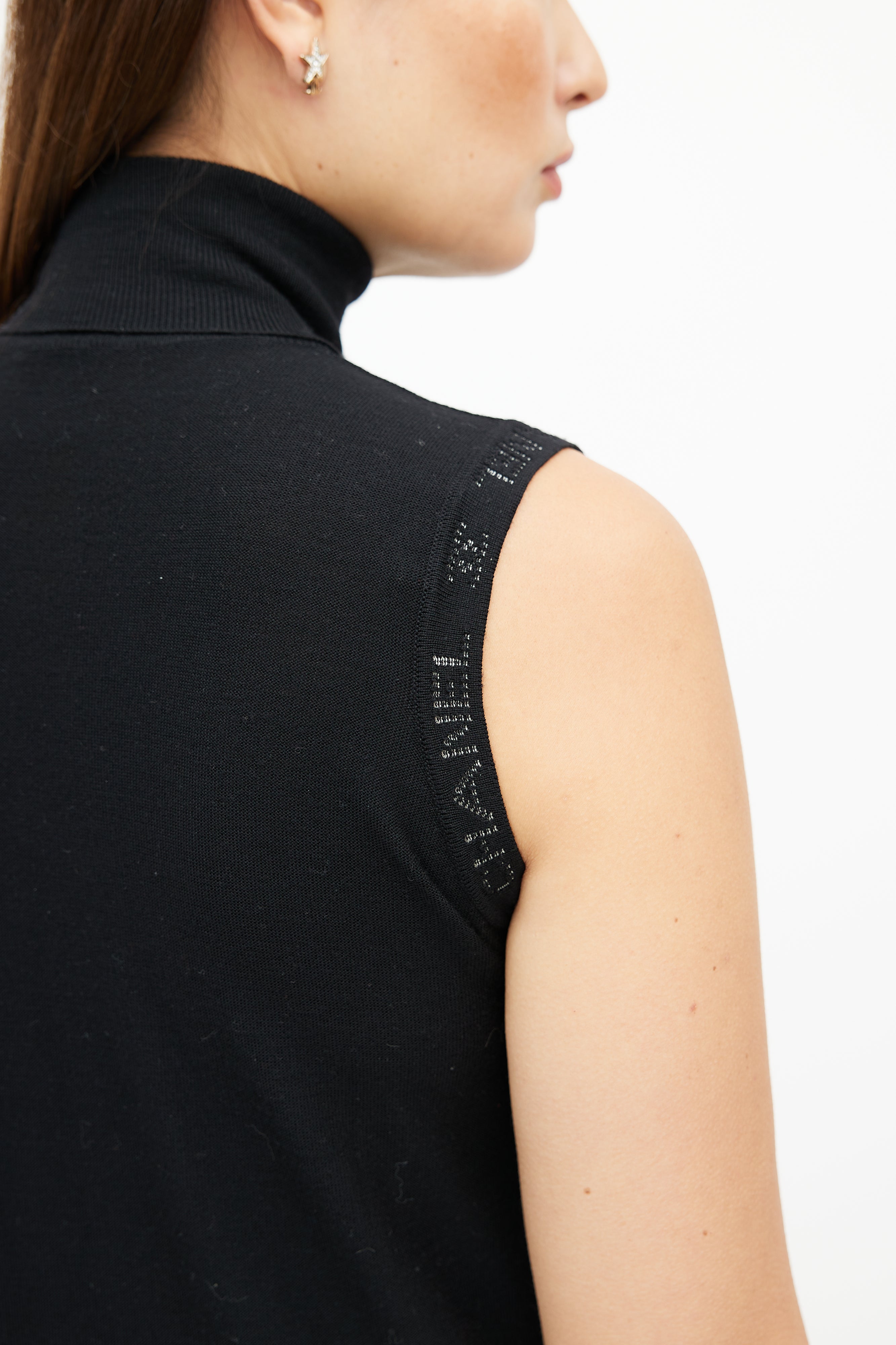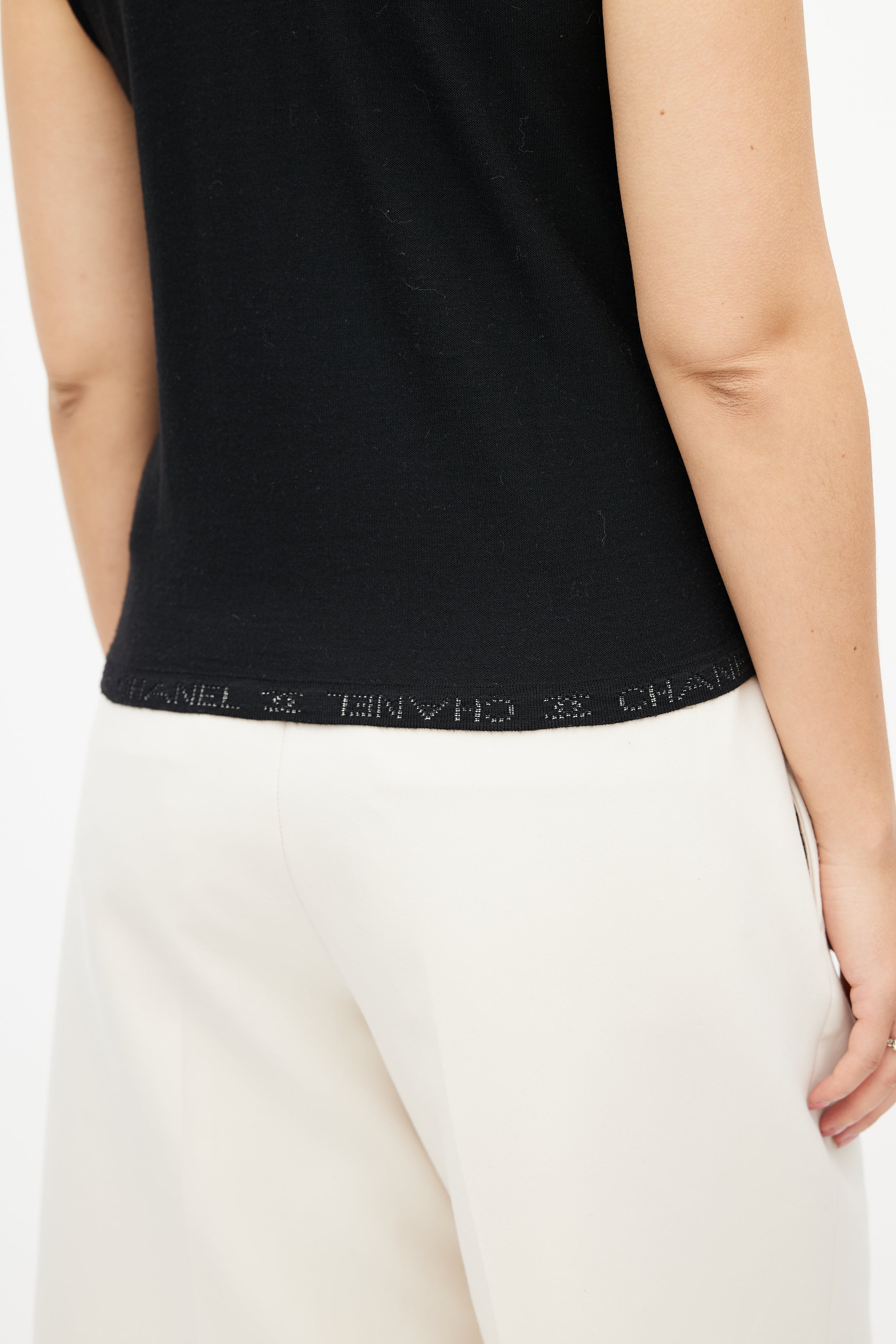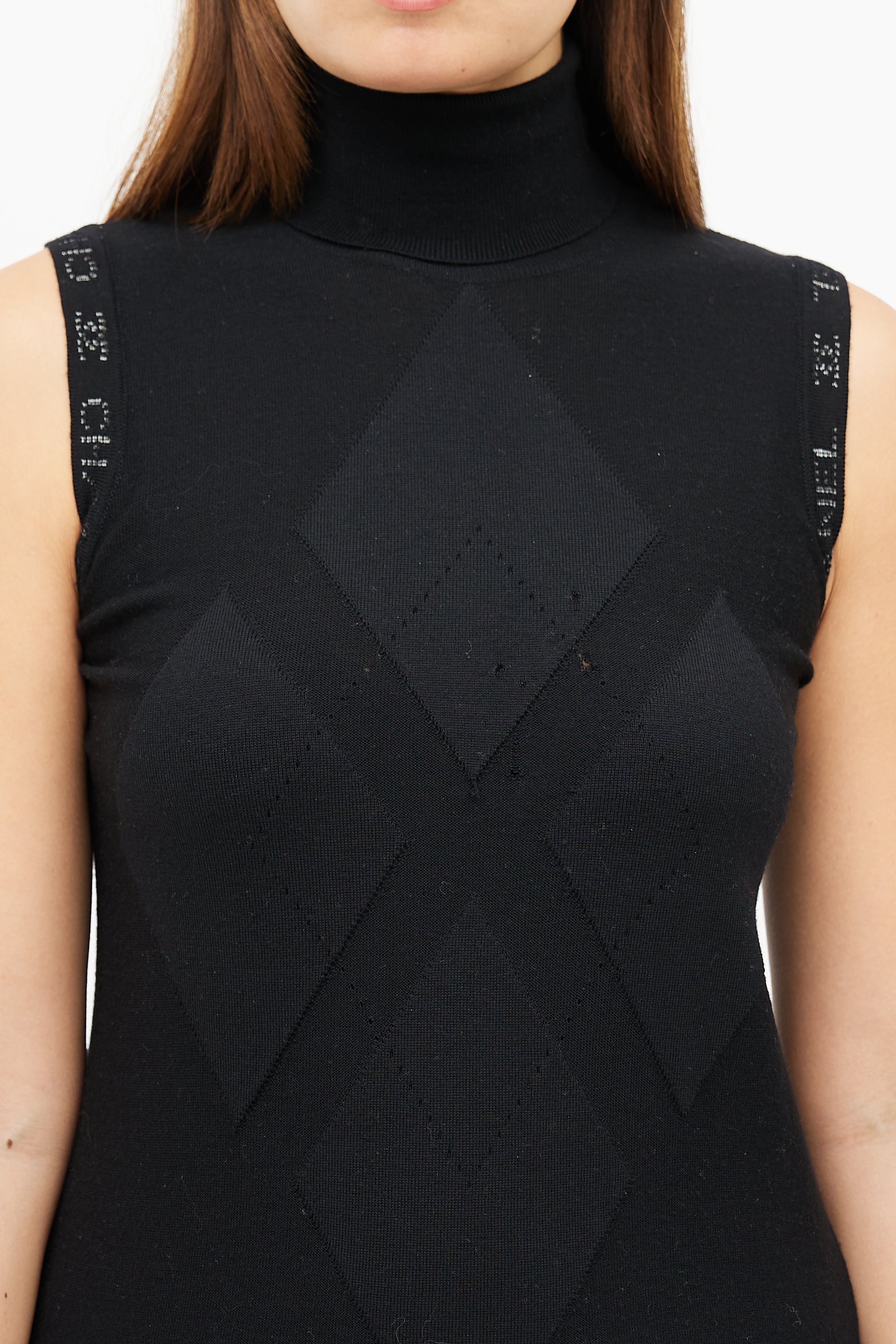 Pre-owned Fall/Winter 2007 Chanel black wool hoodie featuring an attached hood with woven logo trim, long sleeves, two zip pockets at hip, tonal argyle weave at chest, and zip closure. Matching vest features a turtleneck, sleeveless styling with woven logo trim, tonal argyle weave at chest, and ribbed logo hem.