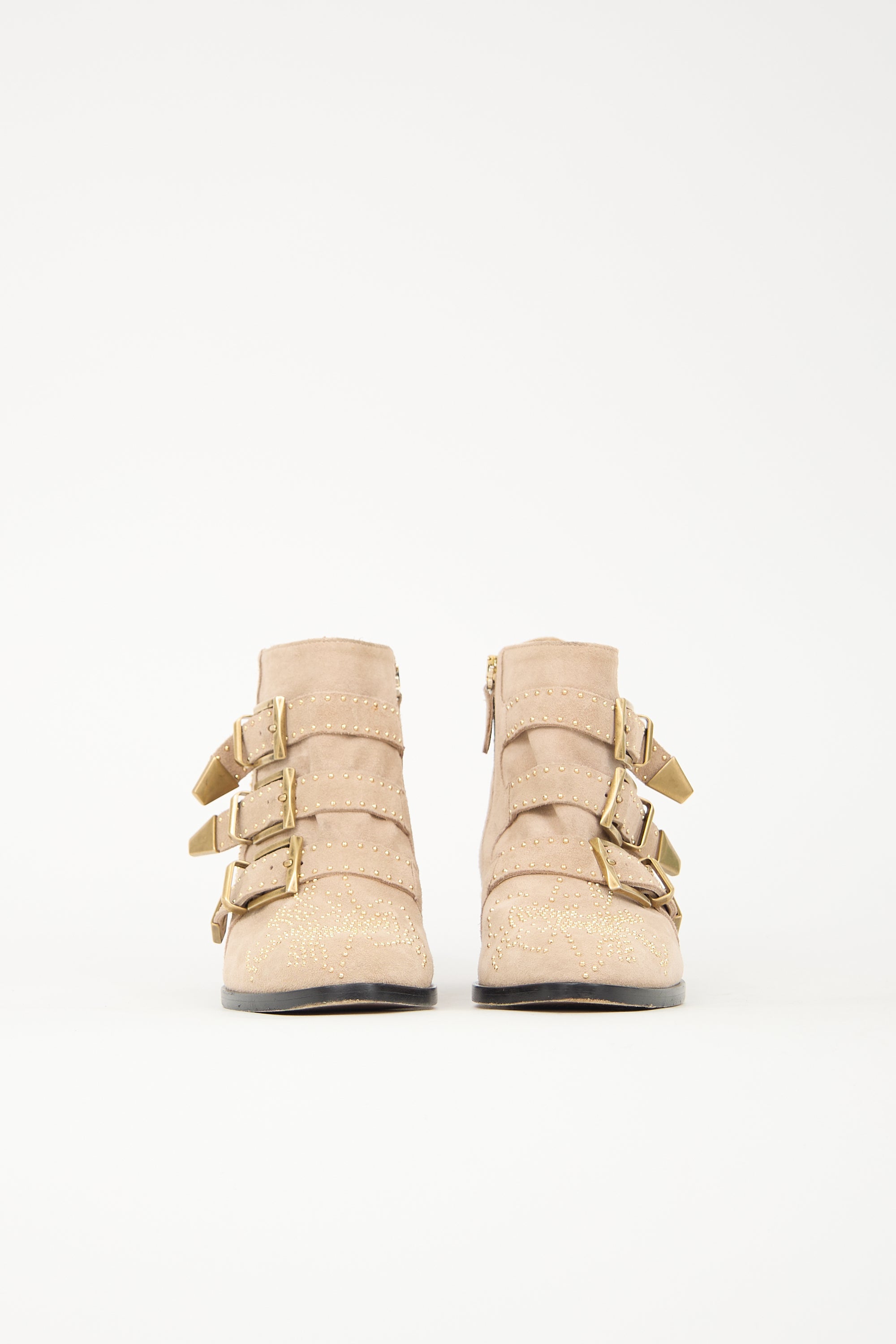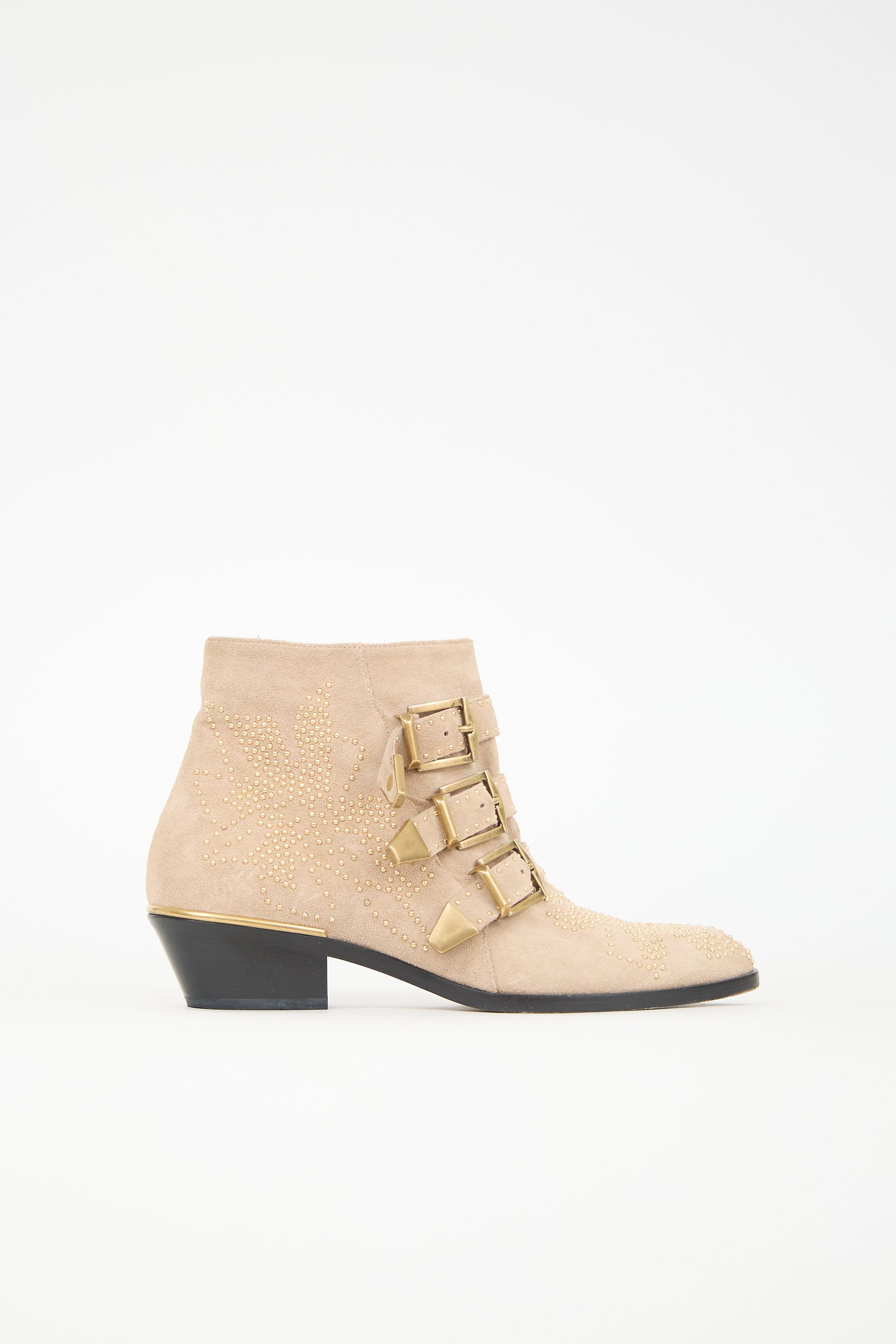 Pre-owned Chloé beige suede Susanna boots featuring pointed toe, gold tone stud embellishment, three buckled straps at front, inner side zip closure, gold tone accent at heel, and Cuban heel.
