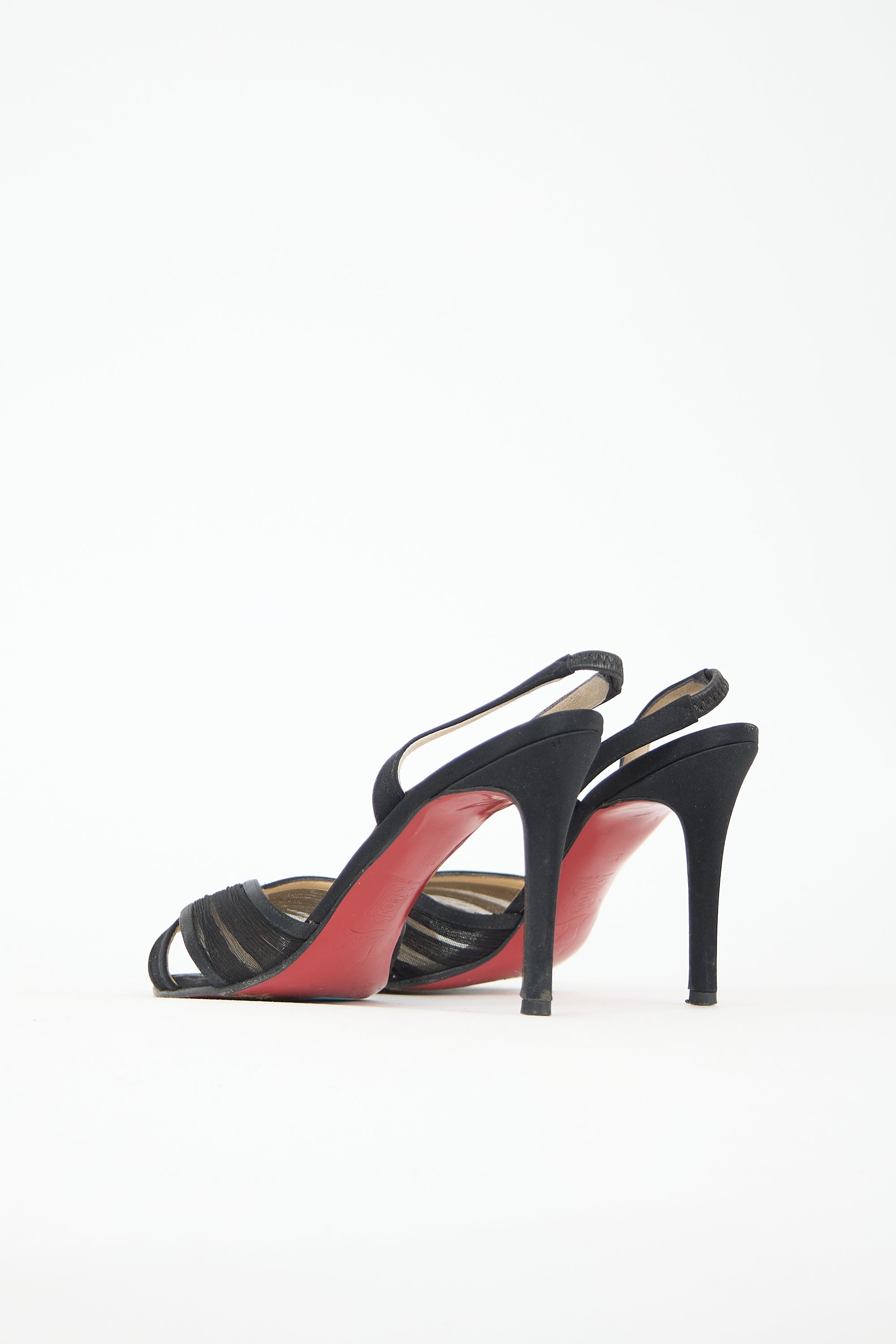 Pre-owned Christian Louboutin black Mauresmo heels featuring almond peep toe, pleated chiffon upper, criss cross vamp, elasticized slingback strap, covered stiletto heel, and signature red lacquered outsole.
