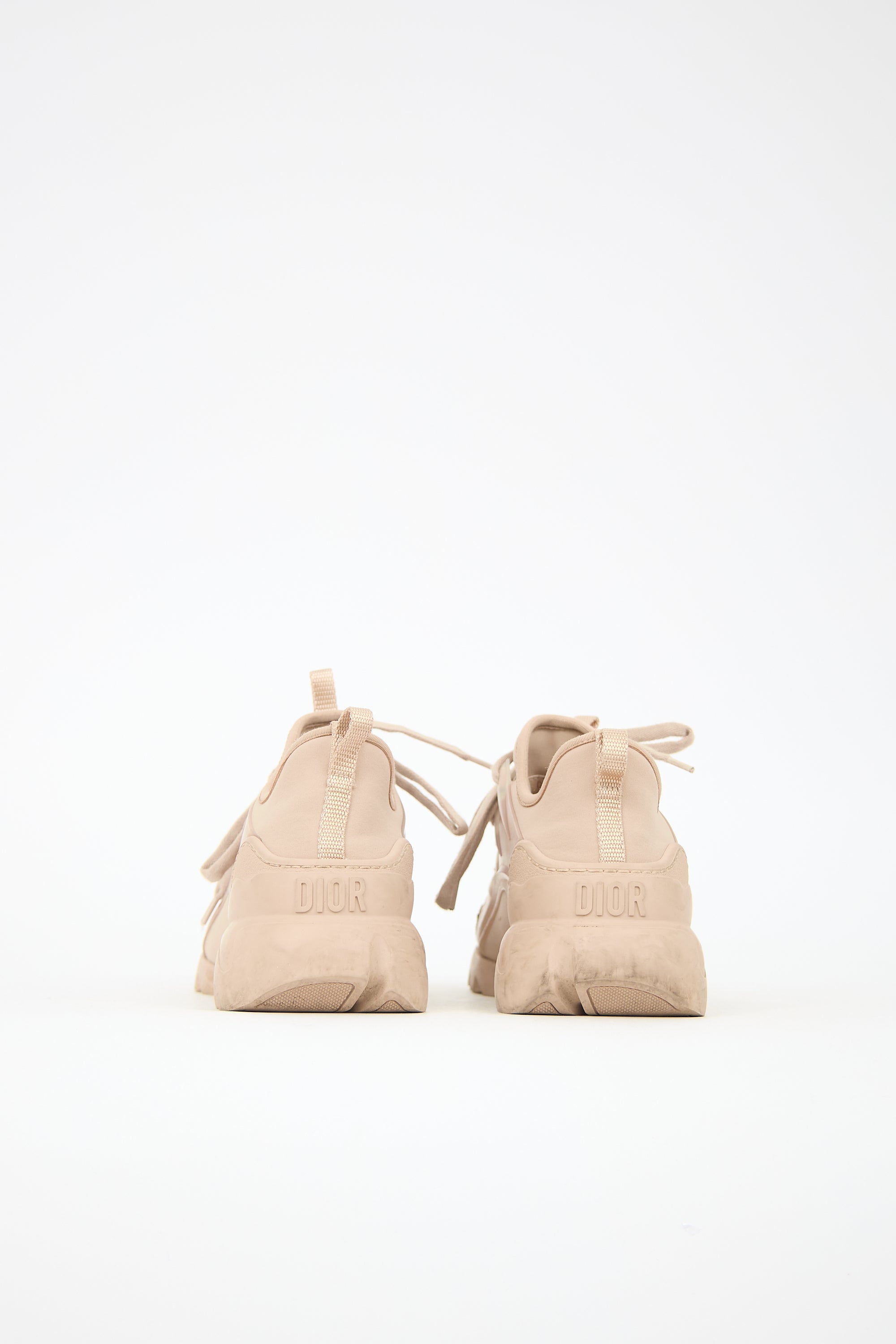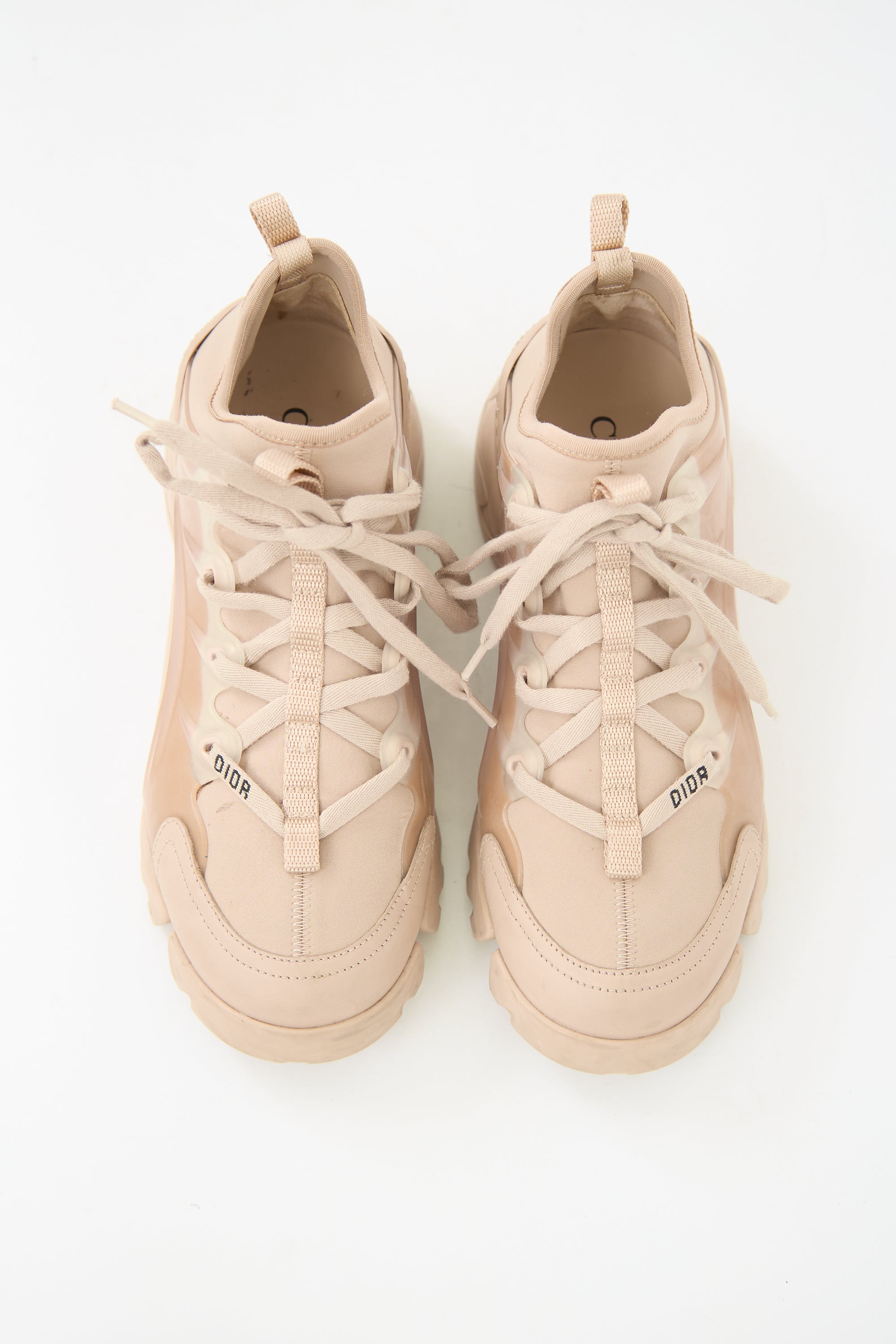 Pre-owned Dior beige D-Connect sneakers featuring rounded toe, lace up vamp with embroidered logo, rubber panels, pull tabs at front and back collar, embossed logo at heel, and tonal rubber split sole.