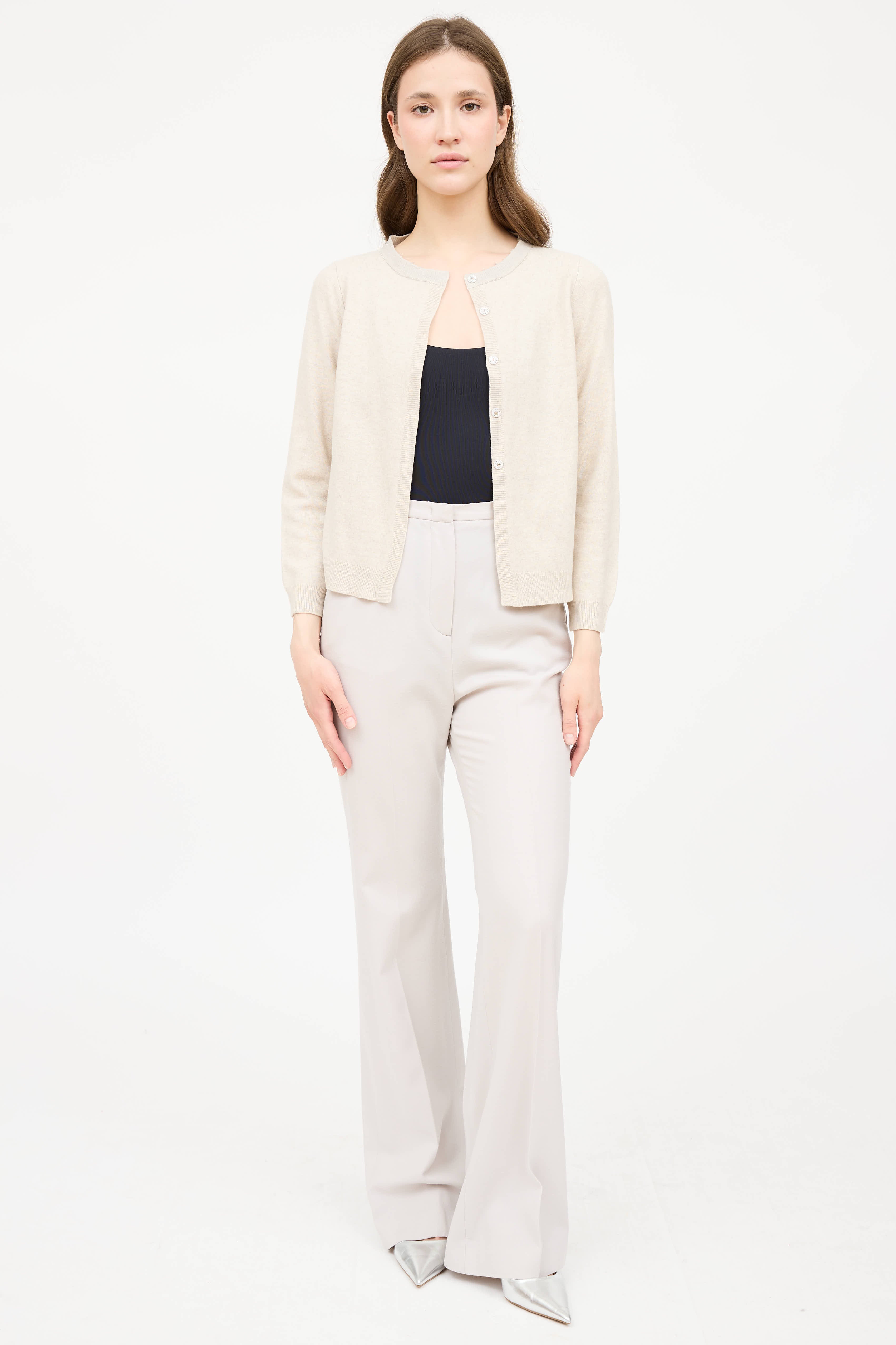Pre-owned Fabiana Filippi beige long sleeve cardigan featuring round neckline with beaded trim detail, concealed snap button closure, and ribbed collar, hemline and cuffs.