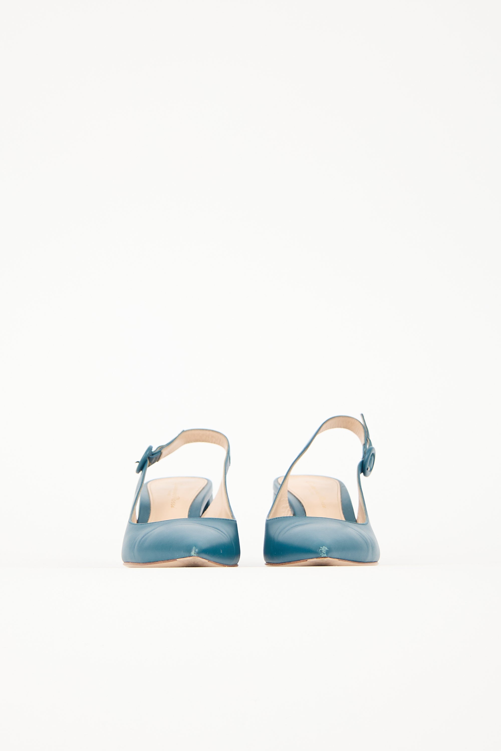 Pre-owned Gianvito Rossi blue leathre Camila heels featuring a pointed toe, adjustable slingback strap, and covered block heel. Comes with original box and dust bag.