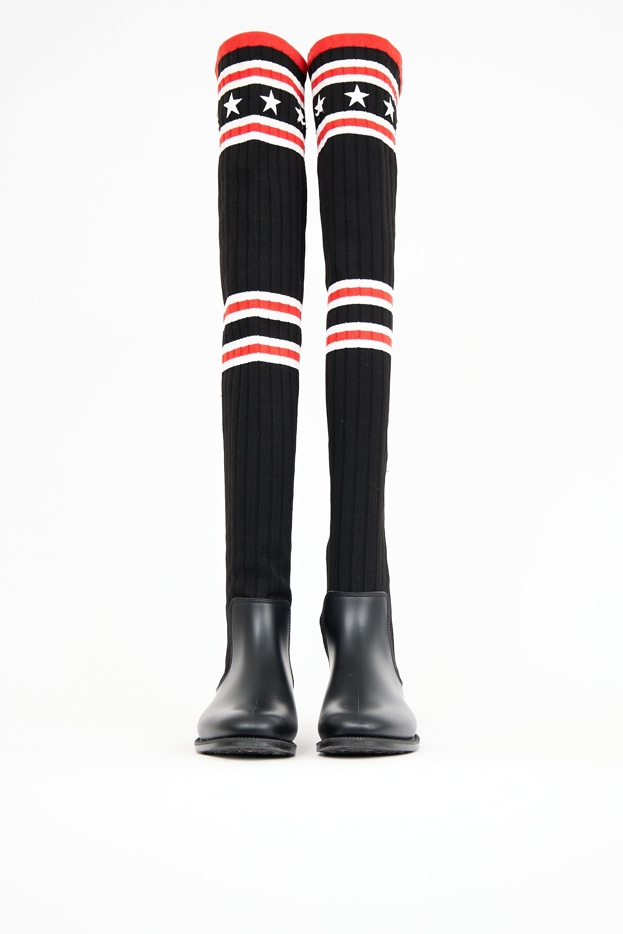 Pre-owned Givenchy black thigh high boot featuring a rounded toe, ribbed knit shaft, red and white stripes at thigh and calf, white star decals at thigh, rubber chelsea style foot, and small heel.