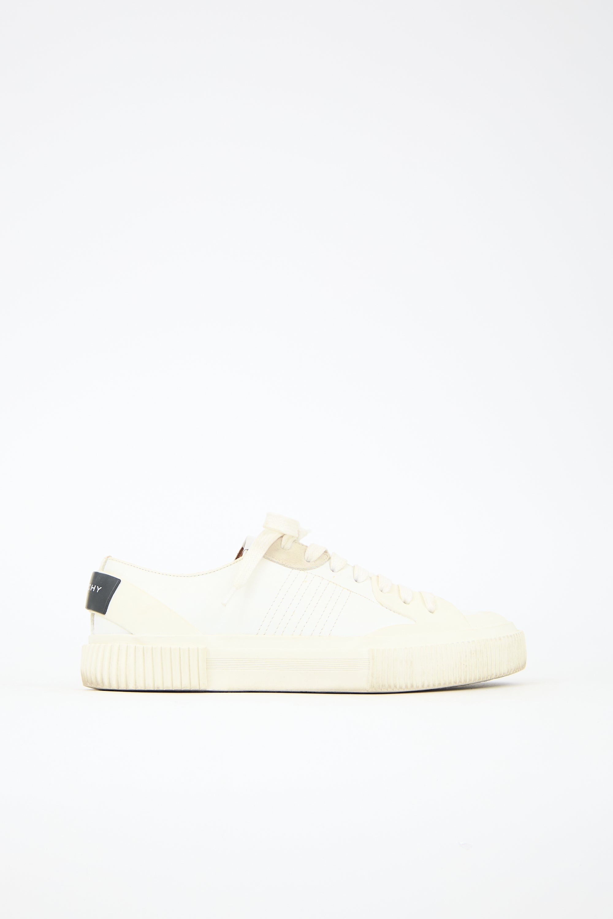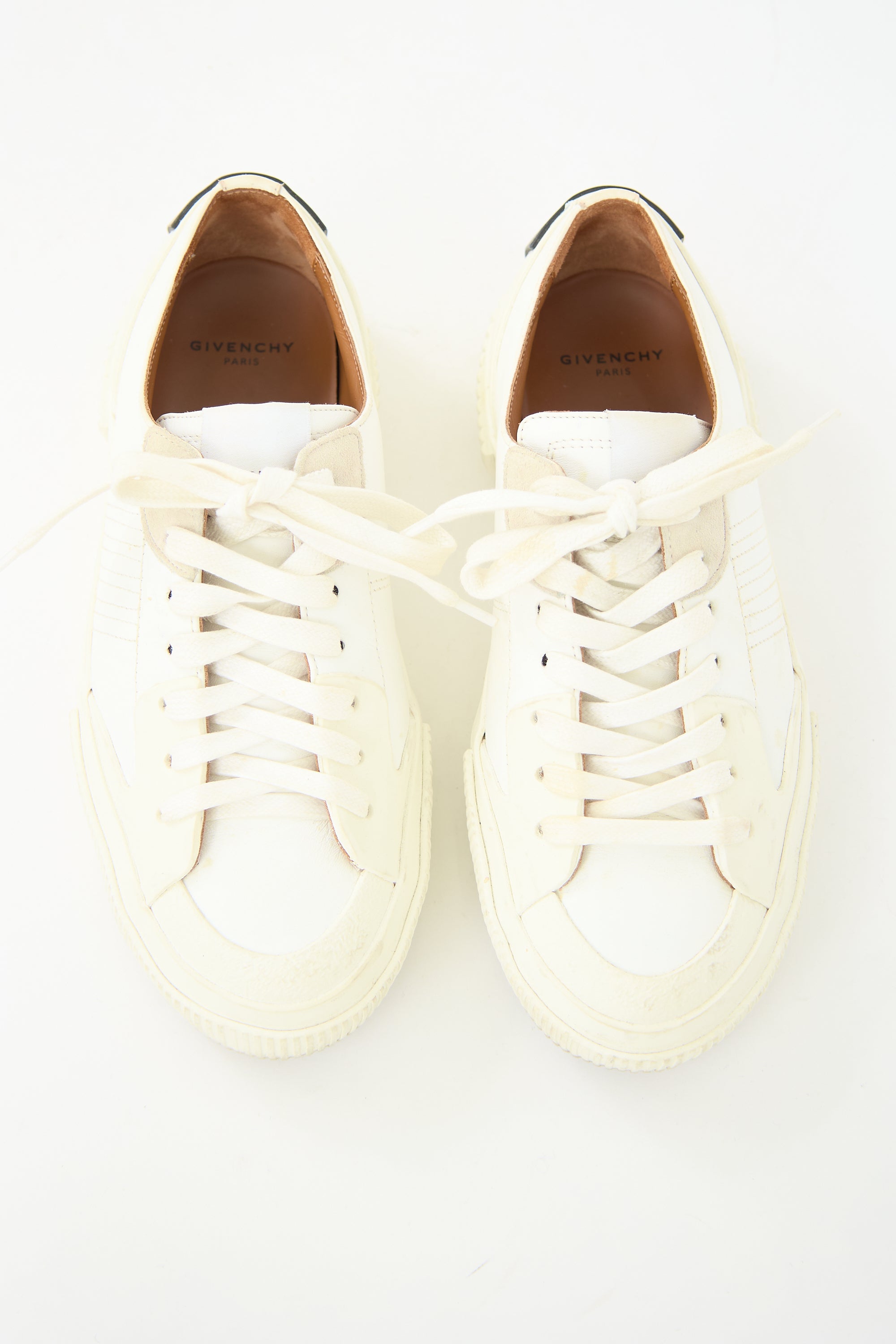 Pre-owned Givenchy white leather Tennis Light low top sneakers featuring rounded toe, lace up vamp, suede eyestay panel, printed logo at tongue, black rubber logo tab at counter, and ribbed rubber sole. Comes with original dust bags.