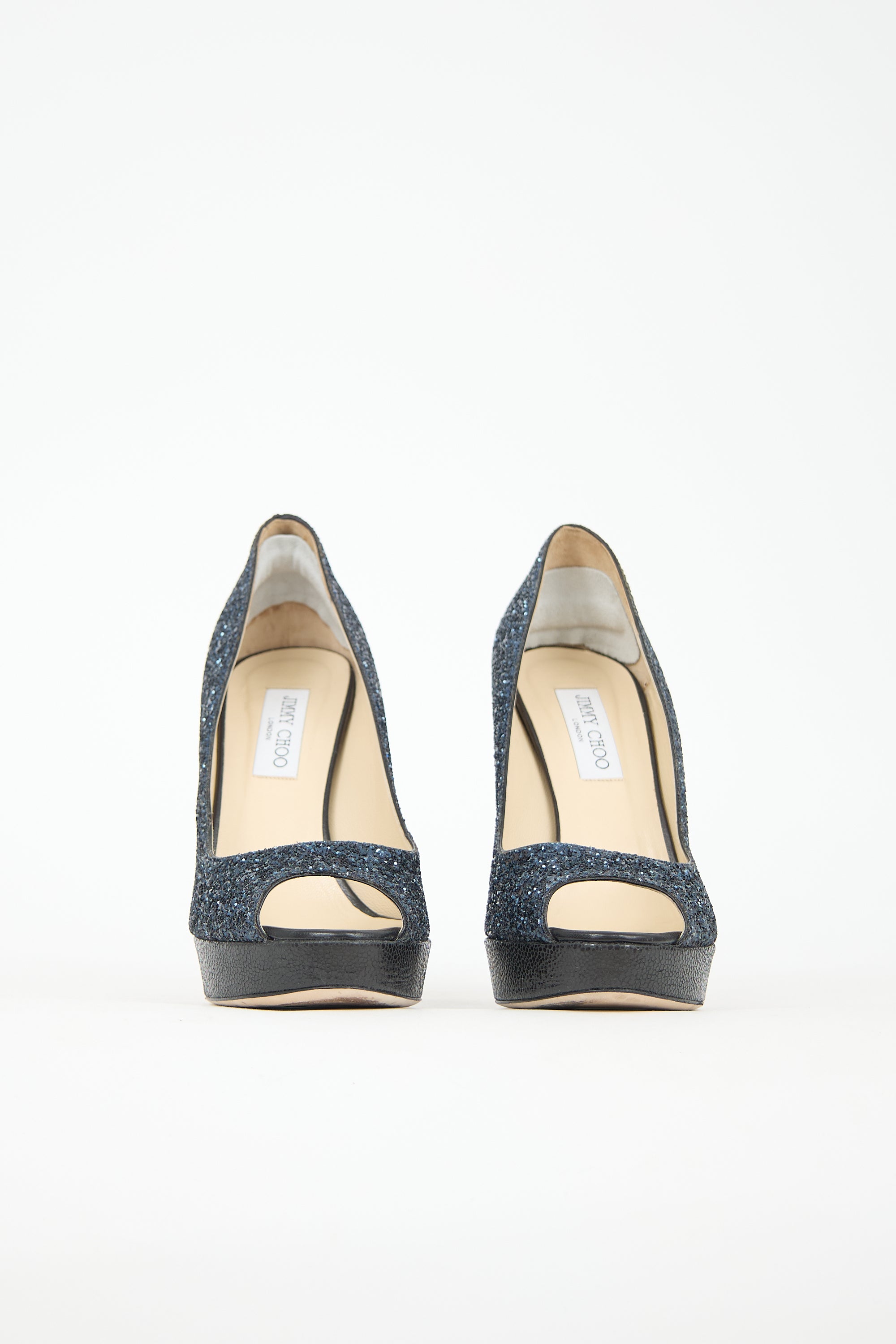 Pre-owned Jimmy Choo navy heels featuring rounded peep toe, glitter upper, and black embossed leather platform and stiletto heel.