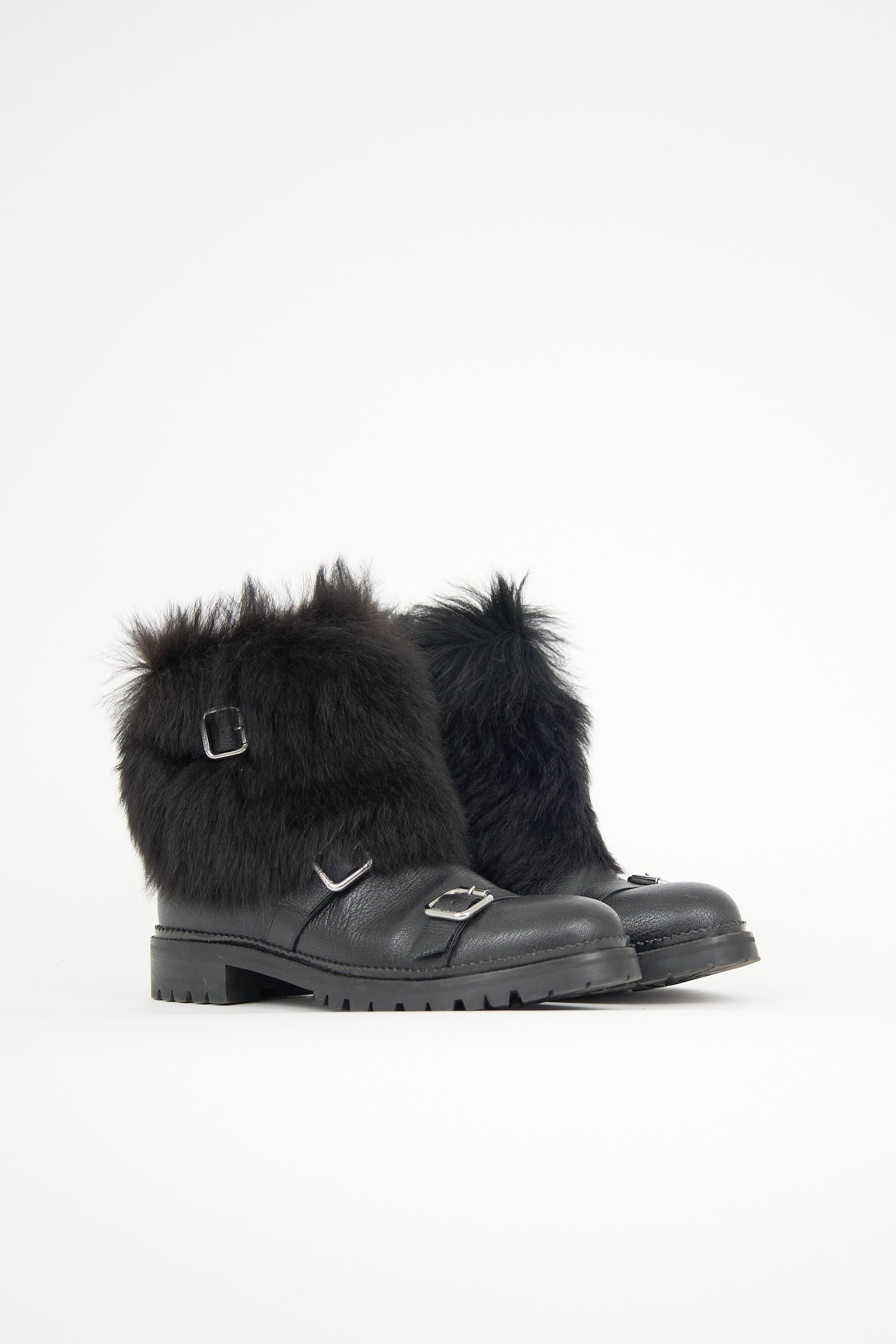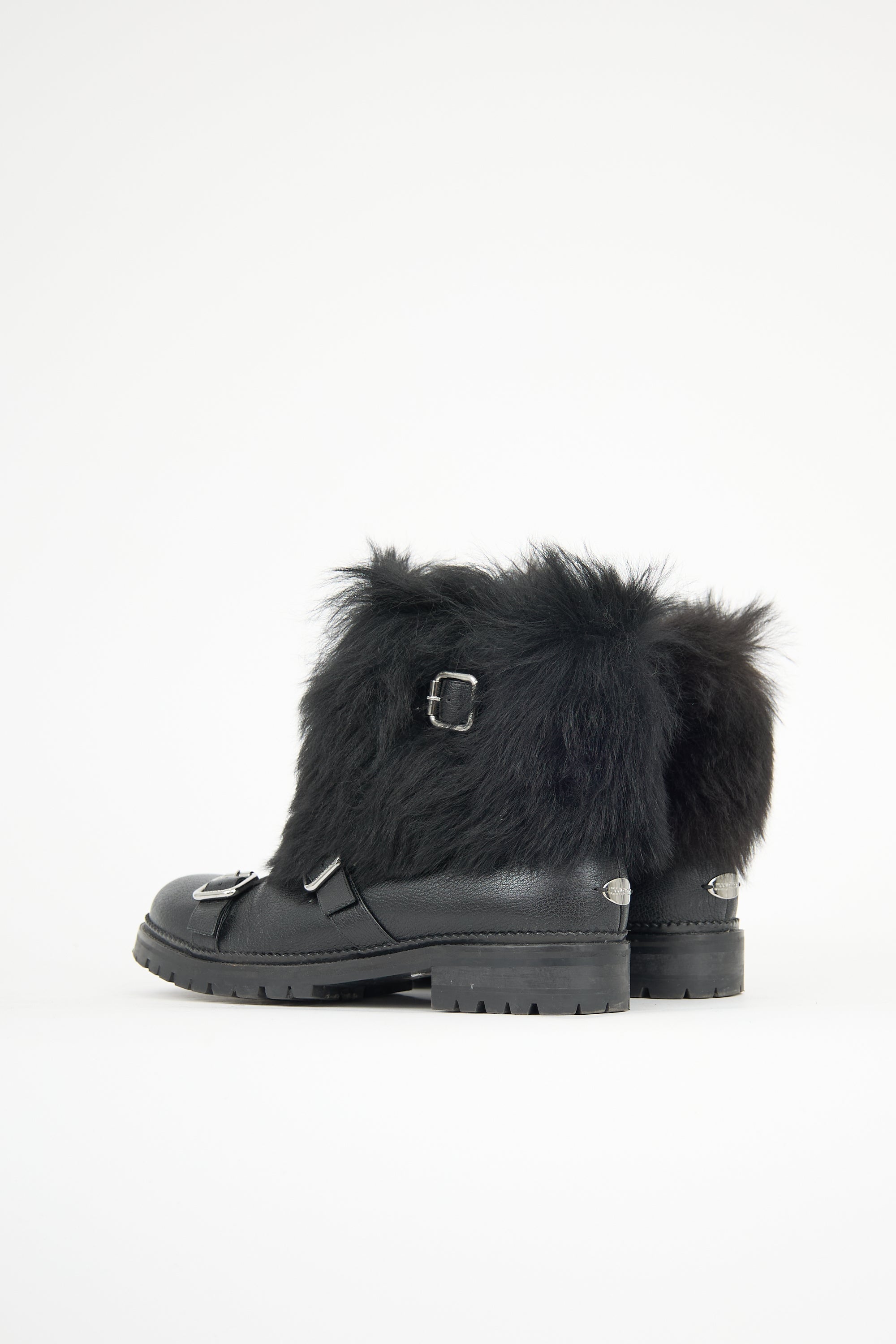 Pre-owned Jimmy Choo black leather and faux fur Hank biker boots featuring rounded toe, triple buckle design, inner side zip closure, silver tone logo plaque at heel, and treaded rubber sole.