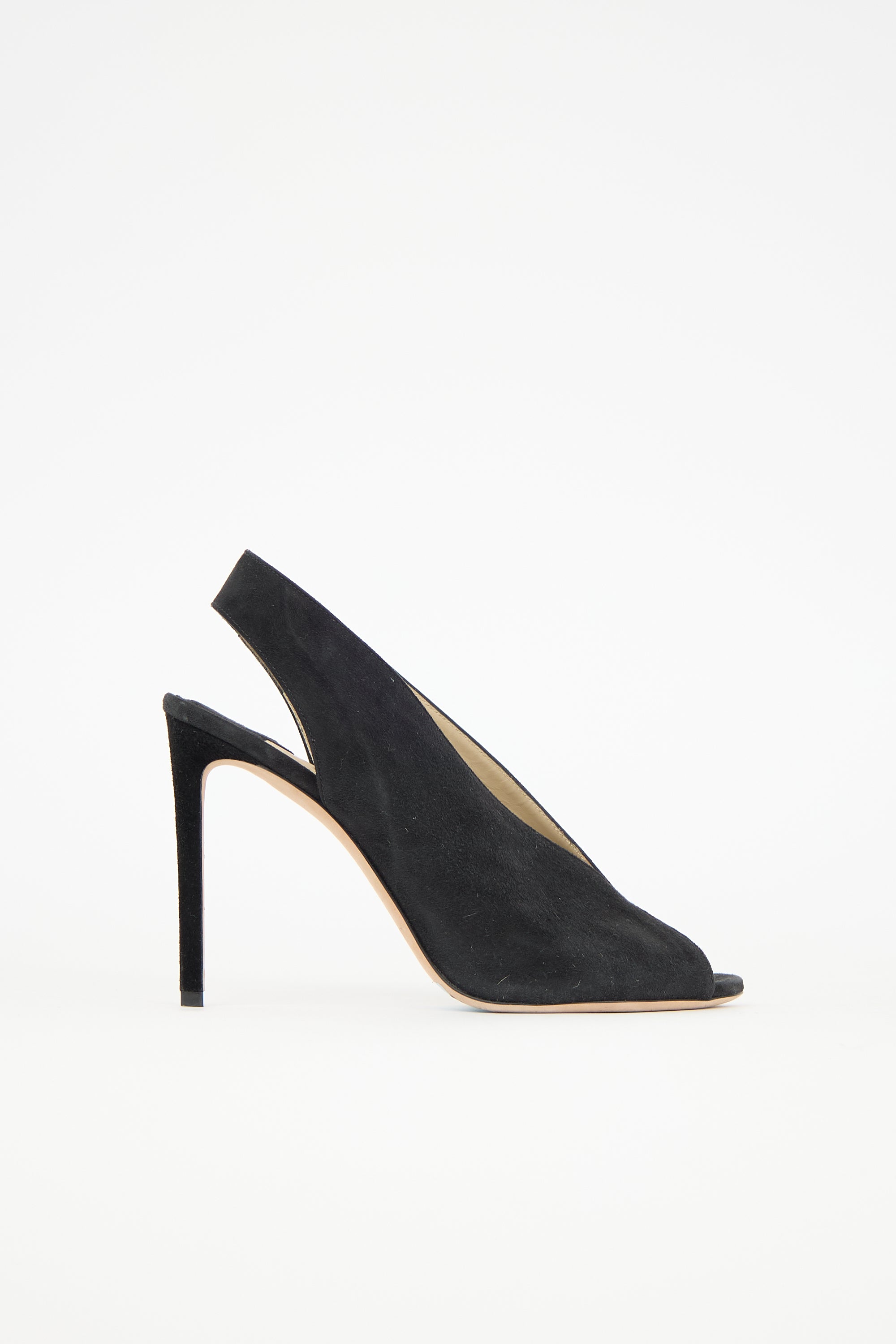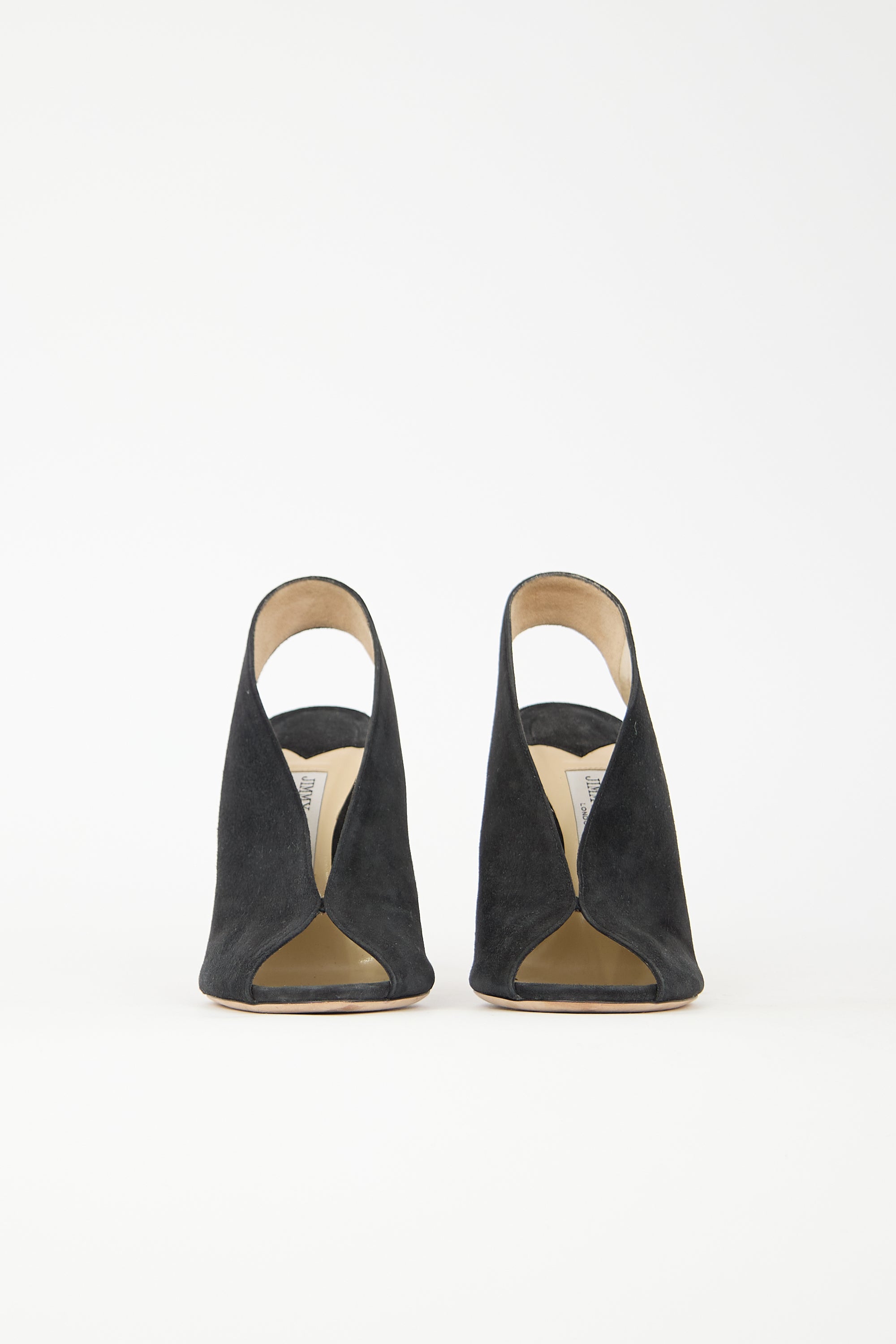 Pre-owned Jimmy Choo black suede Shar heels featuring rounded peep toe, V-cut topline, slingback strap, and covered stiletto heel.